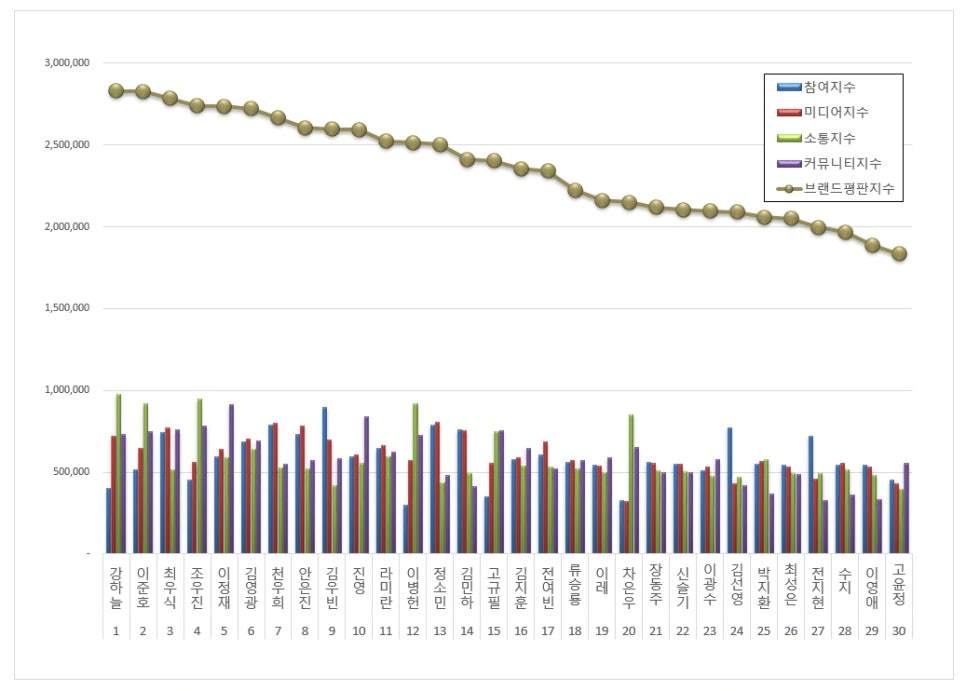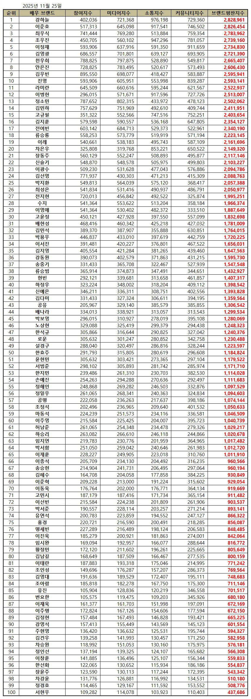 2025年11月演员(电视剧、电影、OTT)品牌评价Top301-10名:姜河那、李俊昊、崔宇植、赵宇镇、李政宰、金英光、千玗嬉、安恩真、金宇彬、郑振永11-20名:罗美兰、李秉宪、郑素敏、金敏荷、高圭弼、金志勋、全汝彬、柳承龙、李甄、车银优21-30名:张东柱、申瑟琪、李光洙、金善映、朴智焕、崔成恩、全智贤、裴秀智、李英爱、高允真