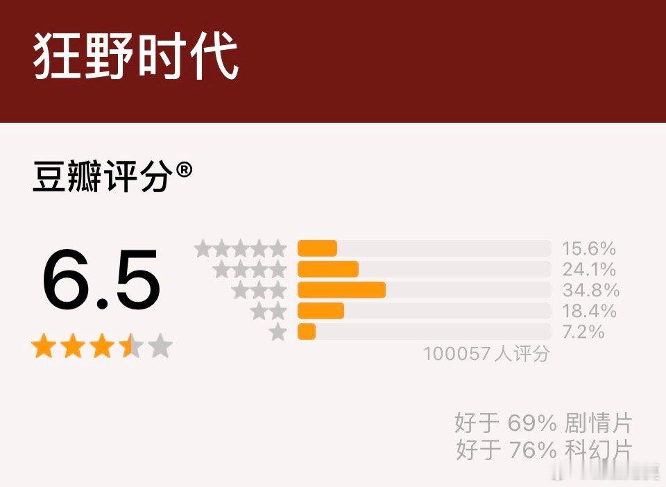 《狂野时代》豆瓣打分人数已经破10万啦。不过豆瓣评分依旧为开分时的6.5分。稳稳