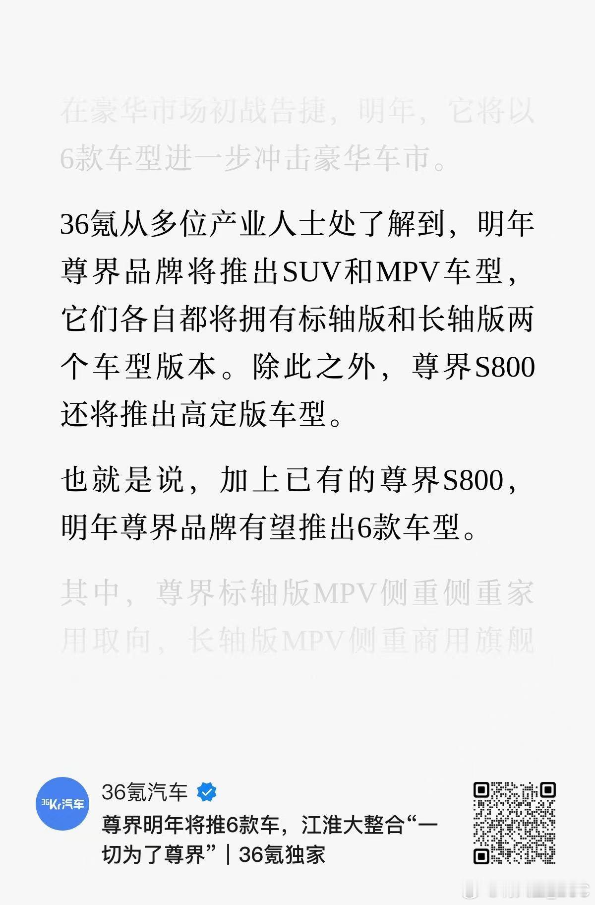 加上已有的尊界S800,明年尊界品牌有可能有6款车:长轴版SUV:树立品牌形象短轴版SUV:负责走量标轴版MPV:家用长轴版MPV:商用旗舰以及高定版车型两版MPV的市场价格,会远远高于家用及商用MPV市场现有的代表车型。两款SUV同样面向高端市场,但其定位将低于尊界S800。看尊界和问界之前的销量就知道,华为在高端市场很有一套,技术实力也够硬。明年尊界的产品线越来越全,相信在销量上也会有不小的变化。