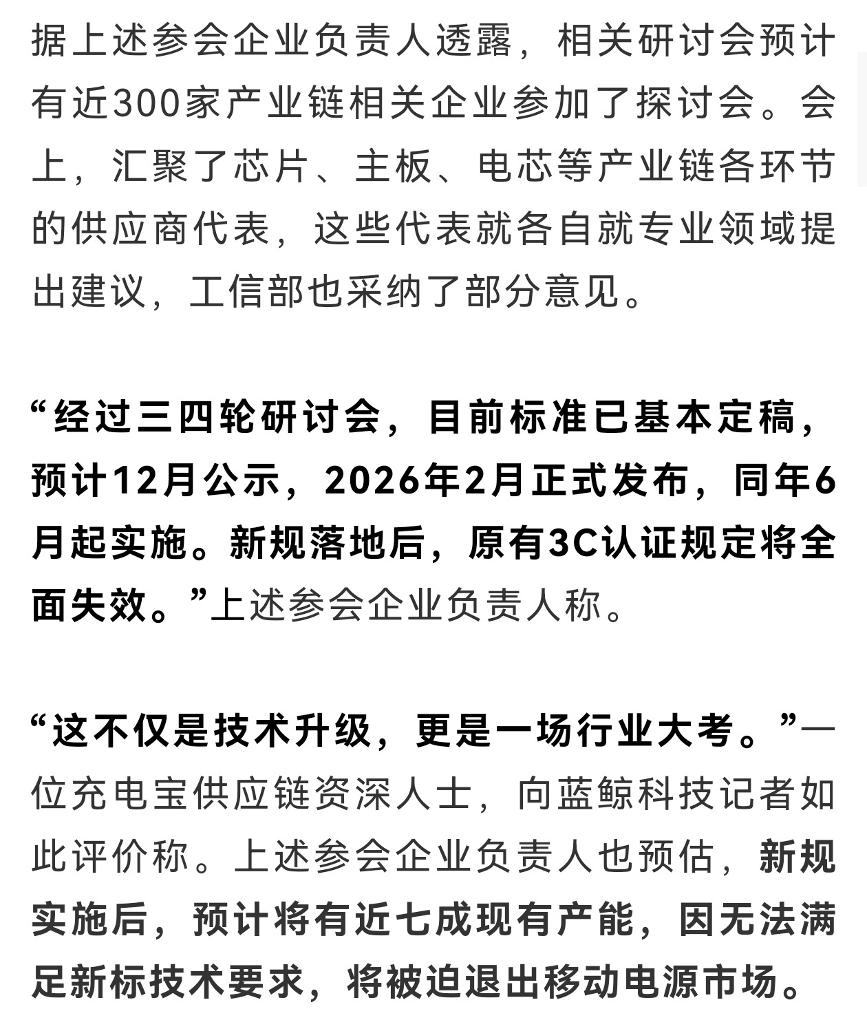据媒体报道,工信部将于12月对《移动电源安全技术规范》进行公示,2026年2月正式发布,同年6月起强制执行,届时现行3C认证规则同步全面失效。这意味着,从2026年6月开始,所有新投产的充电宝必须拿到“新国标”证书才能上市,而仅持有旧版3C认证的型号将不得继续销售。随着充电宝“新国标”的发布、落地,充电宝涨价将成为必然,同时将淘汰大量不符合新规标准的移动电源。在新规落地的半年窗口期,市面上预计会有大量旧款产品,以低价促销进行清库存,但消费者购买后是否方便出差携带,需要打个问号。目前,旧款充电宝尤其没有3C认证的产品,大量充斥于礼品市场,换个精美包装,或放在礼品盒里,以伴手礼形式进行销售,同样被“充数”的,还有早已不在用户使用习惯里的U盘。从相关报道来看,新标对电芯、电路板、整机外壳提出更严苛的测试与溯源要求,约七成低端产能预计会被强制退出,为满足更高检测、改造和物料成本,业内估算制造端成本上涨约30%,终端零售价大概率同步上涨。