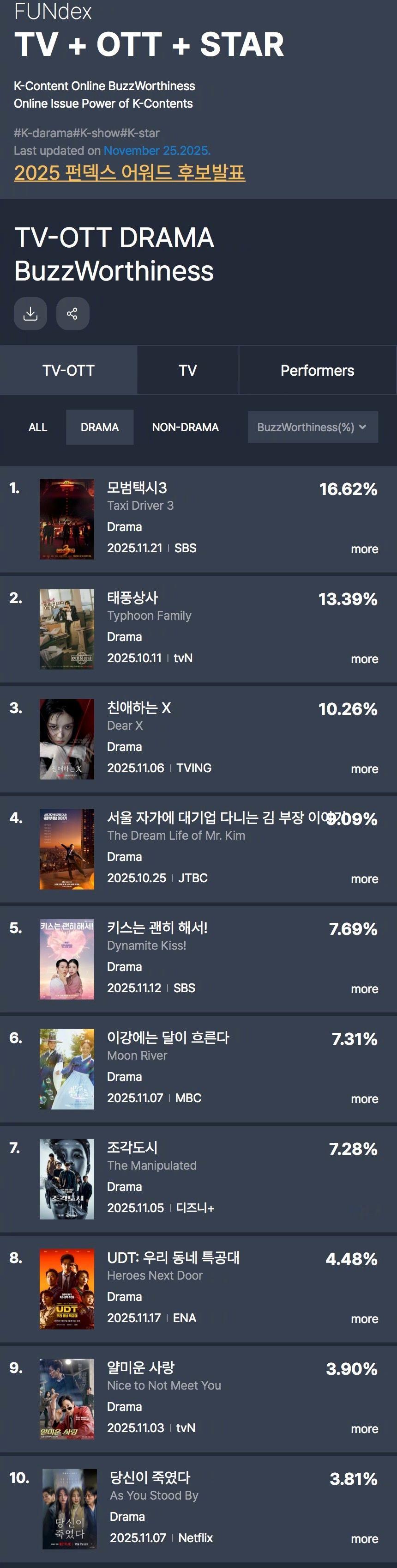 GOODDATA公布2025年11月第3周TV-OTT热度话题性排行。1. 16.62%2. 13.39% 3. 10.26%4. 5. 6. 7. 8. 9. 10. GOODDATA公布2025年11月第3周电视剧热度话题性排行。1. 22.03%2. 17.74%3. 12.05%4. 5. 6. 7. 8. 9. 10.