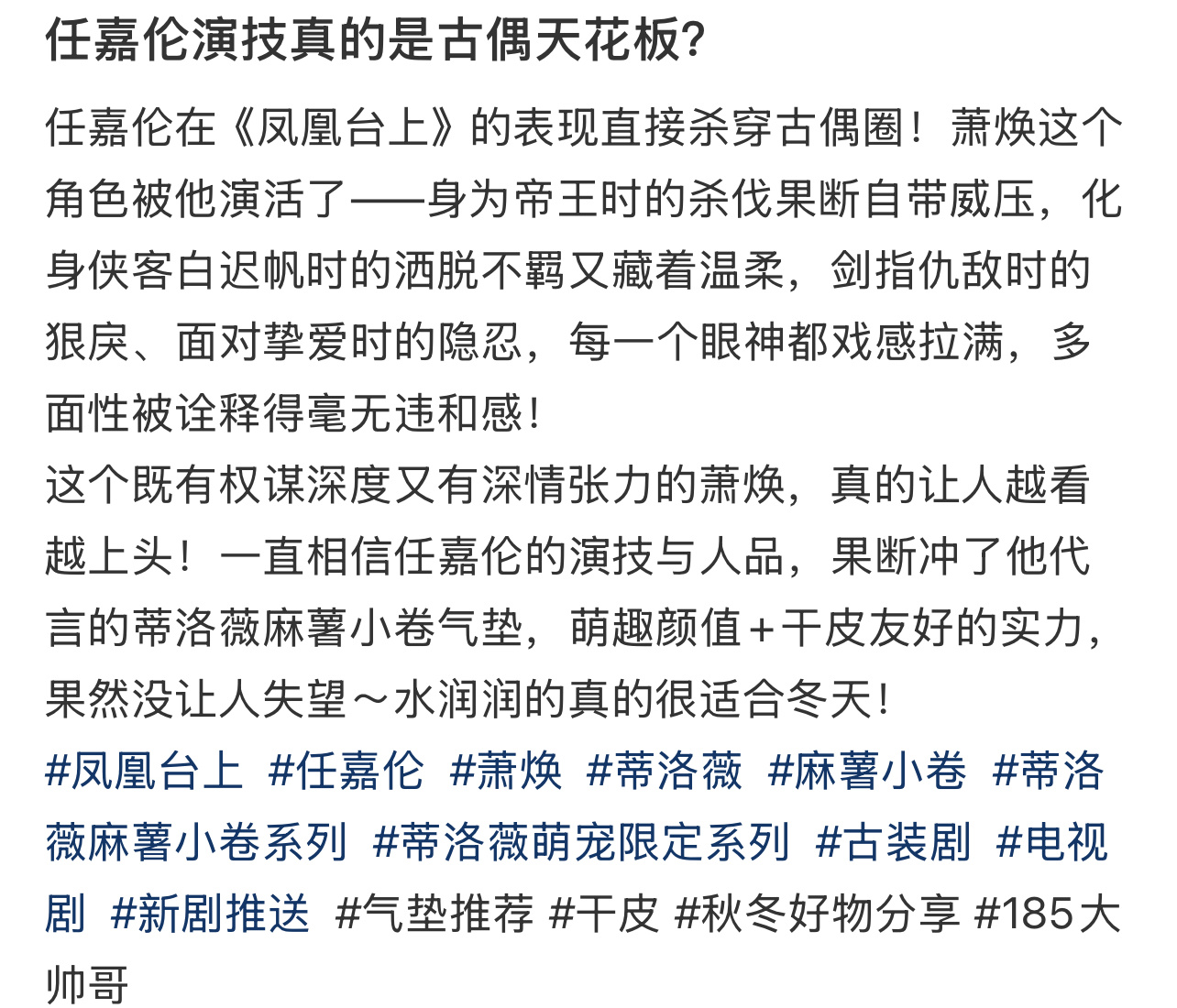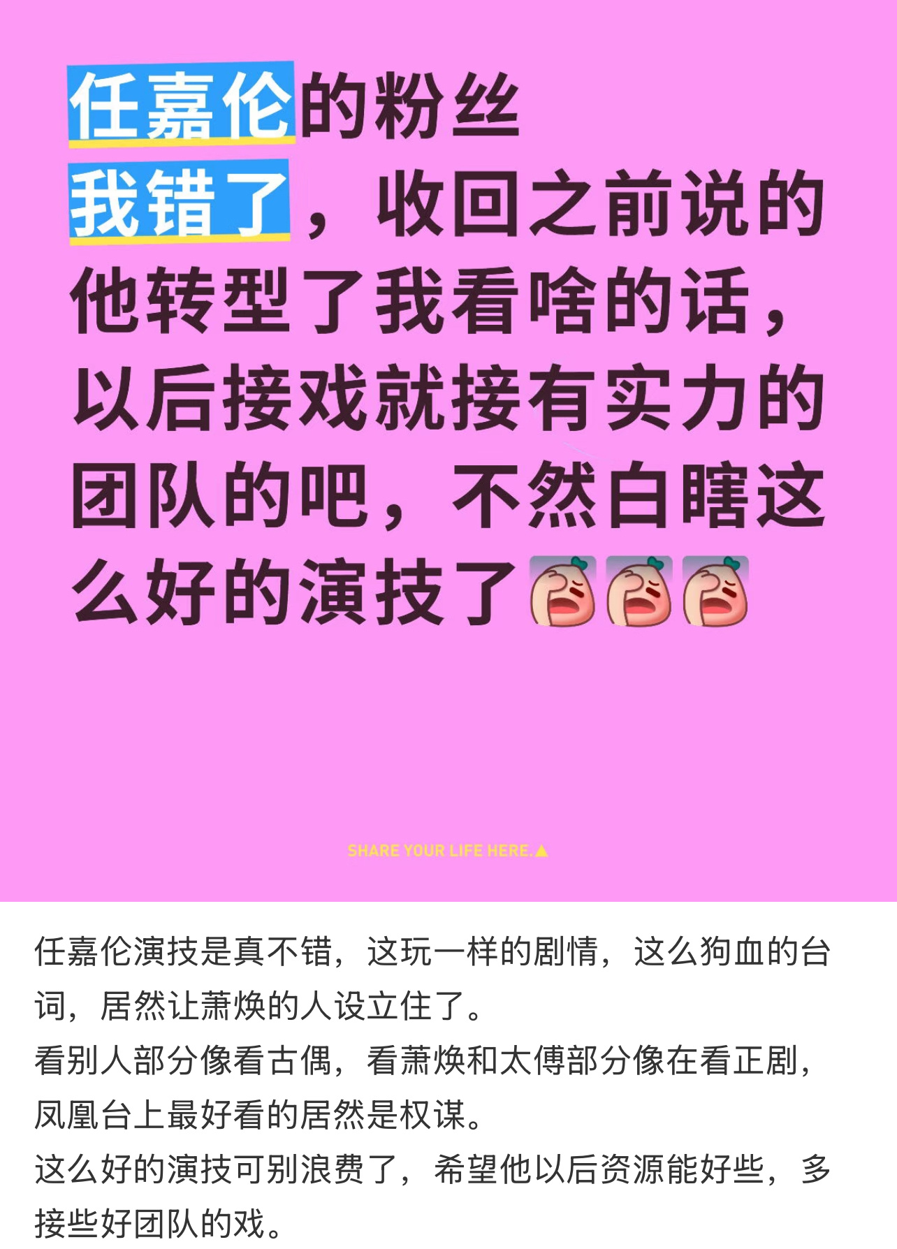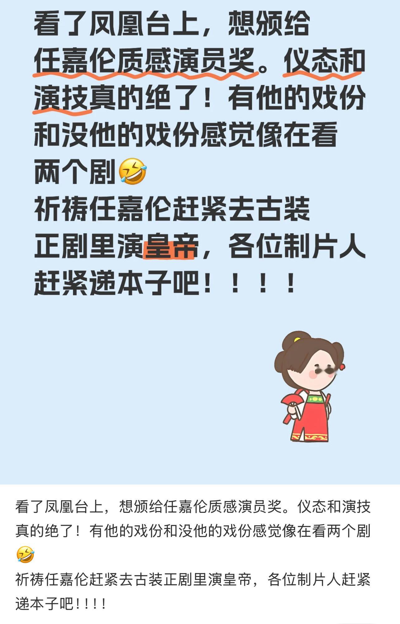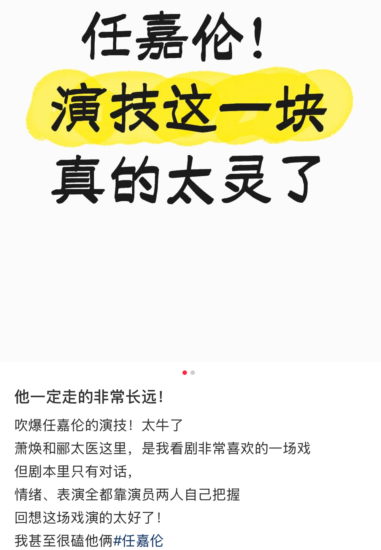 🍠到处都是夸任嘉伦演技的帖子,凤凰台上任嘉伦简直就是用演技80所有人,质感和别人有壁