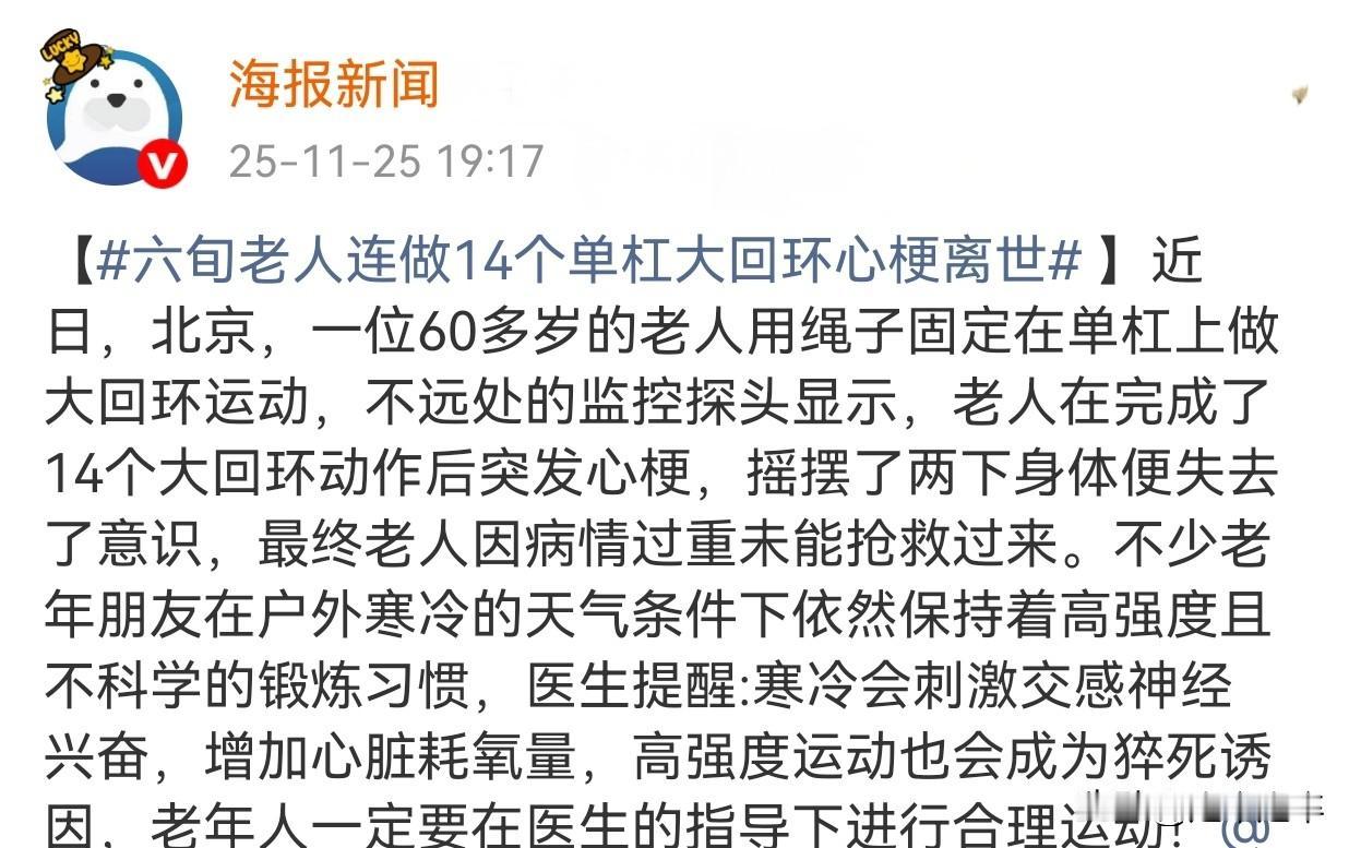 近期在北京发生了一件本来可以避免的悲剧。 一位六旬老人在北京丰台花园单杠上用绳子固定身体进行大回环,完成14次动作后突然失去意识,后经医生现场抢救,虽紧急心肺复苏,仍因心梗抢救无效离世。这场本为强身健体的硬核锻炼竟成生命终点。 让人疑惑的是六旬老人,为何要“好勇斗狠”?六旬老人为何要挑战高难度动作?是为了健康还是为了炫耀。随着年龄增长不是应该匹配,运动强度适合自己的方式?避免将动作难度等同于展现自己身体健康水平,肌肉强壮≠心脏健康。 这或许是由于部分老年人都存在“不符老”的心态!在退休以后部分老年群体可能出现认知衰退,导致情绪控制能力下降、判断力减弱,容易因小事引发情绪暴躁产生攀比心理问题。他们通过过激的行为来释放自己的压力。在退休后自身的角色转变、社交减少,就会产生孤独感连带着自身存感在的缺失,通过“争强好胜”证明自身存在这也是一种原因。 从个人角度看悲剧核心是,很多老人把做高难度动作当健康勋章,却不知无症状的病情才是隐藏的“杀手”。合理运动才是护心药。超出身体耐受度就会变成毒药,科学评估与适度锻炼才是中老年养生的关键。 健身是为了健康,不是“炫技”,尤其在冬天血管脆弱的时候,稳一点、慢一点才是真安全。北京丰台公园