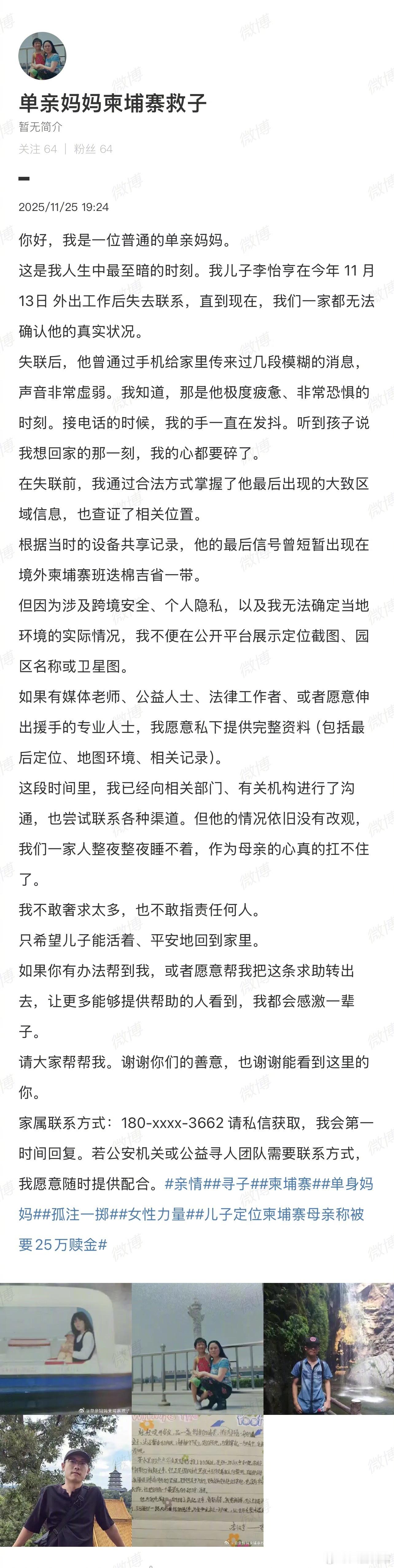 仝卓称与其一起长大的表弟在11月13日外出工作后失去联系。表弟的妈妈说根据当时的设备共享记录,最后信号曾短暂出现在境外柬埔寨班迭棉吉省一带。“失联后,他曾通过手机给家里传来过几段模糊的消息,声音非常虚弱。”“听到孩子说我想回家的那一刻,我的心都要碎了。”