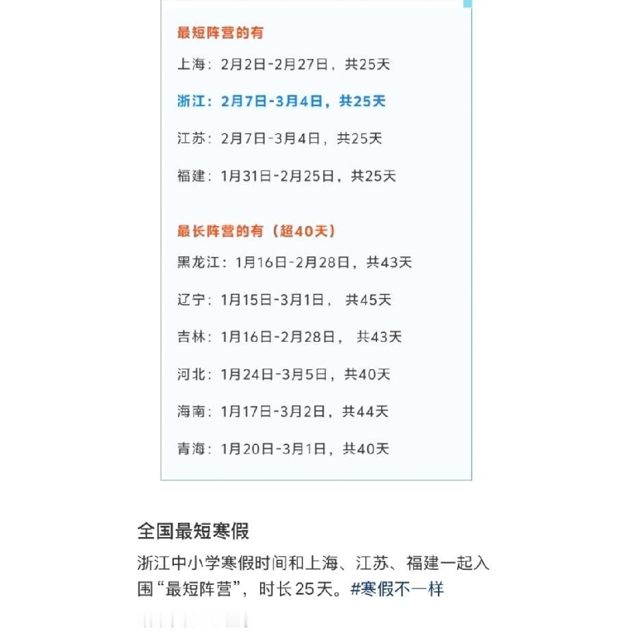 浙江中小学2025年寒假时长为25天,和上海、江苏、福建一起入围最短阵营…… 浙江网友吐槽:放个三天的秋假把自己一段夸,到处显摆自己有多开明、多优越,结果原来是从寒假扣的三天,放不起就别放…… 可评论区其他地方网友则表示:知足吧,像上海、江苏、福建还不是一样25天,人家可是没有秋假放的,南方的寒假时间不都是这么长吗? 网友们,你们怎么看“南北方寒假时长相差这么多”这个话题?