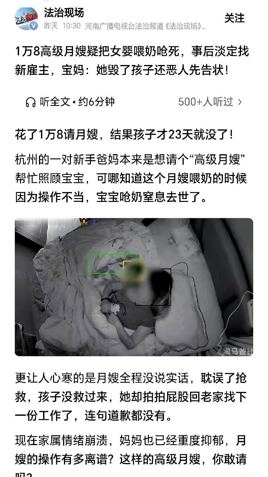 孩子嘴唇都紫了,小手在那挣扎,她居然云淡风轻地跟孩子爸妈说:没事,在拉粑粑。 我真的……看到这我一口气没上来。 那是个刚出生23天的小人儿啊! 花了一万八千八请来的高级月嫂,呛奶了,不仅不停,还继续往孩子嘴里喂。监控里,孩子哭声都变了,撕心裂肺地喘不上气,她还在那喂。 这是喂奶,还是在干嘛? 家长让她做海姆立克急救,她说不会。 电话里医生指导,她也只是胡乱拍几下。 就这么眼睁睁地,拖了整整17分钟!黄金17分钟! 最后孩子没了。 十月怀胎,23天的朝夕相处,就这么没了。妈妈直接重度抑郁。 你以为这就完了?更炸裂的在后面。 调解的时候,这个月嫂,一脸无辜地说:我0.1%的责任都没有。 不道歉,不赔钱,连工资都不退。 第二天,直接跑回老家,发朋友圈继续找下一家。 仿佛只是随手掐死了一只蚂蚁,而不是一个活生生、曾经在她怀里吃奶的宝宝。 我真的无法想象,是什么样的人,才能冷漠到这种程度。 那不是一个“工作失误”,那是一颗压根就没有温度的心。 这已经不是过失了,这是作孽。 希望那个宝宝在天上,能看到恶人被严惩。 也希望那对父母,能撑过去。太难了,真的太难了。