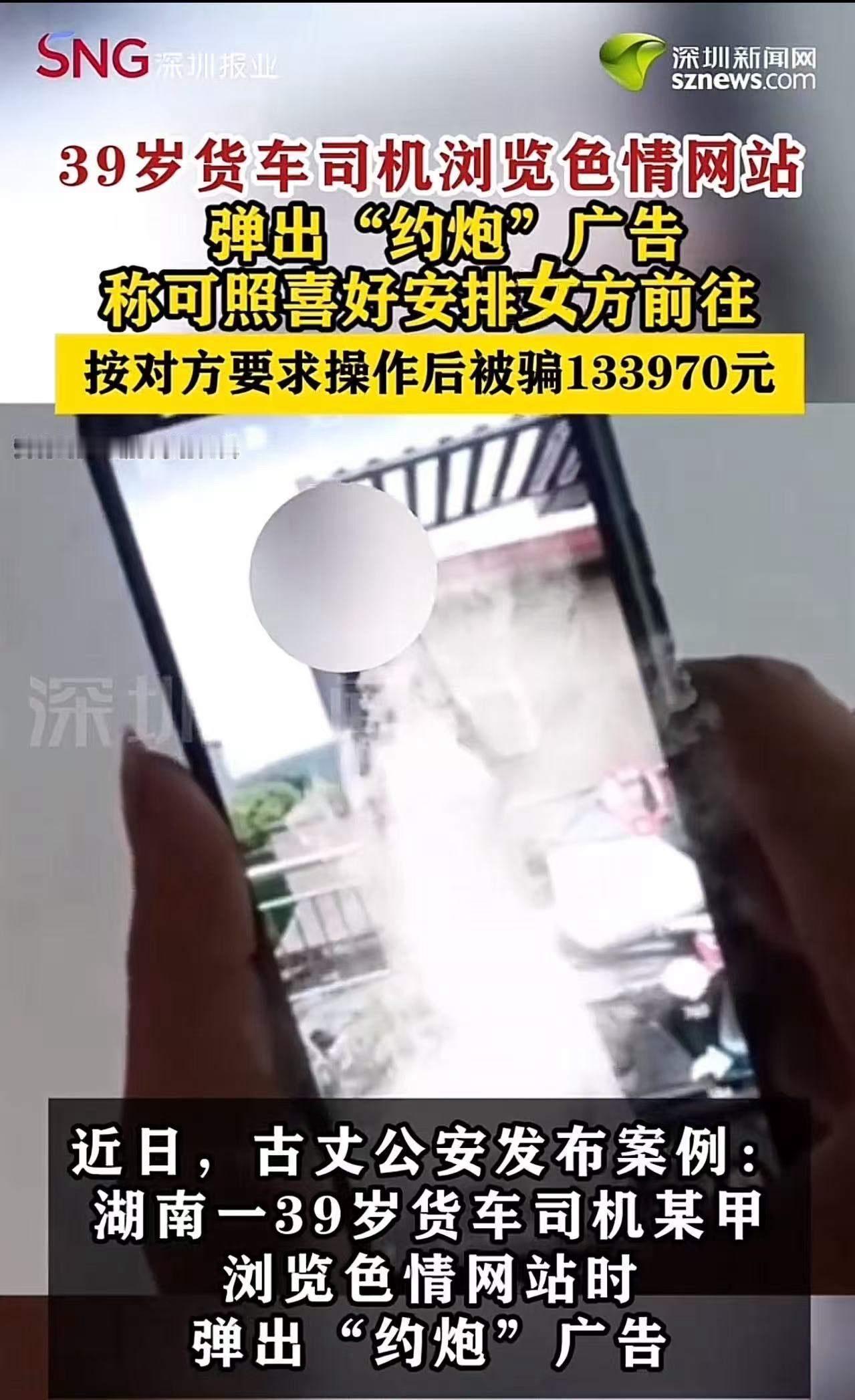 “色字头上一把刀!”这句古老的谚语,似乎在现代社会依然真实上演。湖南的这位39岁货车司机,本以为只是一时的冲动,没想到却陷入了一个看似“简单”的陷阱。每天奔波在高速公路上的他,或许早已习惯了孤独和寂寞,但谁曾想,一次点击,却让他付出了生命中最沉重的代价——133970元的血汗钱。 事情的经过令人心碎也令人愤怒。那天,他在浏览色情网站时,弹出了一个“约炮”广告,画面中的女人看得他心跳加速,仿佛瞬间点燃了他内心深藏的渴望。或许,是长时间的孤独让他变得越发渴望一份温暖,一份陪伴。于是,他按照客服的指示操作,结果却陷入了骗局——被骗走了全部积蓄。 “这么多钱没了,连女人的手也没摸到,太难受了!”他在电话里哽咽着,声音中满是无助和愤怒。这不仅仅是金钱的损失,更是一次心理的重创。更令人愤慨的是,骗子们用虚假的“情感”和“承诺”折磨着无助的男人,将他们的孤独变成了可被剥夺的财富。 这起事件背后,折射出的是一个深层次的社会问题:孤独、寂寞、情感的空虚,如何在现代快节奏的生活中被无情地放大?为什么一些人会选择在虚拟世界中寻找慰藉,却掉入了陷阱?更令人愤怒的是,网络诈骗手段层出不穷,利用人们的弱点和情感脆弱点,肆意掠夺他们的血汗钱。 而这13万,对于这位司机来说,意味着他可能要在漫长的货运路途中,拉多少公里的货才能弥补?或许是一辆货车的油费,也许是一年的生活费。这笔钱,曾经是他辛苦赚来的血汗钱,现在却变成了“空中楼阁”。每当他想到这里,心中除了愤怒,更多的是一种无奈和悲凉。 但故事还没有结束。这个事件引发了社会的广泛关注,也让我们不得不反思:在这个信息爆炸、诱惑无处不在的时代,我们该如何保护自己?面对虚拟世界的“甜言蜜语”,我们又该如何保持清醒的头脑?更重要的是,社会、家庭、法律应当如何联手,为那些像他一样的普通人筑起一道坚实的防护墙? 或许,我们都曾在某个瞬间,被虚拟的幻象迷惑,被孤独的心灵折磨。我们需要的不仅是对“色字”的警醒,更是对“孤独”的关注。让我们用行动去关心身边的人,用法律去严惩那些肆意欺骗的恶行,用社会的温暖去驱散心中的阴影。 这不仅仅是一则新闻,更是一面镜子,映照出我们每个人的内心世界。面对诱惑,保持理智;面对孤独,学会自我疗愈。只有这样,我们才能在这个充满变数的时代,走得更稳、更远。毕竟,人生的价值,不在于一时的冲动,而在于我们是否有勇气面对自己,守护心中的那份纯净与善良。