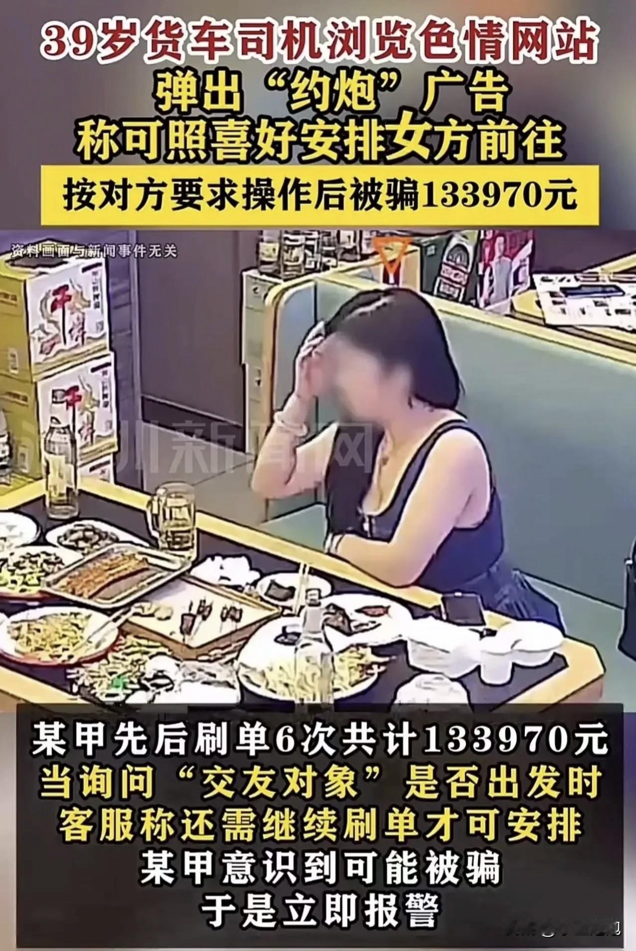 “色字头上一把刀!”湖南39岁货车司机浏览色情网站,被“约炮”广告骗走133970元。司机称“钱没了,女人手都没摸到,太难受”,网友感慨“这13万要跑多少公里货运才能赚回”。 这骗子也太损了,专盯着货车司机的血汗钱坑。跑货运的谁不知道,这活计苦得很,跑长途的时候,吃睡都在驾驶室里,风里来雨里去的,赚的每一分都是熬出来的。13万多,对货车司机来说,那是没日没夜跑大半年的钱,就这么没了,换谁不得心疼得慌。 其实骗子的套路一点儿都不新鲜,就是捏着人贪色的心思下手。先在黄网上放些勾人的图片,再冒出来个客服说能安排见面,接着就让你交诚意金、保障费,变着法儿让你转钱。这位湖南司机也是被冲昏了头,连着刷了6次单,直到对方还催着交钱,才发现自己被骗了。 这种约炮诈骗早就不是新鲜事了,警方天天提醒,可还是有人往坑里跳。说到底就是侥幸心理在作怪,总觉得自己能占着便宜,哪知道骗子就等着这种人上钩。而且这种涉黄的事儿本身就不光彩,就算被骗了,有些人还不好意思报警,正好让骗子得逞了。 13万可不是个小数目,对货车司机来说,这钱可能是孩子的学费,是老人的看病钱,还有可能是货车的贷款钱。现在货运行业不好做,运费低,油费和过路费还一个劲涨,跑一趟赚不了几个钱,这一下亏了13万,不知道得跑多少趟才能挣回来。 我是真觉得,骗子固然可恨,可当事人也得多留个心眼。欲望要是管不住,早晚得栽跟头。不管啥时候,碰到这种看着就天上掉馅饼的事儿,先想想是不是陷阱,别脑子一热就转钱,最后落得个人财两空的下场。 你们身边有没有人碰到过这种离谱的诈骗?要是看到这种约炮广告,第一反应会是啥?评论区说说,也给大家提个醒!