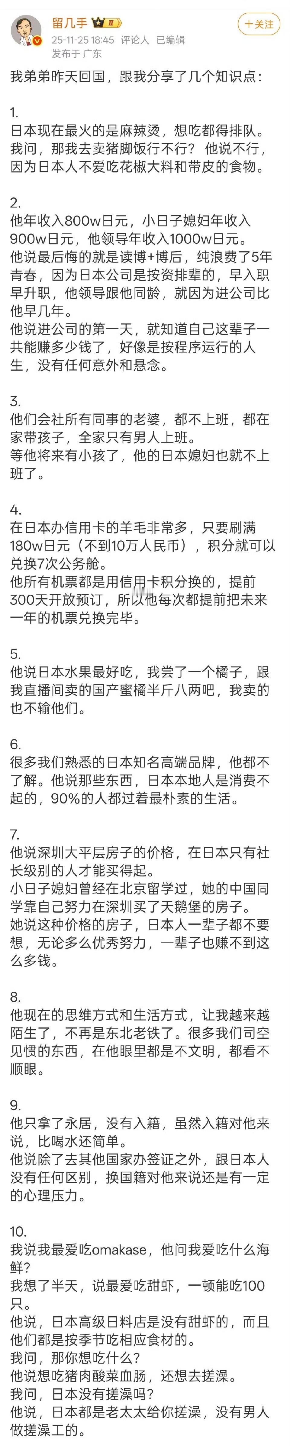 网络红人留几手,他的表弟在日本工作,拿了永居,跟手哥分享日本工作生活情况。