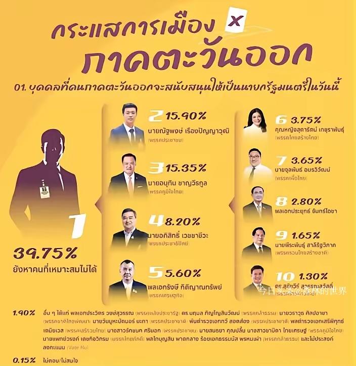 11月23日泰国NIDA民调一出炉!近四成选民说没找到心仪总理,三成多还没定要支持哪个党,主打一个“再等等看”。 人民党靠着24.65%的党派支持率暂居第一,纳塔蓬以15.9%的个人支持率领跑总理人选,自豪党的阿努廷15.35%紧随其后,俩人情势咬得超紧。最有意思的是曾经的老牌劲旅为泰党,直接跌落到7.5%的党派支持率,候选人朱拉攀才拿到3.65%的选票,堪称“过气明星式滑坡”。 以前的铁票仓说跑就跑,选民现在不看党派情怀,只认实在福利。这民调哪儿是选情预测,分明是给各党派提了个醒:光靠喊口号没用,得拿出真东西,不然那三成多的“摇摆选民”可不会轻易买单~