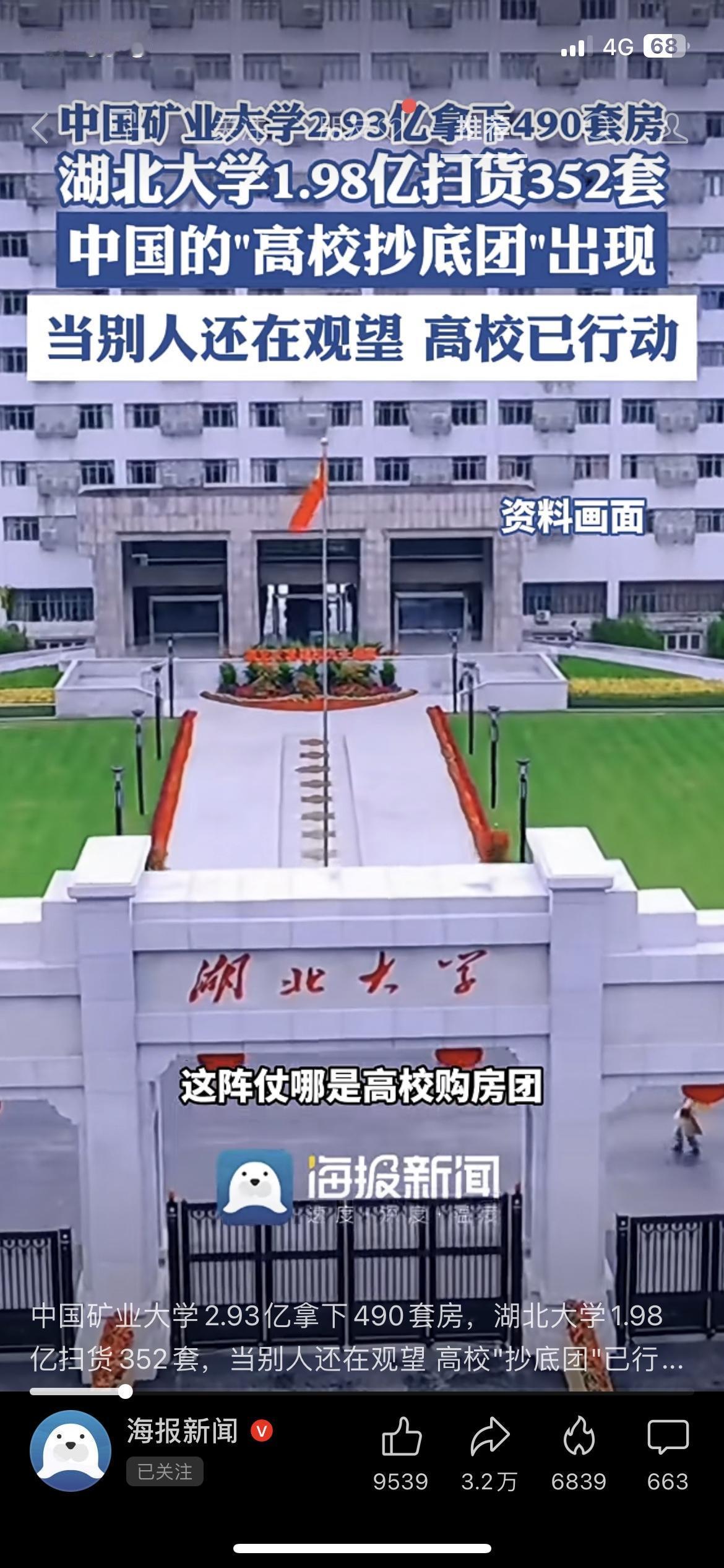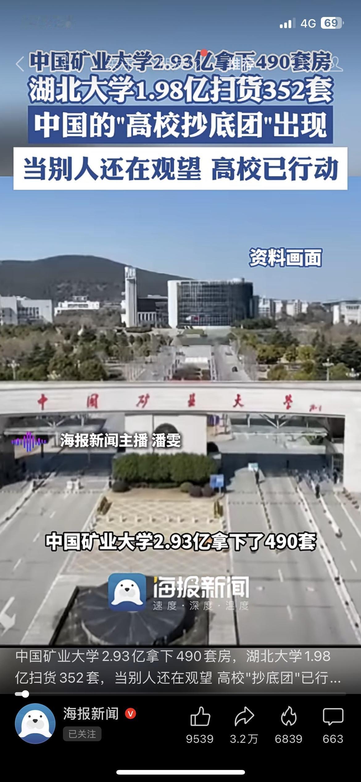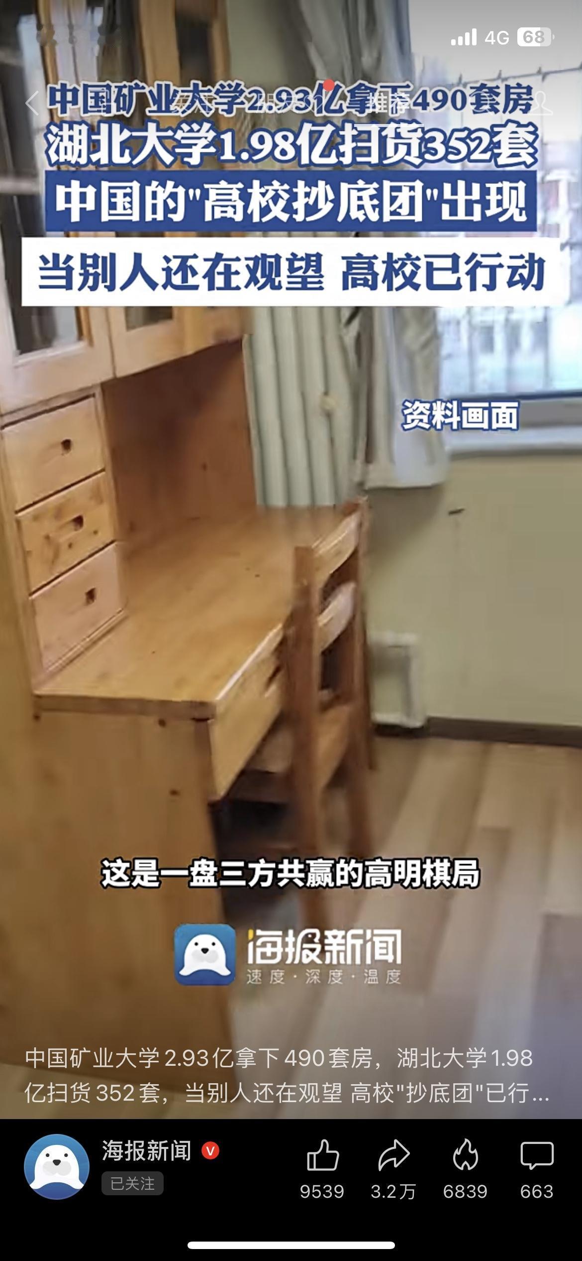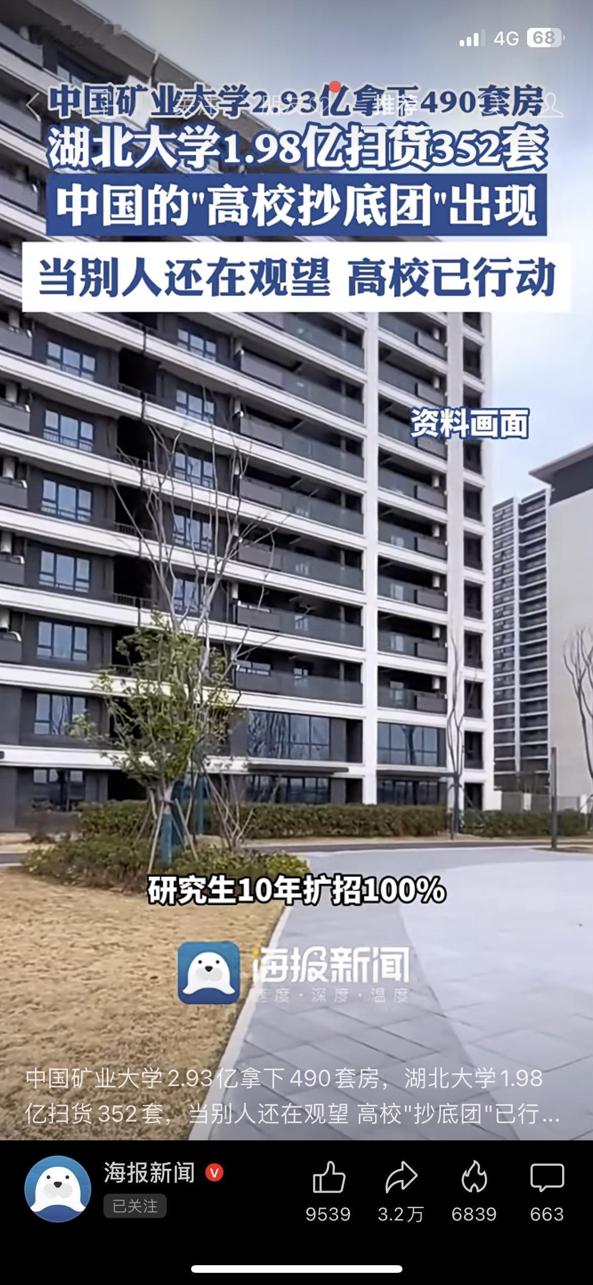 高校疯抢房子!矿大2.93亿买490套,湖大1.98亿扫货,是抄底还是无奈? 最近高校买房太疯狂了!中国矿大花2.93亿买了490套房,套均才60万,湖北大学也砸1.98亿收购352套商品房,全要改成学生宿舍! 有人说这是高校“抄底”楼市,毕竟价格才是开盘价的一半;也有人质疑:7万一张床太烧钱,为啥不自己盖?其实真相是高校没地可建了,扩招后宿舍缺口达十几万平米,买现房能快速解决学生住宿难题。现在中南大学、合肥工业大学都跟着学,这模式要普及? 你觉得高校买现房改宿舍明智吗?是教育刚需还是资本炒作?评论区说说你的看法~ 高校抄底买房 房地产热点 教育民生