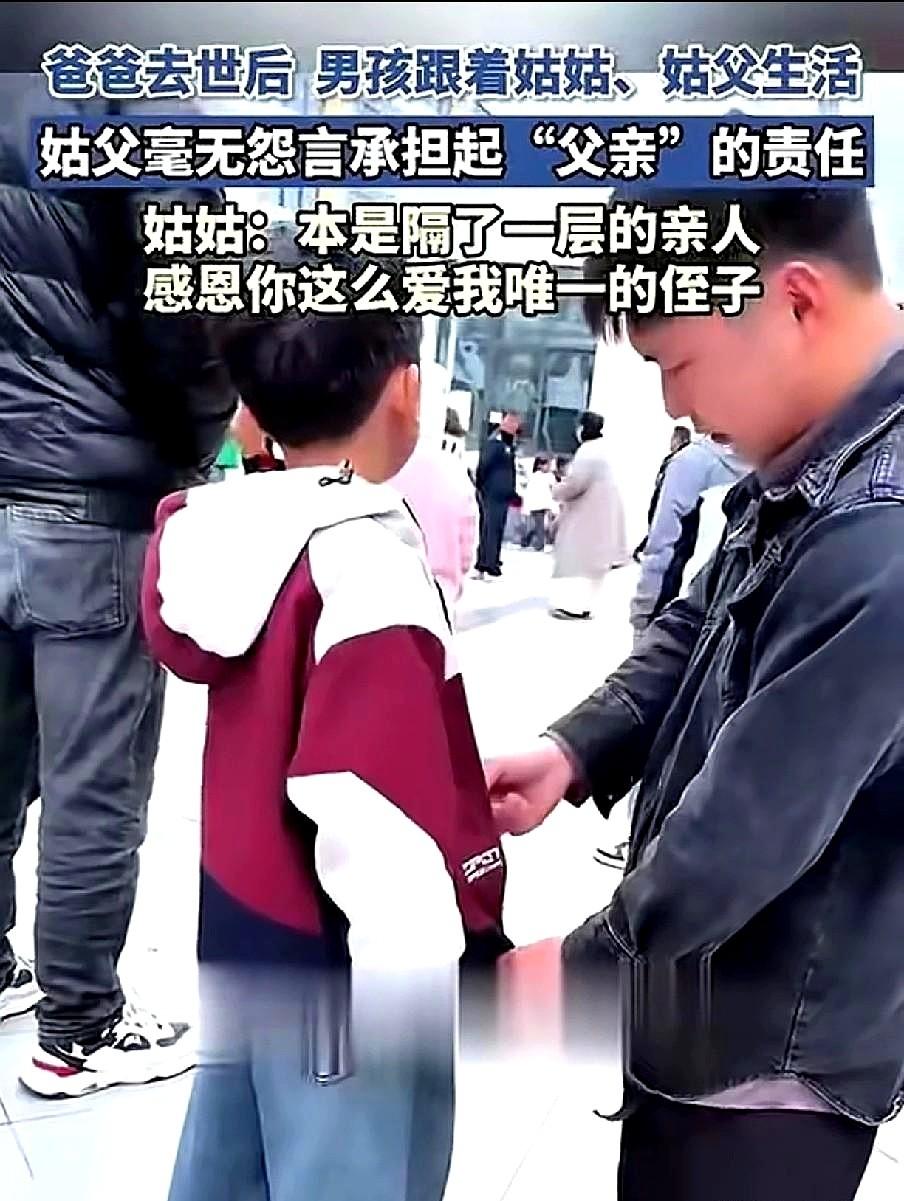 安徽蚌埠,5岁男孩爸爸去世,妈妈外出打工,姑姑心疼男孩,将他接回自己家照顾。 没想到,男孩姑父的态度却让姑姑出乎意料! 姑父对小轩视如己出,承担起“父亲”的责任。 孩子的姑父用善行诠释担当,不假思索地接受失去父亲的内侄,可敬可佩。 积善人家必有余庆,愿孩子长大后以涌泉回报姑父姑姑。 在这个金钱至上的年代,能有这样暖心的文章,不仅温暖了孩子的心灵,也温暖了很多人。 好人一生平安。姑父给力,您一定是有大福报的人。 这个姑父长得还挺帅的,心也善良,侧脸看岁数不大。