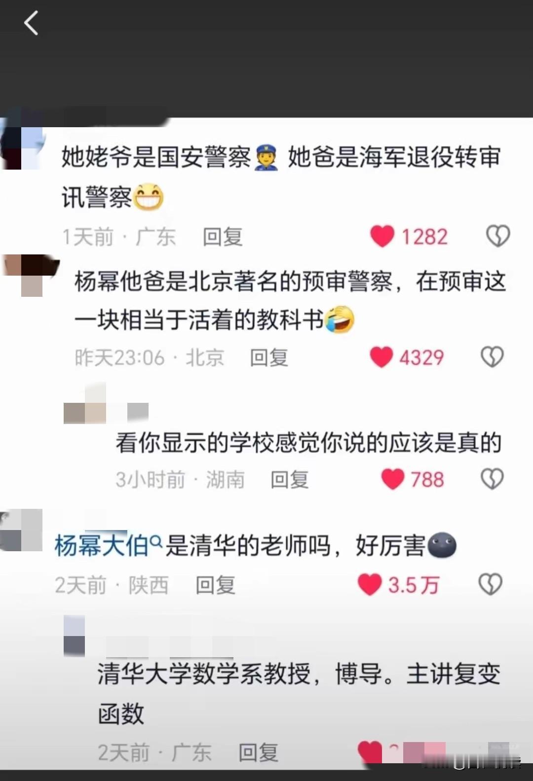 关于杨幂 有一个疑问 还是想问出来 她在小雪节气发了一张 表明立场的照片 获得了很多人的点赞 这个赞是值得和肯定的 重点来了 评论区有网友“揭”了她的家底 说她爷爷/爸爸/大伯 多么多么优秀 这在我们普通人看来 已经是天花板级.别的家庭了 可她为啥还选择把 女儿的抚养权放在夫家呢 有懂的友友么
