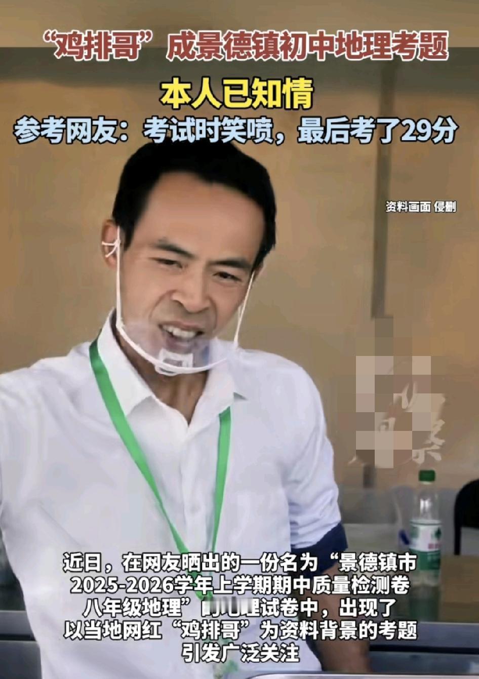 江西景德镇“鸡排哥”写入了景德市当地的期中考试地理试卷,有考生说,当时做题的时候笑喷了,结果考了29分,不仅如此,鸡排哥也陆续出现在其他的科目考试题上,有江西的学生称,出题老师网速特别快。学校回应,现在学生都很容易接受一些新颖的题目,而且鸡排哥是当地的文旅推荐官,所以就把他的资料加入到市场题当中。