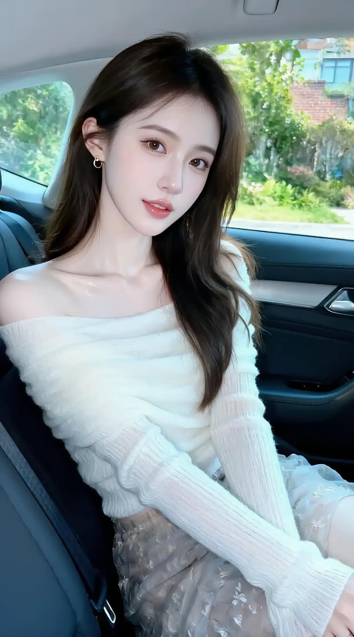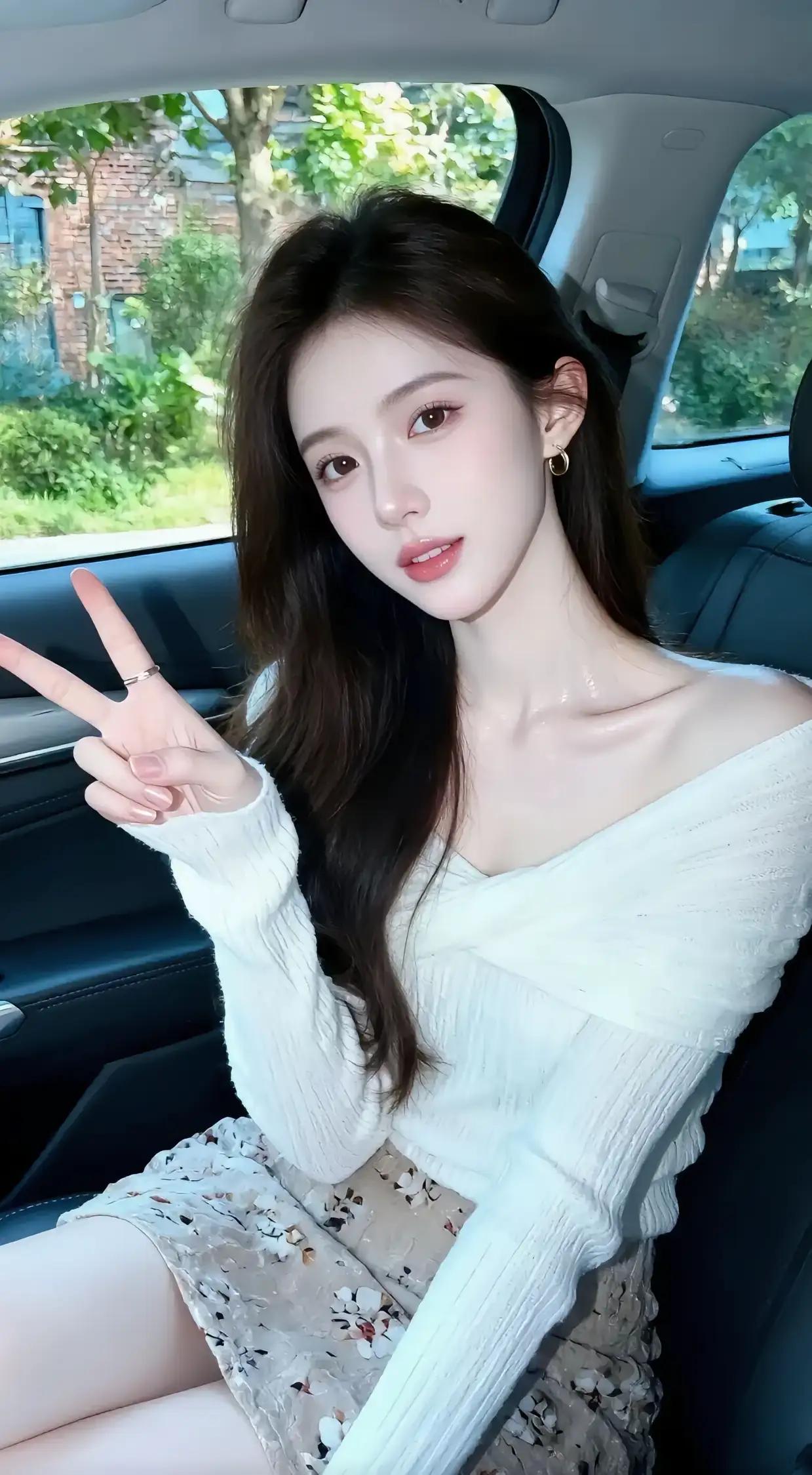 白色蕾丝在阳光下泛起细碎的珠光,像撒了把碾碎的月光。她将右手举到颊边,无名指的金戒圈忽然迸出星芒——原是车窗外的香樟叶筛落的日影,正巧撞上戒指内侧篆刻的玫瑰纹。V字手势的阴影斜斜切过锁骨,把颈间肌肤衬得愈发莹润,倒比蕾丝领口的珍珠扣更温三分。 风掠过车窗时,发丝缠住耳垂的金环,荡出细密的涟漪。她眼底盛着整片盛夏的蓝,睫毛投下的栅栏影里,藏着远处红砖墙爬山虎的绿意。指甲盖上浅粉珠光流转,与方向盘真皮缝线的纹路遥相呼应,恍若某种隐秘的密码。 当云影漫过车身,她忽然微微倾身。蕾丝领口的镂空花纹便活了过来,把阳光织成蝴蝶形状的光斑,停在她心口的位置。车载香薰飘出的雪松香里,混着窗外飘进的广玉兰气息,在她发梢酿出清甜的雾。 背景里的行道树忽然晃动起来,原是副驾上的手机震动惊醒了光影。屏幕亮起的刹那,她无名指的金戒圈在玻璃窗上投下双重幻影,与远处建筑工地的塔吊构成奇妙的对仗。风再起时,一缕散发拂过唇畔,那抹笑便染上了栀子花的白。 暮色初临时,最后一线天光掠过车载时钟。她收回手的动作惊醒了空调出风口的蓝丝带,V字手势残留的弧度里,盛着整个盛夏的蝉鸣。而车窗外的香樟树影,正悄悄爬上蕾丝衣襟,把时光绣成永恒的金线。