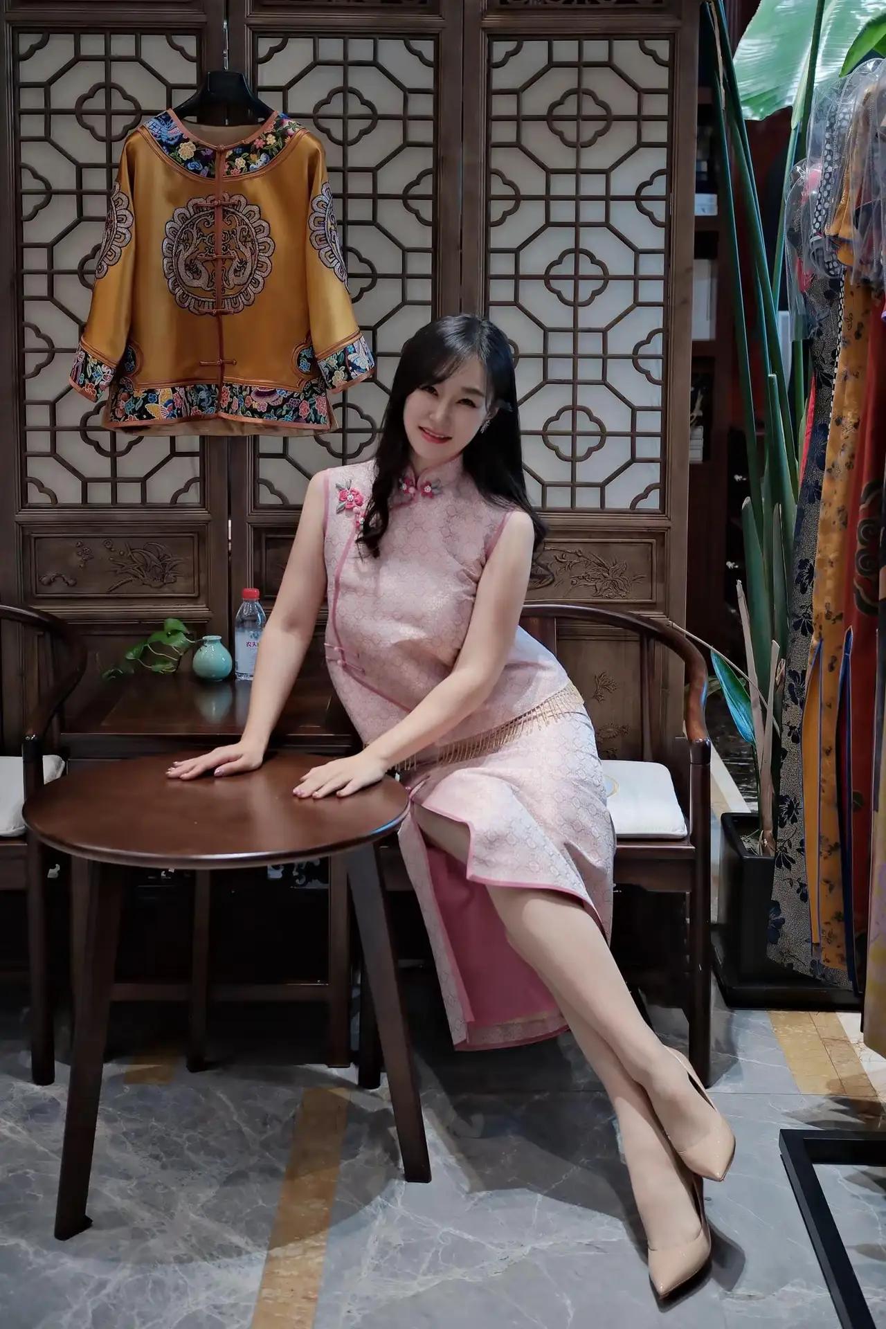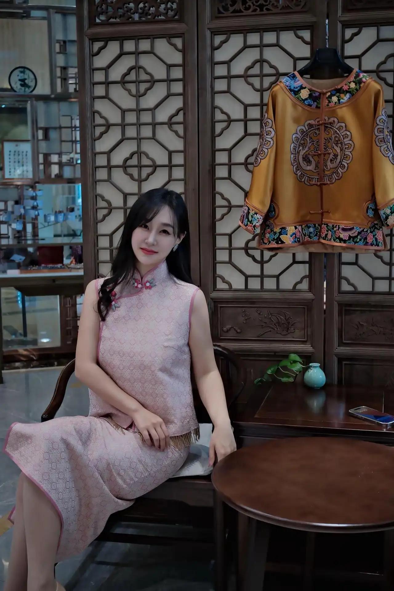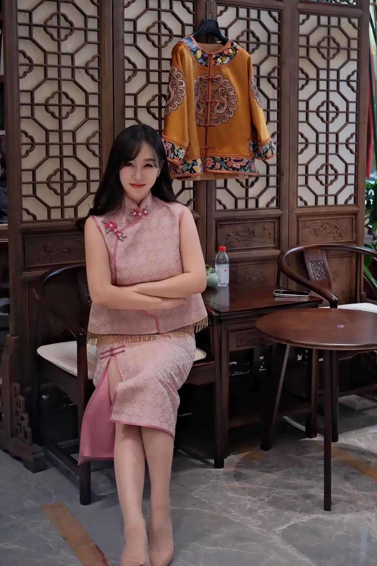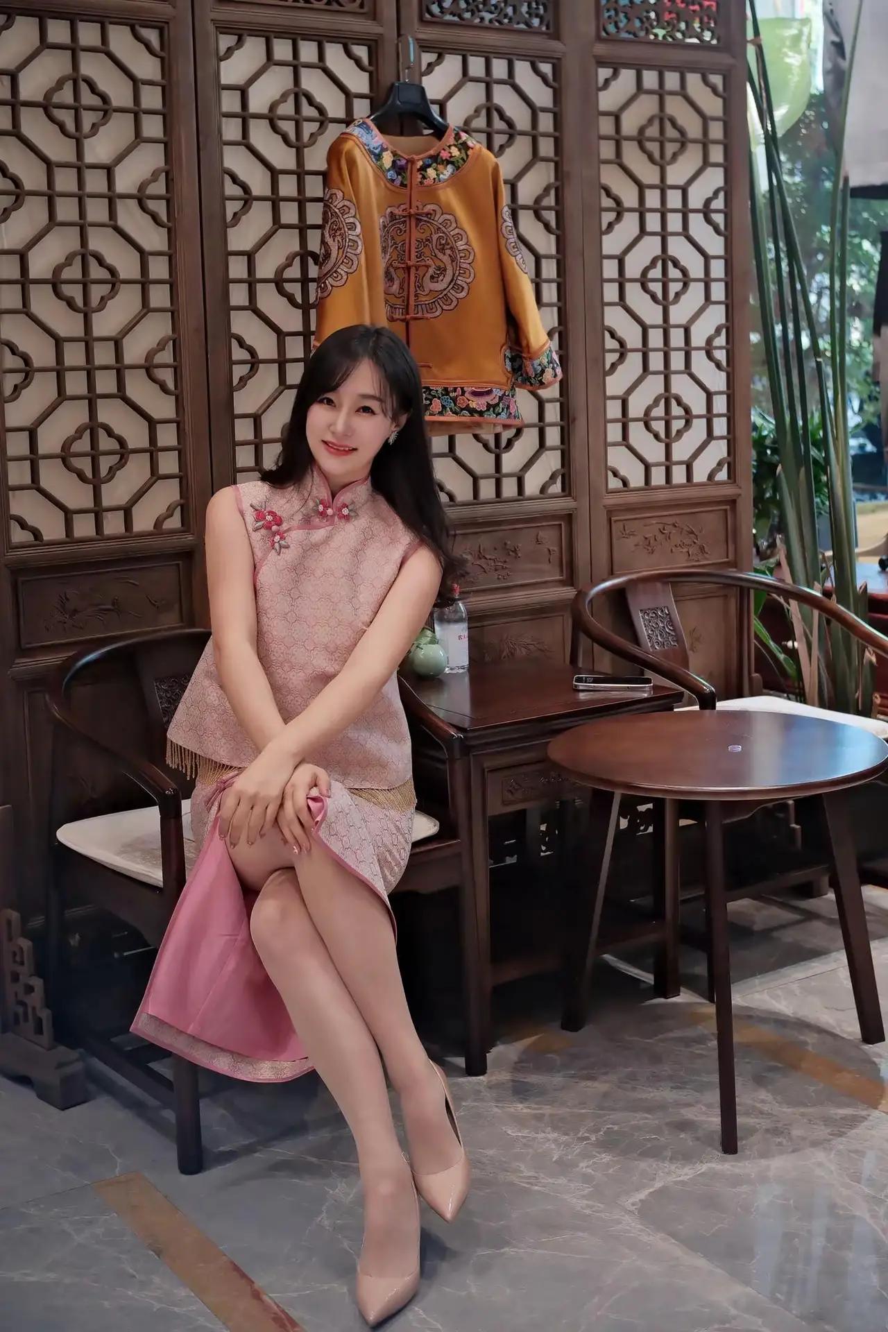 暮春的午后,阳光穿过雕花窗棂,在屏风的几何纹路上织就细密的光网。她端坐在红木圈椅里,藕荷色旗袍泛着绸缎特有的柔光,襟前盘扣从锁骨蜿蜒至腰际,像一串未及落地的雨珠。双腿交叠的弧度恰好贴合圈椅的曲线,足尖点着青砖地,绣鞋上的缠枝莲暗纹便从裙摆下探出头来,与屏风上的菱花纹遥相呼应。 腕间翡翠镯子滑落至小臂,在桌面上叩出清响,惊醒了沉睡在青瓷瓶里的三色堇。她指尖轻抚桌沿,指甲盖上淡粉珠光流转,与身后屏风顶端垂落的明黄戏服构成奇妙的对话——那戏服金线绣着的凤凰正展翅欲飞,尾羽掠过她鬓边的珍珠发簪,将光屑抖落在旗袍的立领上。 当穿堂风掀起戏服的流苏,她忽然侧首微笑。唇角漾起的梨涡里盛着窗外漏进的春光,睫毛在瓷白肌肤上投下蝶翼般的阴影。屏风后的矿泉水瓶微微颤动,折射出的光斑爬上她裙裾,在缠枝牡丹纹路上跳起圆舞曲。交叠的膝头露出半寸黑色丝袜,与红木桌腿的雕花缠枝纹构成冷暖相宜的构图,恍若工笔画里精心设计的留白。 茶香氤氲时,她抬手整理鬓角的动作惊动了屏风上的光影。腕间玉镯与青瓷瓶相撞的脆响里,三色堇花瓣簌簌落在桌面的手机壳上,给现代科技镀上古典金边。背景里悬着的各色戏服随风轻摆,水袖拂过她肩头却不曾沾染半分,唯有那抹明黄在旗袍上投下流动的影,恍若凤凰掠过春水时漾开的涟漪。 暮色漫过窗棂时,她起身的弧度惊醒了梁间的燕子。旗袍下摆扫过青砖地的瞬间,屏风上的几何纹路忽然活了似的,顺着光影爬上她的裙裾。而那只悬在空中的明黄水袖,正悄悄在她腰间系成新的盘扣。