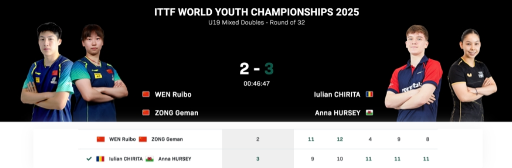 正在罗马尼亚克卢日-纳波卡举行的2025年国际乒联世界青少年乒乓球锦标赛再度爆出冷门。在11月25日的U19混双十六分之一决赛中,中国组合温瑞博/纵歌曼在先赢两局的优势局面下痛失好局,最终以11比9、12比10、4比11、9比11、8比11的比分,遭罗马尼亚与威尔士的跨国组合尤利安·基里塔/安娜·赫尔希逆转,无缘十六强。 今年18岁的温瑞博是国内U19男单第一人,排名青年组男单世界第九位,上届世青赛获得男双、团体两项冠军,还刚刚斩获全运会青年组男单冠军与男团季军。他的搭档纵歌曼则是U19女团的关键成员。 逆转取胜的跨国组合同样实力不容小觑。罗马尼亚选手基里塔是今年欧洲锦标赛U21亚军;威尔士选手赫尔希在青年组女单高居世界第4位,两人的配合在关键分处理上展现出极强的韧性。 比赛初期,温瑞博/纵歌曼一度建立起优势,连下两城;但从第三局开始温瑞博受困于心态波动与战术应变不足,连续出现失误,最终被对手连扳三局完成逆转。 本届世青赛,黄友政年满“毕业”,温瑞博成为国乒男队头号主力,但迄今为止表现糟糕。就在前一天举行的U19男团四分之一决赛中,他一人丢了两分,成为中国队1比3不敌中国台北队的关键因素。首盘对决青年组男单世界第12名的徐弦家,温瑞博以2比3惜败;第四盘生死战面对年仅17岁的中国台北队选手郭冠宏,他再度以2比3落败,直接断送了球队的晋级希望,中国U19男队也制造了世青赛历史最差战绩。 温瑞博正是国乒青年军在本届世青赛整体表现的代表。除U19男团外,U15梯队同样遭遇溃败:男团半决赛中,中国队以1比3不敌意大利队,于海洋两次告负、周冠宏以2比3憾负对手,仅王梓宁拿下一分;在U15女团赛场,中国队表现更为糟糕,刘子菱、祝启慧、赵王琪均告负,以0比3被日本队横扫出局。