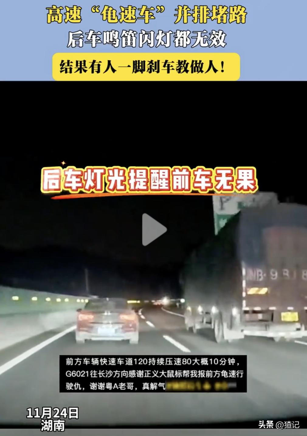大快人心!11月24日,湖南G6021往长沙方向高速上,一辆黑色轿车在快车道上压速80,与第二车道的大货车并排行驶,这段高速是两车道的,所以很多车辆都被堵在后面无法通过,两辆车并排行驶了差不多10分钟,任凭后方车辆闪灯和鸣笛,两辆车都毫不理会。 最后可能是实在看不下去了,一辆粤A牌照的轿车从应急车道快速超过两车,然后变道到快车道上的黑色轿车前方,接着粤A牌照轿车一脚刹车把车速降到40左右,把黑色轿车压在后方。 这时,旁边的大货车可能是见事不妙,赶紧提速一溜烟的跑了,后面被堵了很长时间的车流也终于可以通过了,众车纷纷对粤A牌照大哥竖起大拇指,教训的好! 视频也引发网友热议,有人说黑色轿车司机这种人更可恨,就是不加速也不减速,无论你怎么样都当没看见,只有重罚才能制止此类恶性事件。 有网友说,那个粤A小汽车从应急车道超车过去,堵住车,真的解气! 视频中的黑色轿车确实太过分了,在快车道低速行驶,尤其是还故意压速与大货车并排行驶,不仅影响了后方车辆通行,而且堵住道路造成后方车辆扎堆,也极易引发事故。 在高速龟速并排堵路是真缺德,尤其是后车都鸣笛闪灯了还不让,结果舒适了,被“一脚刹车教做人”,看着让人解气。 不过,粤A大哥的做法虽然很解气,但也不提倡,毕竟在高速上这么操作太危险了,遇到这种情况还是拍视频举报更稳妥,大家觉得呢?