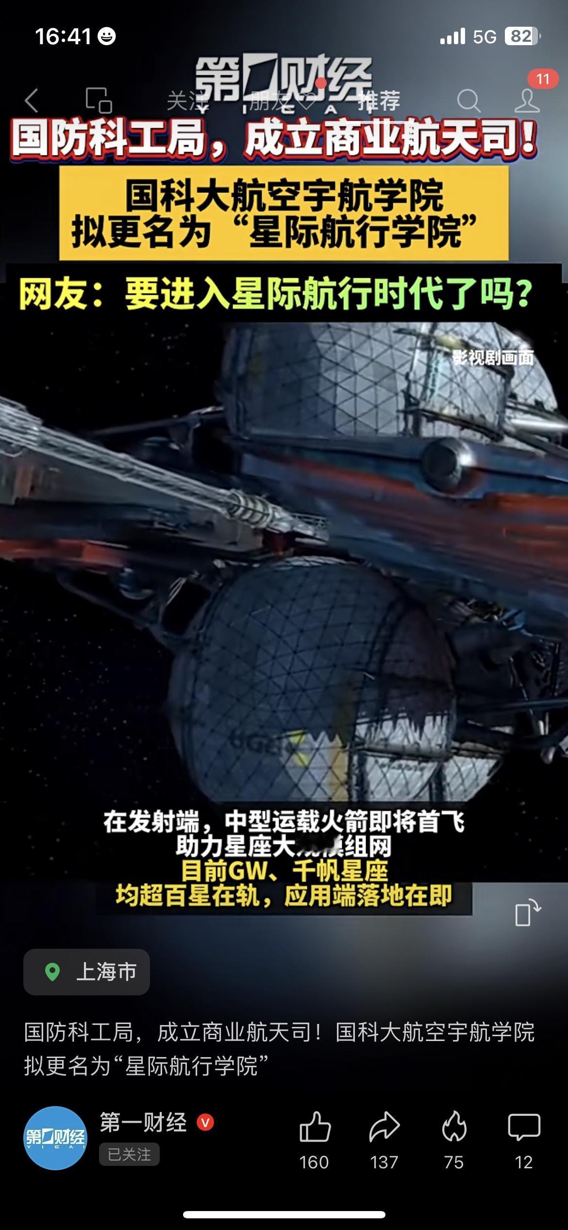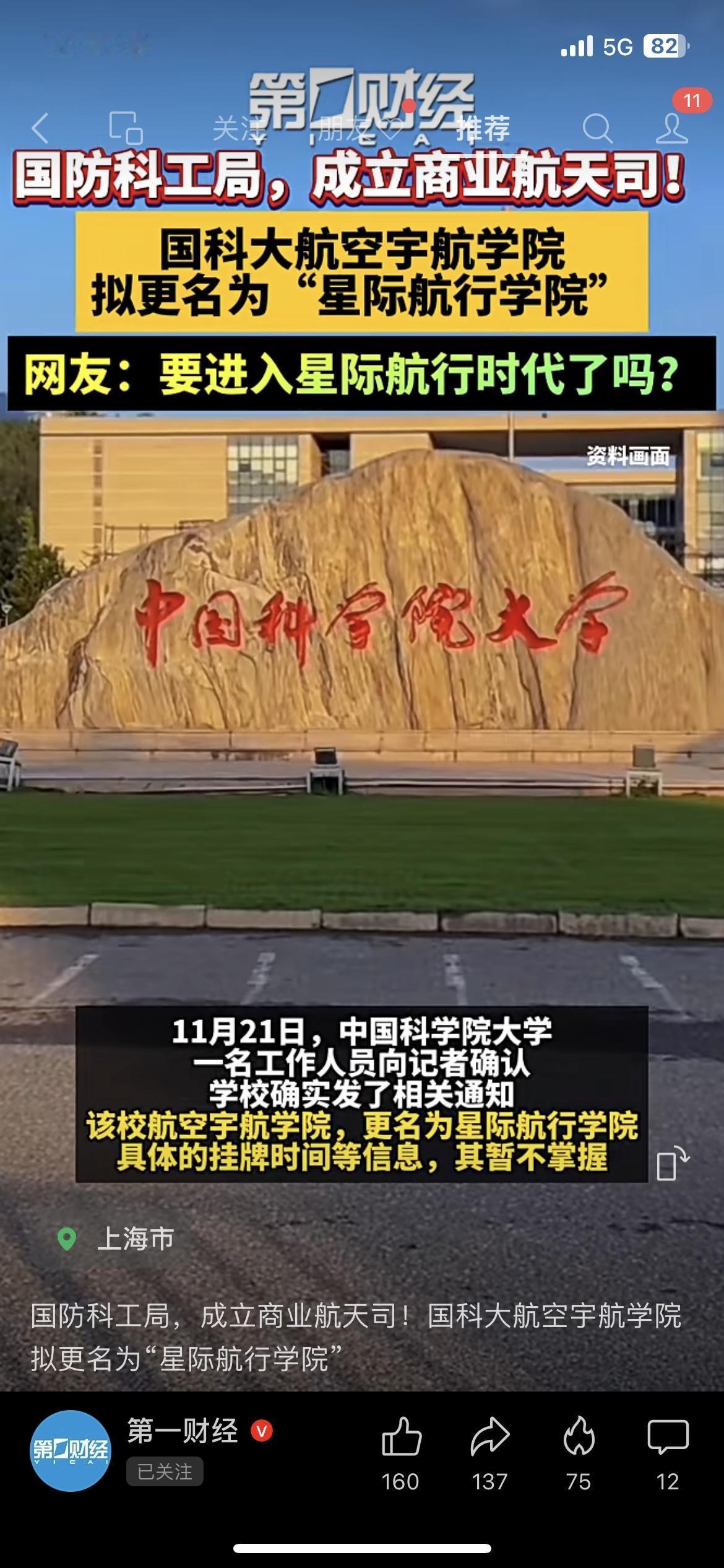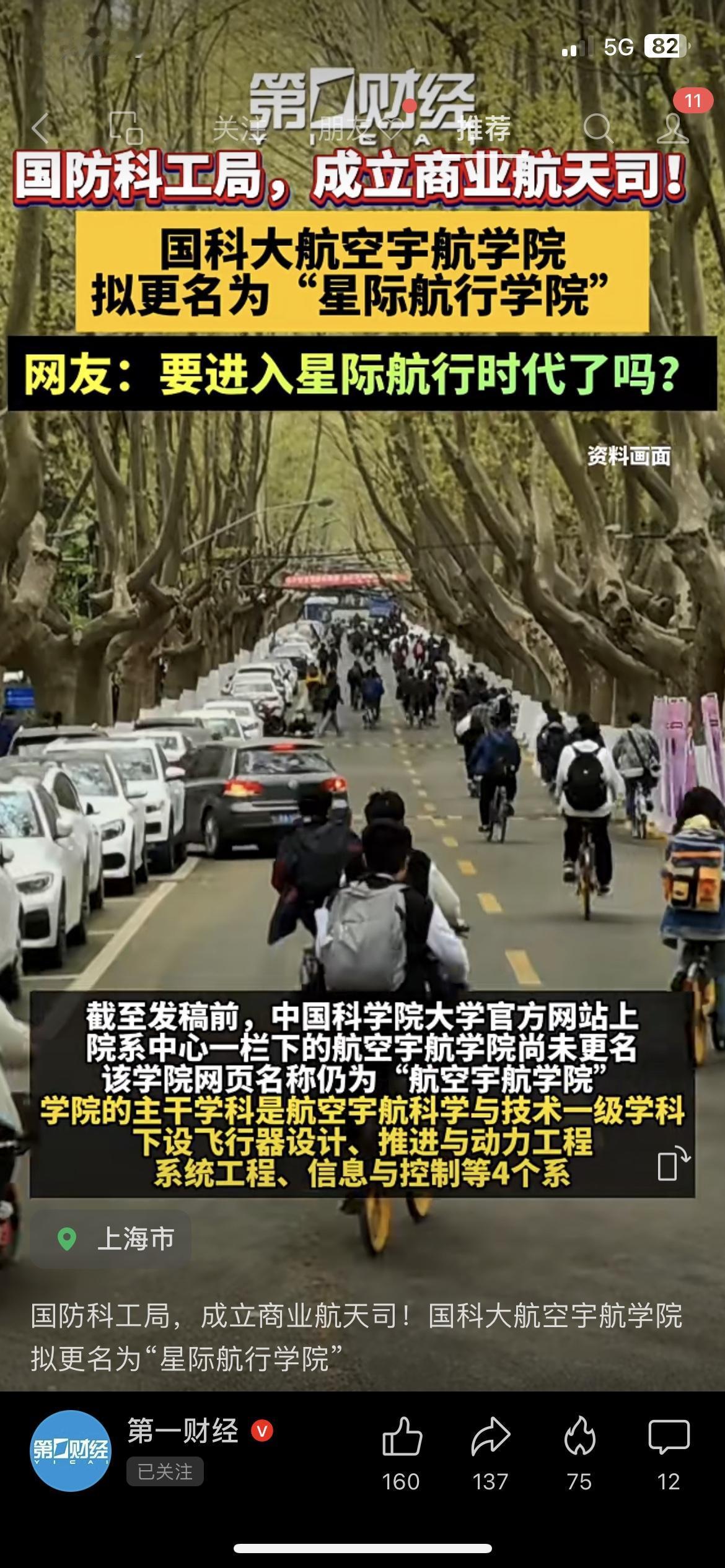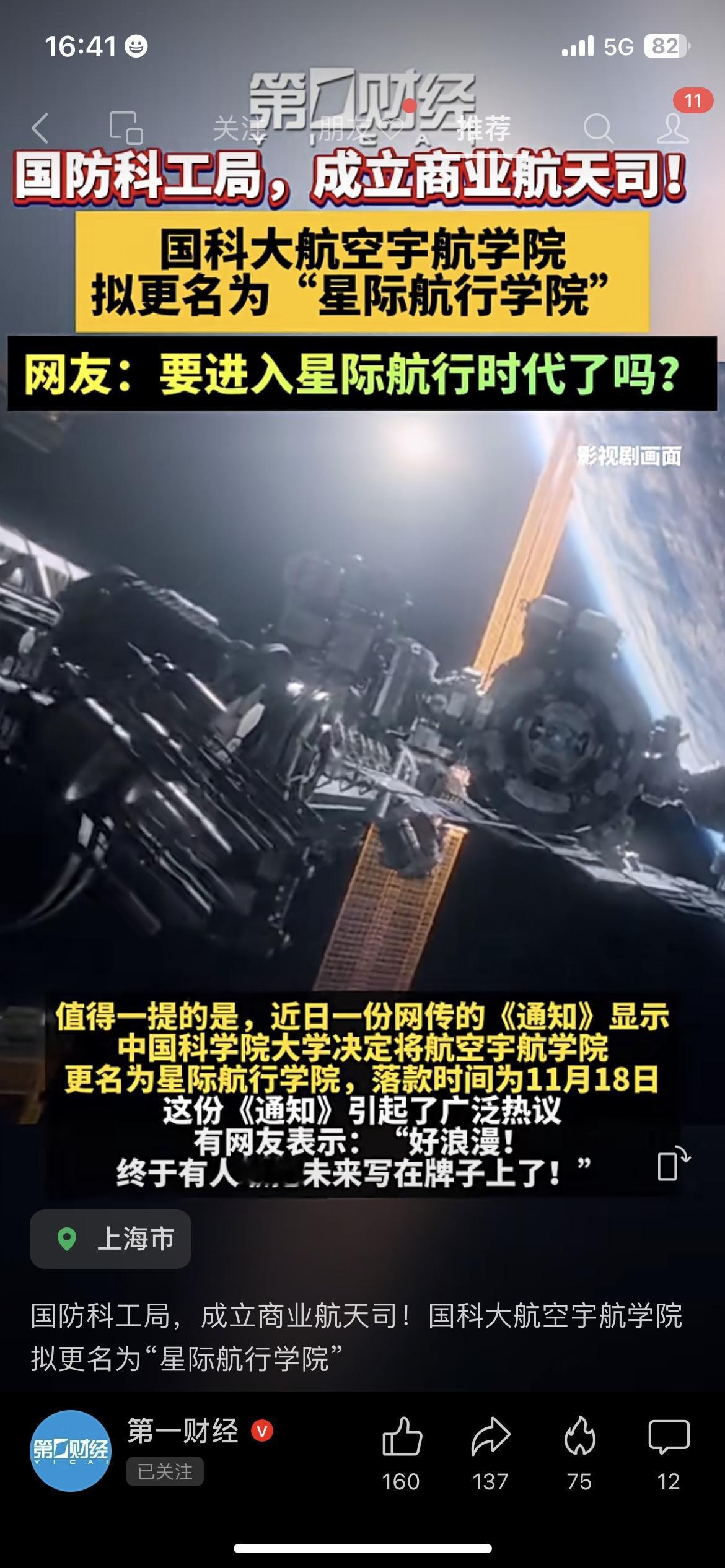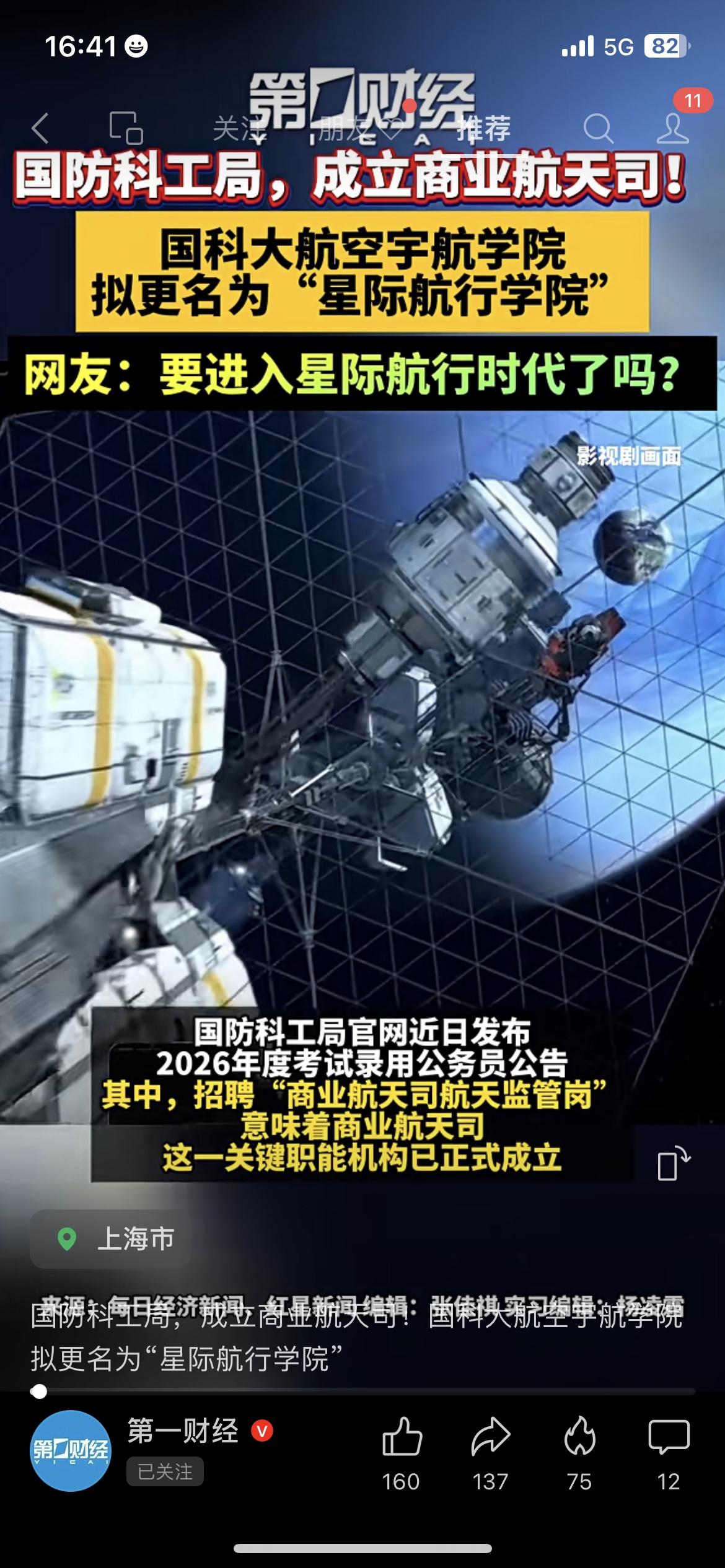 国防科工局成立商业航天公司+国科大航空宇航学院拟更名“星际航行学院” 国防科工局最新动作!成立商业航天公司,国科大航空宇航学院要改名“星际航行学院”啦! 这波操作直接把中国航天格局拉满,国家队下场+高校“星际”人才培养,航天板块是不是要起飞? 你最期待中国航天接下来哪个突破?评论区聊聊!