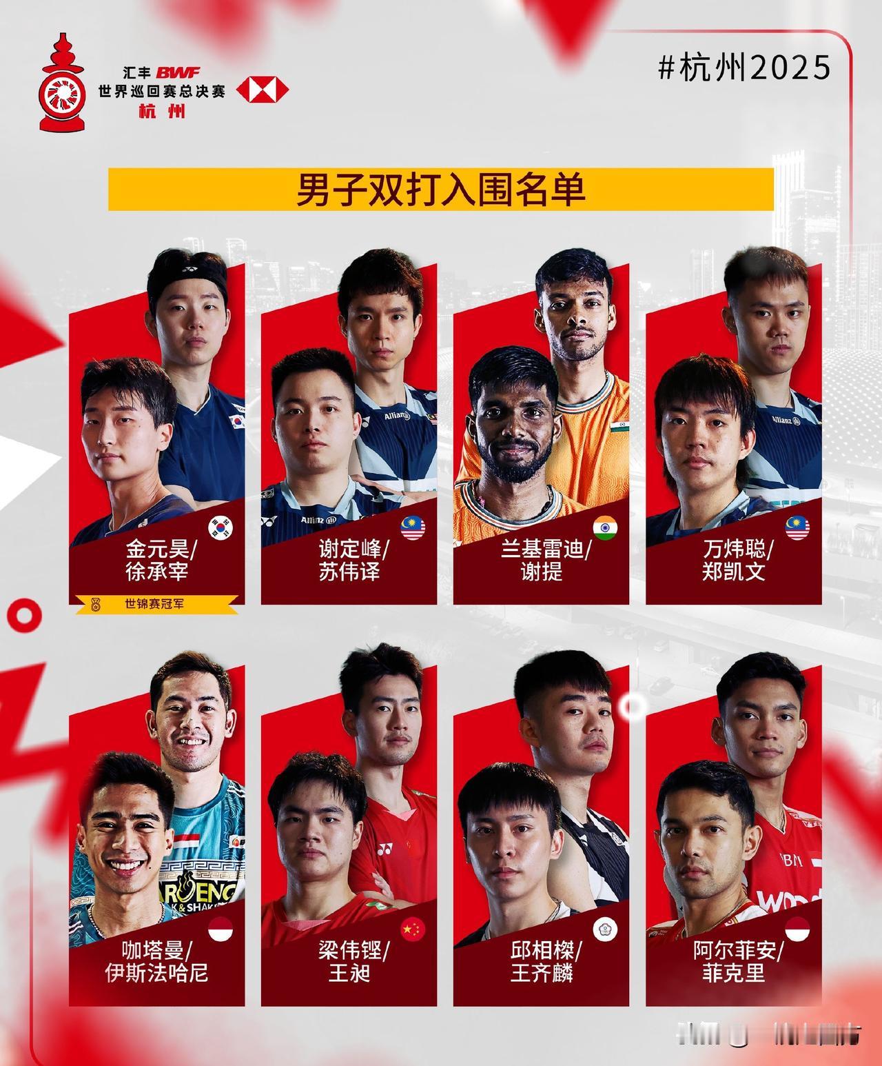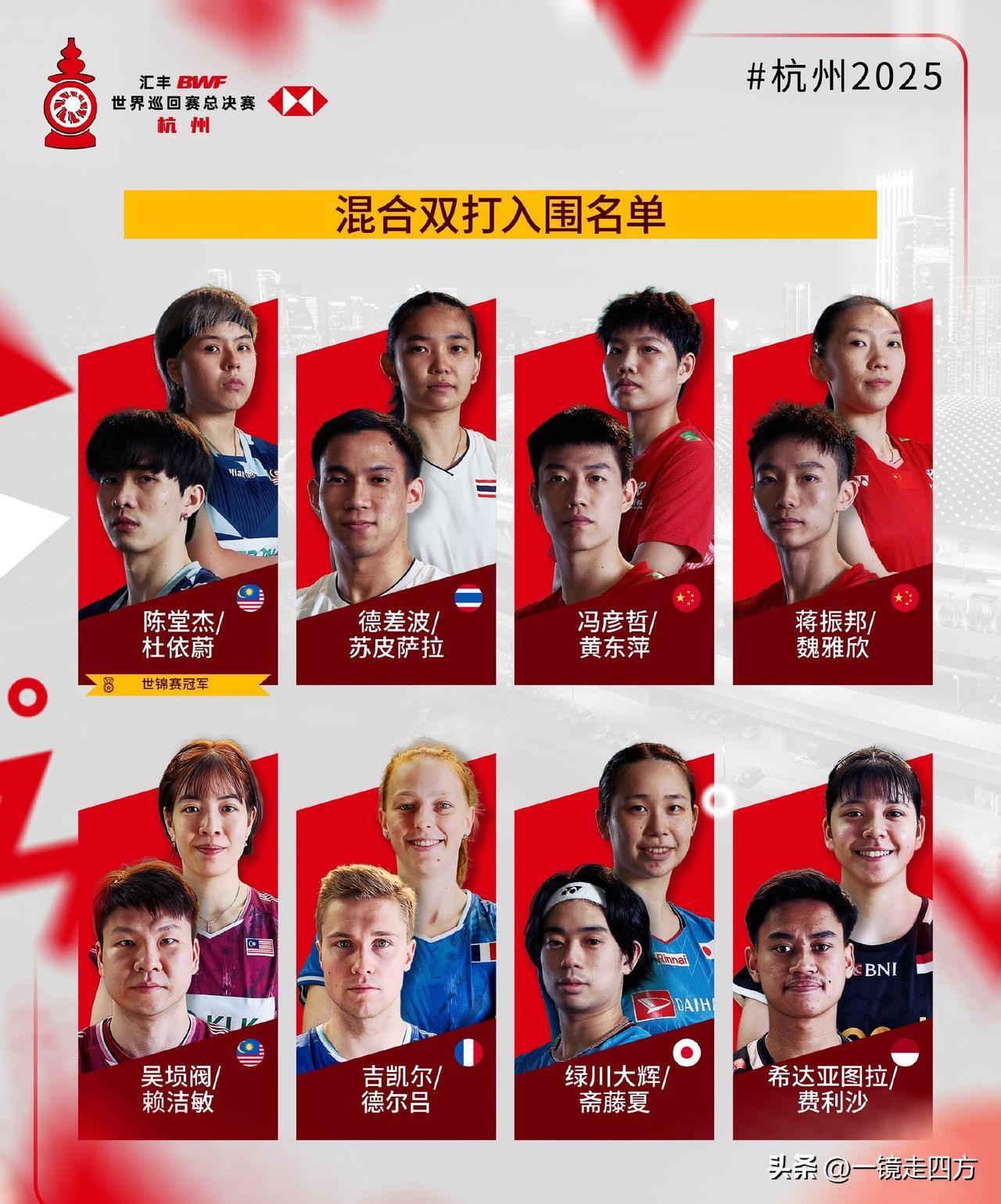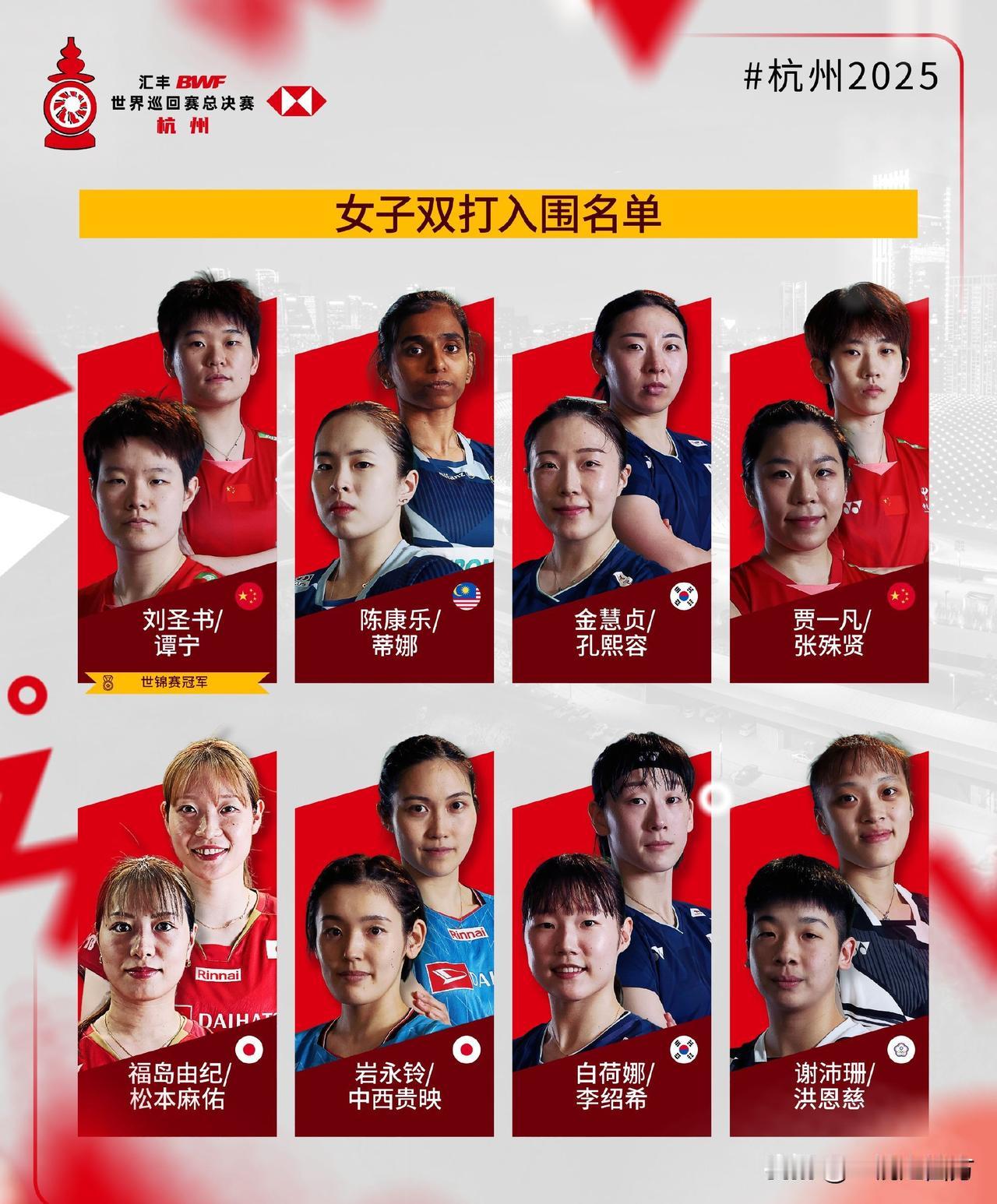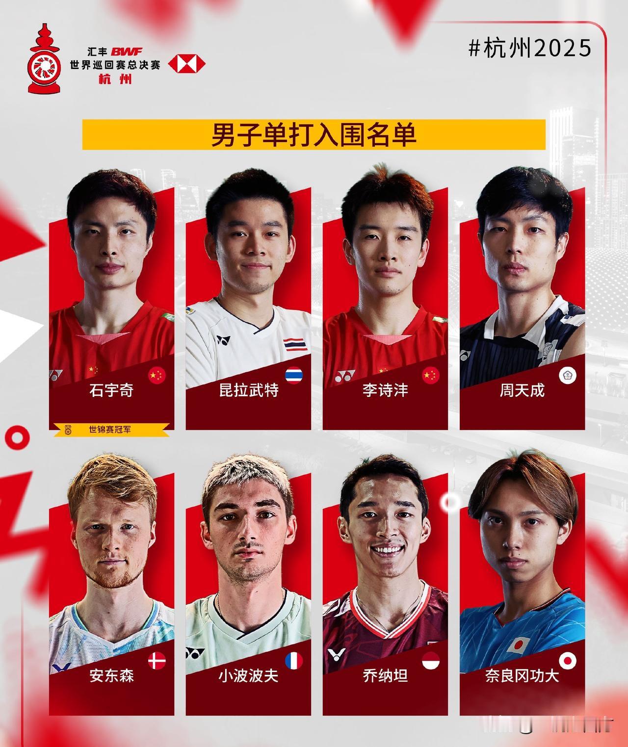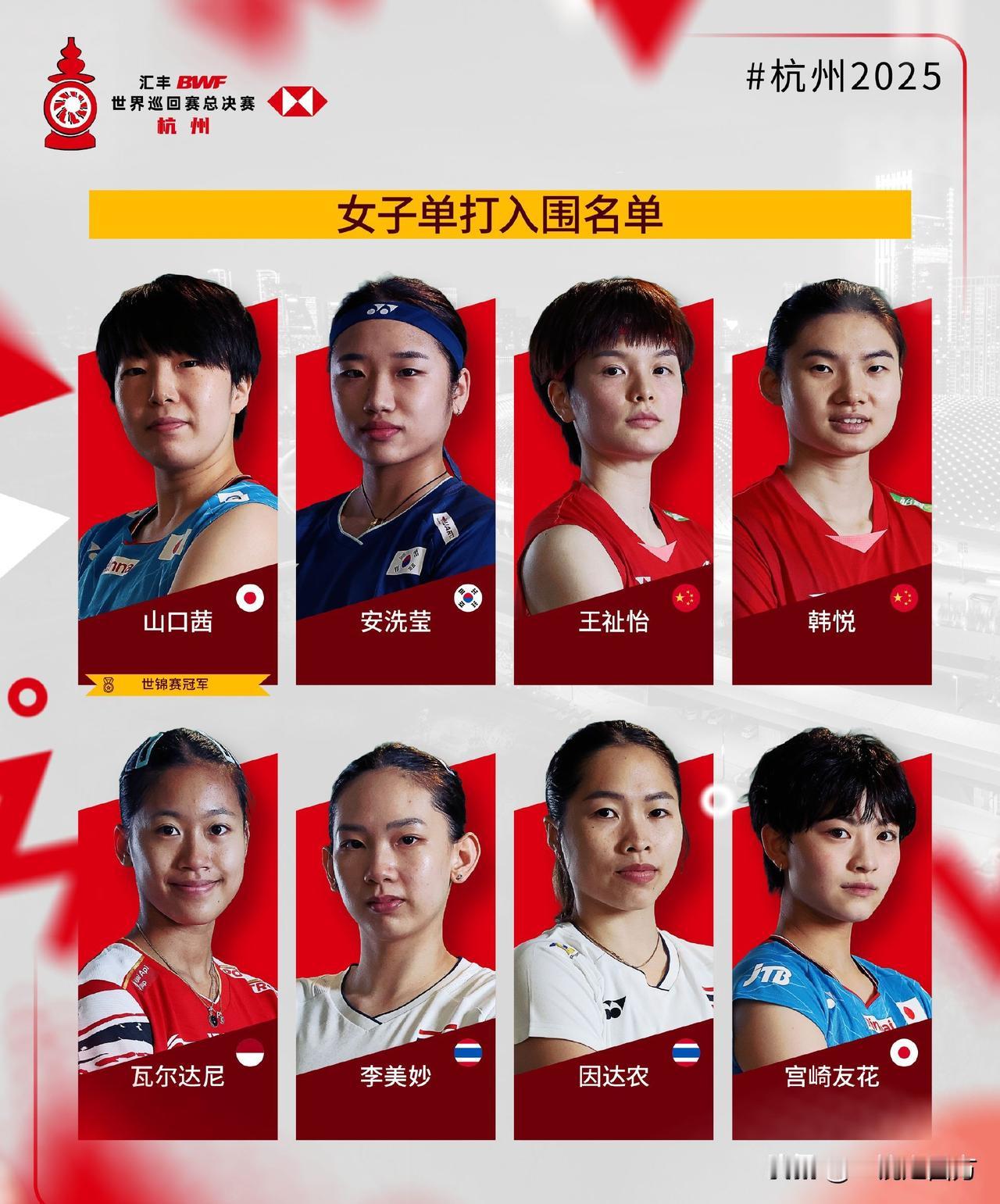 世界羽联年终总决赛将于12月17日至21日在杭州奥体中心开战,中国队拿到9个席位,其中男双仅有梁王组合一对参赛,其他四个项目都是满额出战,男单仍然是石宇奇和李诗沣,女单陈雨菲没能入围,王祉怡和韩悦将携手出战,女双再无“凡尘”,贾一凡将携手张殊贤,与刘圣书/谭宁共同出战,混双是冯彦哲/黄东萍、蒋振邦/魏雅欣两对顶尖组合出战。