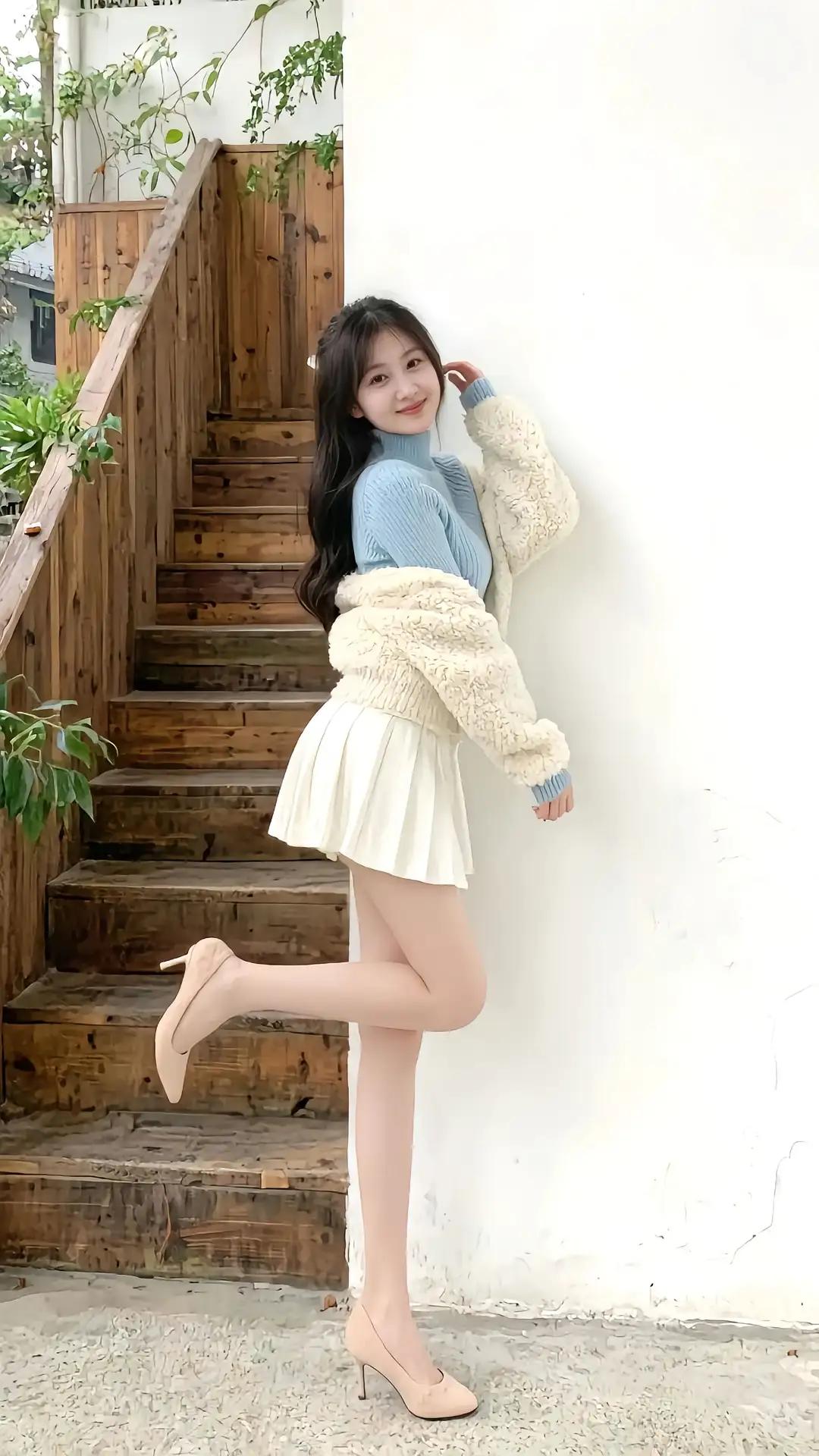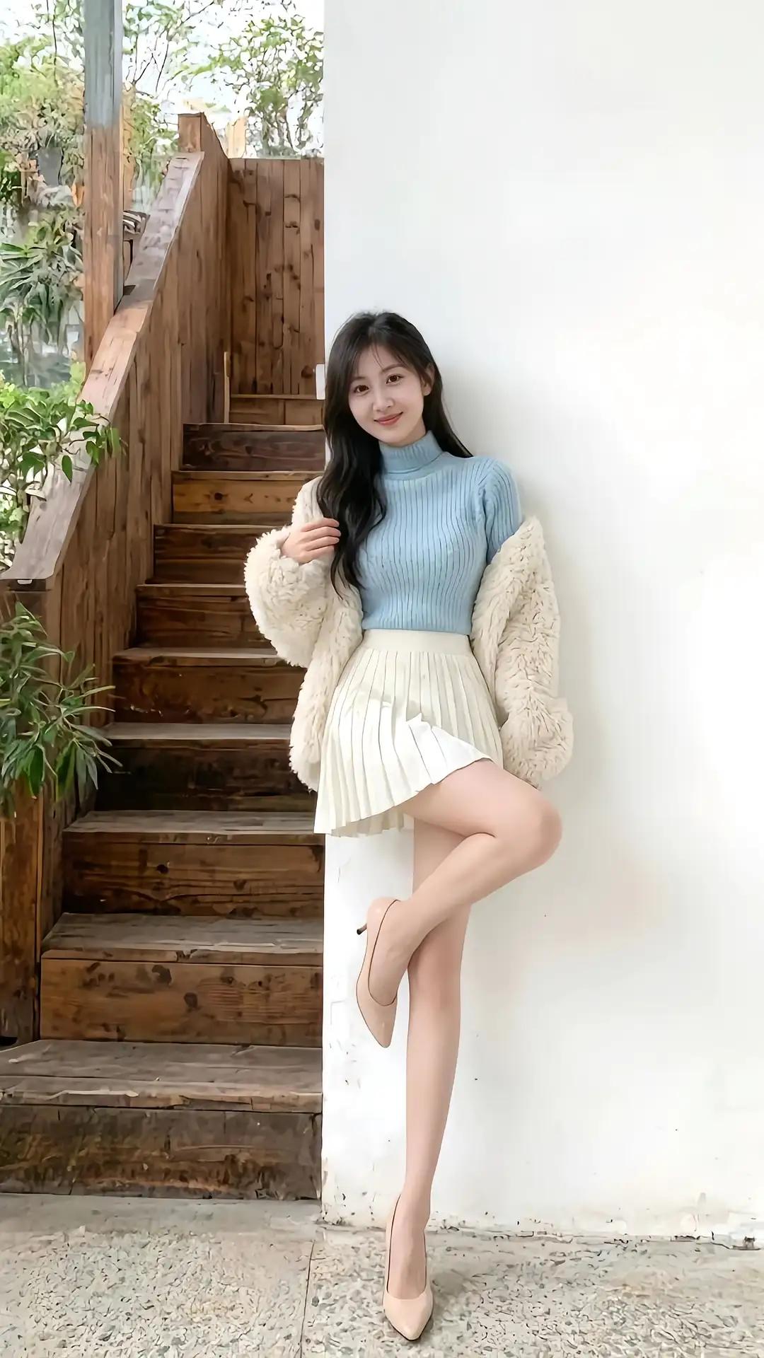 《木质楼梯旁的微笑》 阳光穿过树叶的缝隙,在浅灰色的水泥地上织出细碎的金网。她站在木质楼梯旁,白色毛绒外套的绒毛被风拂起,像一团轻盈的云。浅蓝高领毛衣裹着脖颈,百褶短裙下摆微微晃动,与脚上的浅色高跟鞋一同勾勒出柔和的弧线。 楼梯的棕褐色木板泛着温润的光泽,每一道纹路都像被岁月抚摸过的痕迹。绿萝从阶梯缝隙里探出头,叶片上还凝着未干的晨露,与远处白墙上的爬山虎遥相呼应。她双手交叠在胸前,指尖无意识地摩挲着外套袖口的珍珠纽扣,仿佛在等待某个约定好的时刻。 风掠过时,裙摆与发丝同频起舞。她的目光投向楼梯转角处,那里有只橘猫正蜷在第三级台阶上打盹,尾巴尖偶尔扫过垂落的常春藤。这个瞬间被定格成永恒——阳光恰好漫过她的肩头,在睫毛下投出蝶翼般的阴影,唇角的弧度比身后攀援的三角梅更明媚。 远处传来教堂钟声,她忽然向前半步,高跟鞋跟叩响地面,惊醒了台阶上的猫。绿萝叶子簌簌颤动,露珠滚落时折射出彩虹,而她已转身握住楼梯扶手,裙摆旋开如初绽的铃兰。木质台阶在脚下发出轻微的吱呀声,像是替她说出了那句未出口的"你好"。 当她的身影消失在楼梯尽头,阳光依旧在水泥地上流淌,绿萝仍在风中摇曳,只有台阶上残留的香水气息,证明某个关于等待与相遇的故事,曾在这个秋日的楼梯旁悄然发生。