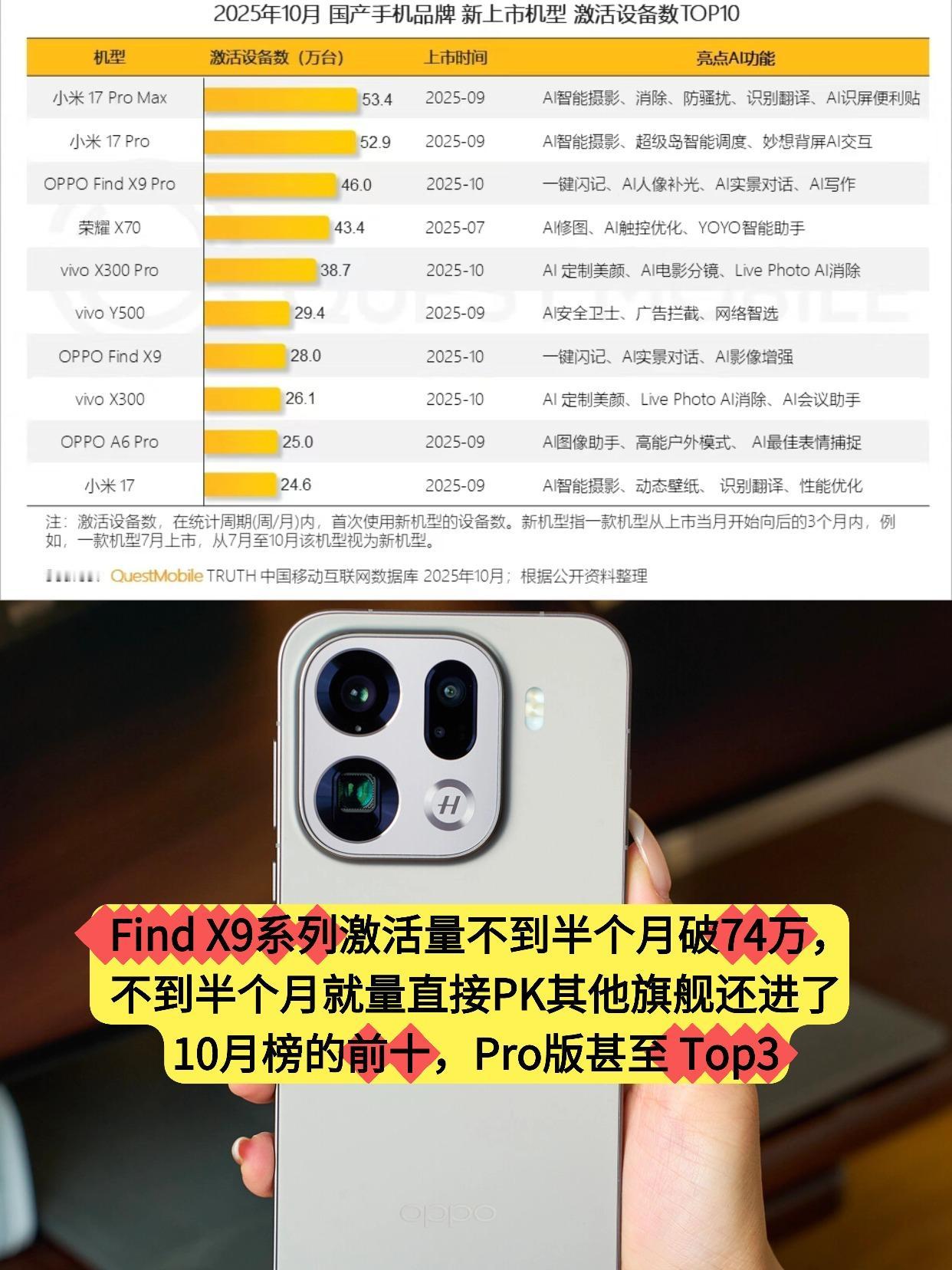 知道Find X9系列火,但半个月激活量也太离谱了 国产手机已经发展到这地步了吗? 之前跟风莎莎入了同款OPPO Find X9追光红 颜值质感都很不错,尤其拍照很适合我这种旅游党 所以知道这代产品力强,销量肯定不差 但真没想到能爆成这样😯 ⚠️刚刷到QuestMobile的数据: 10月国产旗舰激活榜:OPPO Find X9 系列激活量不到半个月破74万 直接PK其他新上市机型进了10月榜的前十,Pro版甚至Top3 这什么水平??绝对是爆款中的爆款了吧 而且之前就听说,OPPO Find X9系列在海外🌍销量同样火爆 新加坡和泰国等东南亚市场Pro版销量至多增长至 3倍 甚至西班牙市场 Pro 版本已售罄缺货。 真·销量怪物👾 我当时入的还是“追光红”,贼难抢😆 之前全国断货根本抢不到,现在产能跟上终于能买到了! 有姐妹也在用同款吗? 快让我看看你们的手机壳搭配! OPPO Find X9