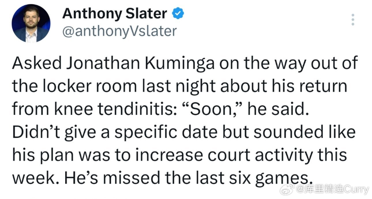 Anthony Slater:“昨日我问库明加何时能恢复,他说很快,但没有给具体日期。”此前,科尔被问到库明加的伤情时表示,他没有任何进一步明确消息,得由库明加本人告诉你们情况。