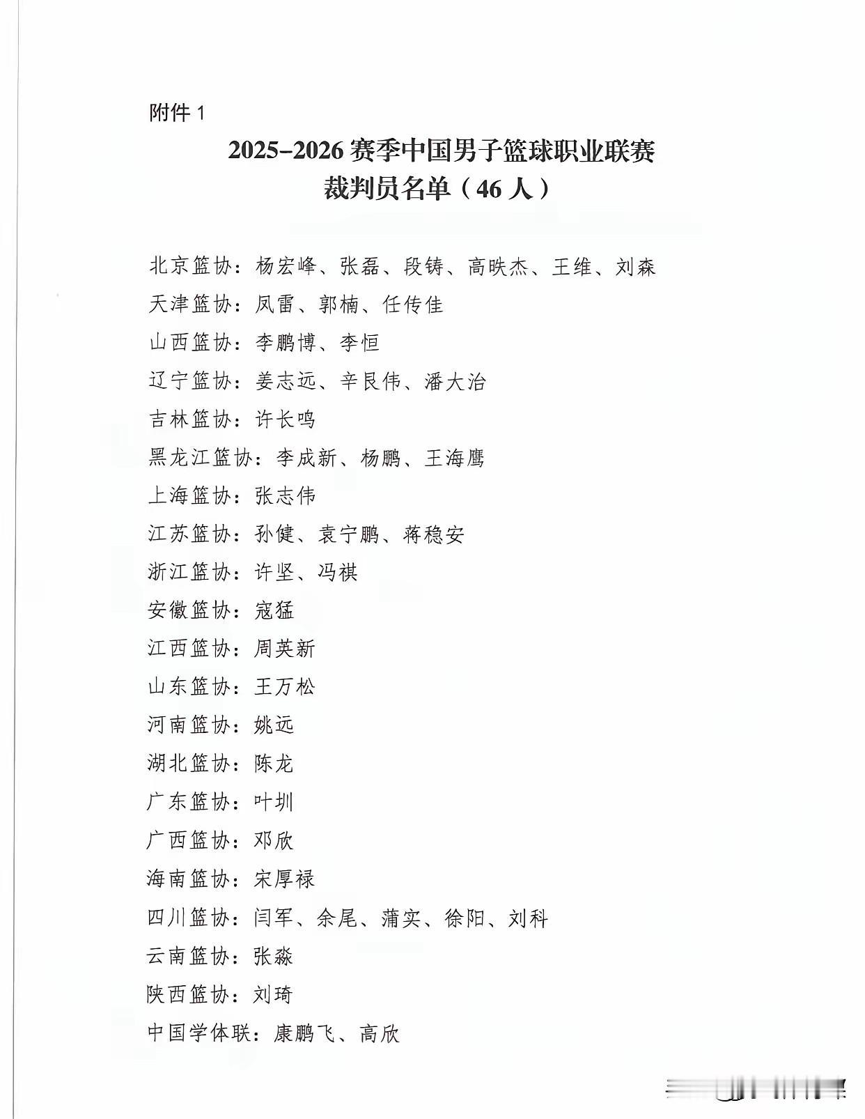 中国篮协公布CBA2025-2026赛季46位裁判员,四大名哨在列: 这份名单中均是各省地方篮协代表,其中北京篮协6人,四川篮协5人,辽宁,天津,江苏和3人,而没有CBA球队的黑龙江篮协也有3人,意外的是篮球氛围最火爆的广东竟然仅1人入选,是不是有点意外? 不过这份名单中都有球迷最熟悉的四大名哨,郭楠,孙健,闫军,杨宏锋依然在列,这四人均是国际级裁判,执法水平非常高,尤其是孙健还曾执法2025年男篮亚洲杯小组赛和淘汰赛的比赛,也得国际篮联的认可,希望能在他们的带领下,CBA新赛季更加公平,公正,严谨,给球迷带来更精彩的比赛。