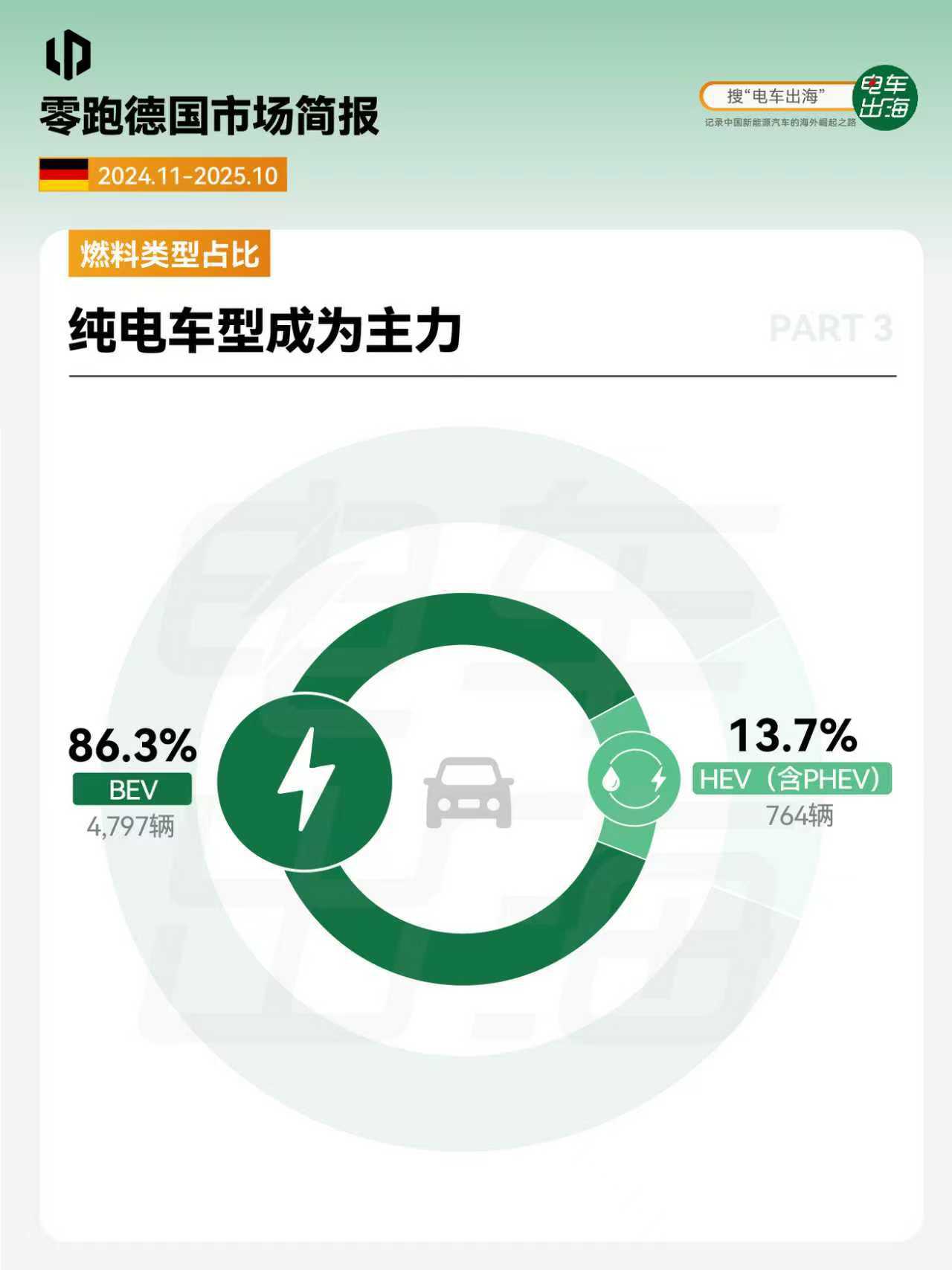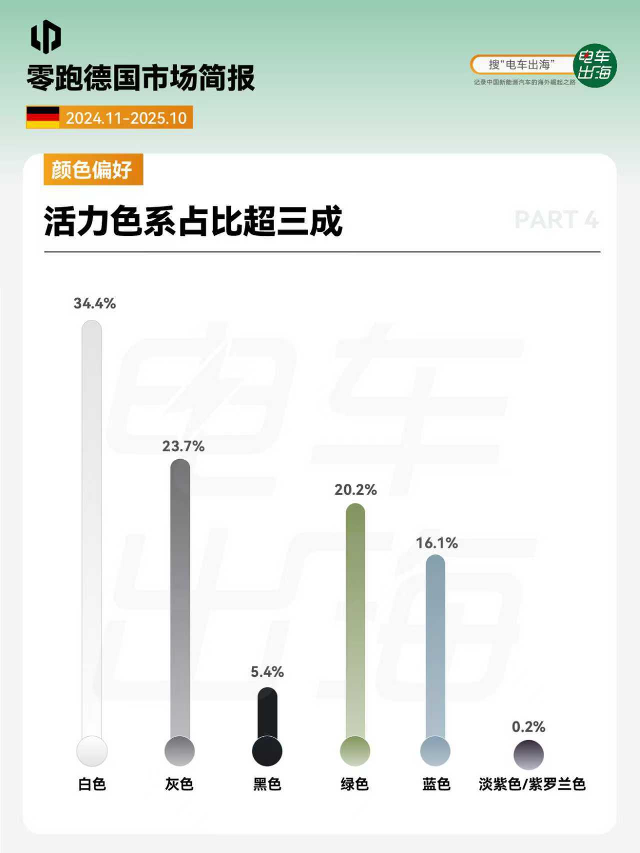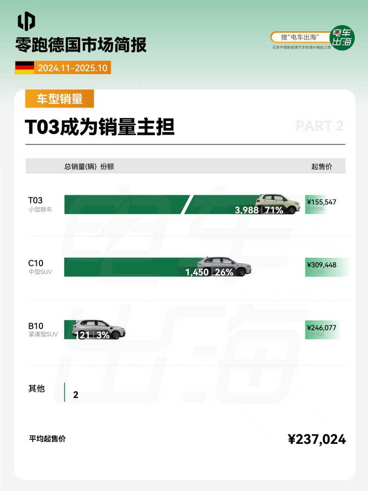 1. 市场表现 销量黑马式突破,上市一年,跻身中国新能源品牌第三,中国新势力品牌第一。 2. 车型销量和价格 德国在售车型平均起售价23万起,T03灵活试探,C10双线布局,B10冲击主流,产品三部棋,在欧洲走出一条漂亮上升曲线。 3. 燃料类型占比 纯电车型成为主力,占比超86%,增程补齐能源结构。 4. 公私占比 首次上牌私人车主占主力,占比超73%。 5. 颜色偏好 活力色系占比超三成。 6. 门店布局 背靠斯特兰蒂斯渠道,全德门店超过100家,16个联邦州均设有门店。 7. 品牌评价 驾控出色,性价比之选。 完整版简报,前往知识星球查看。