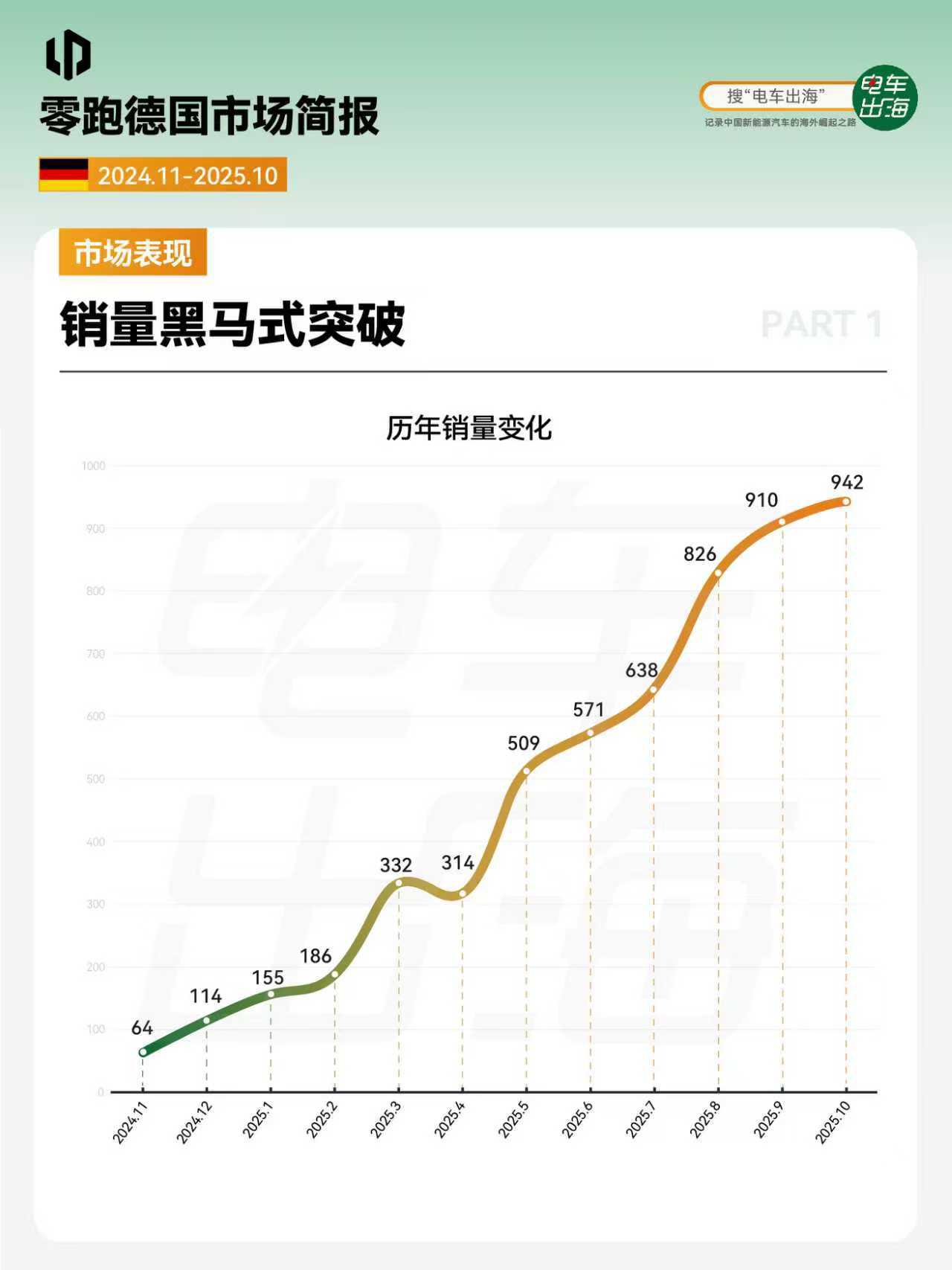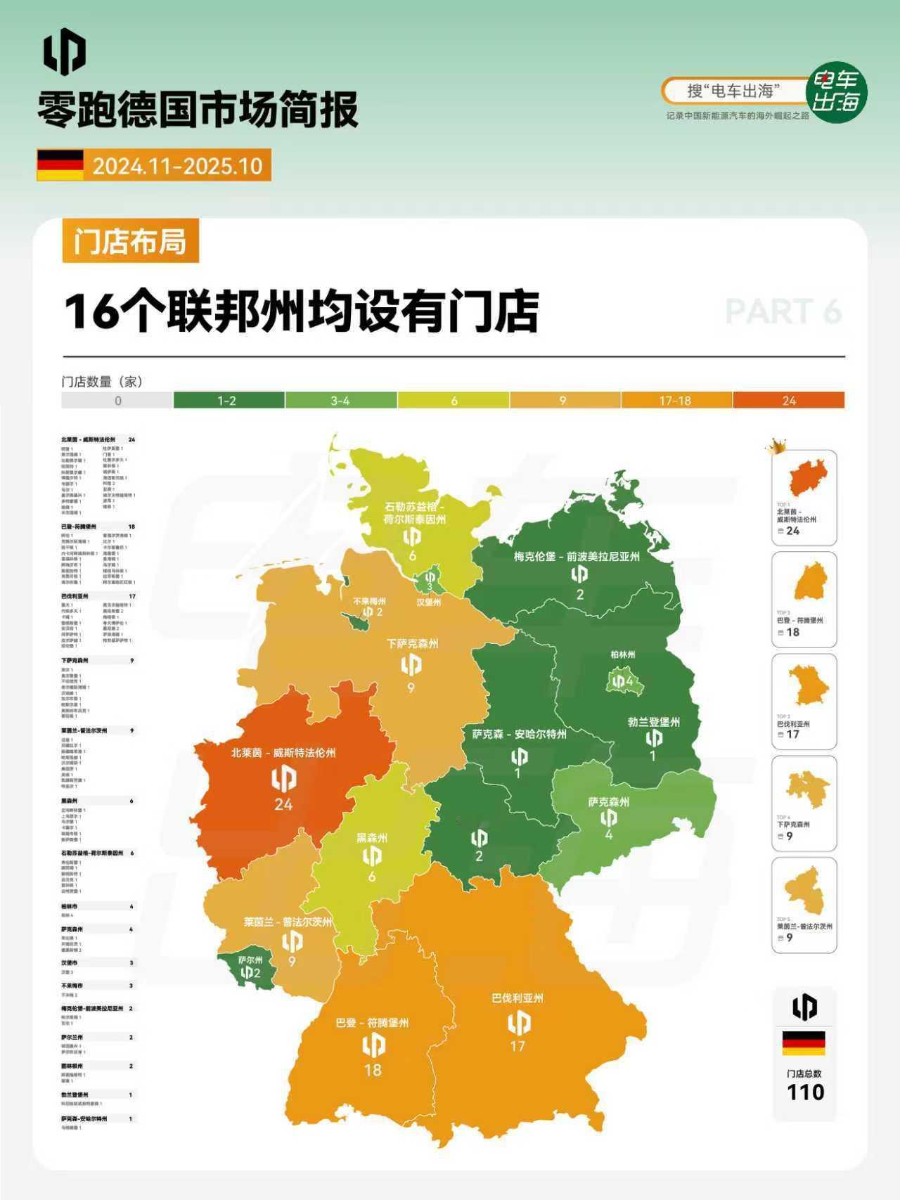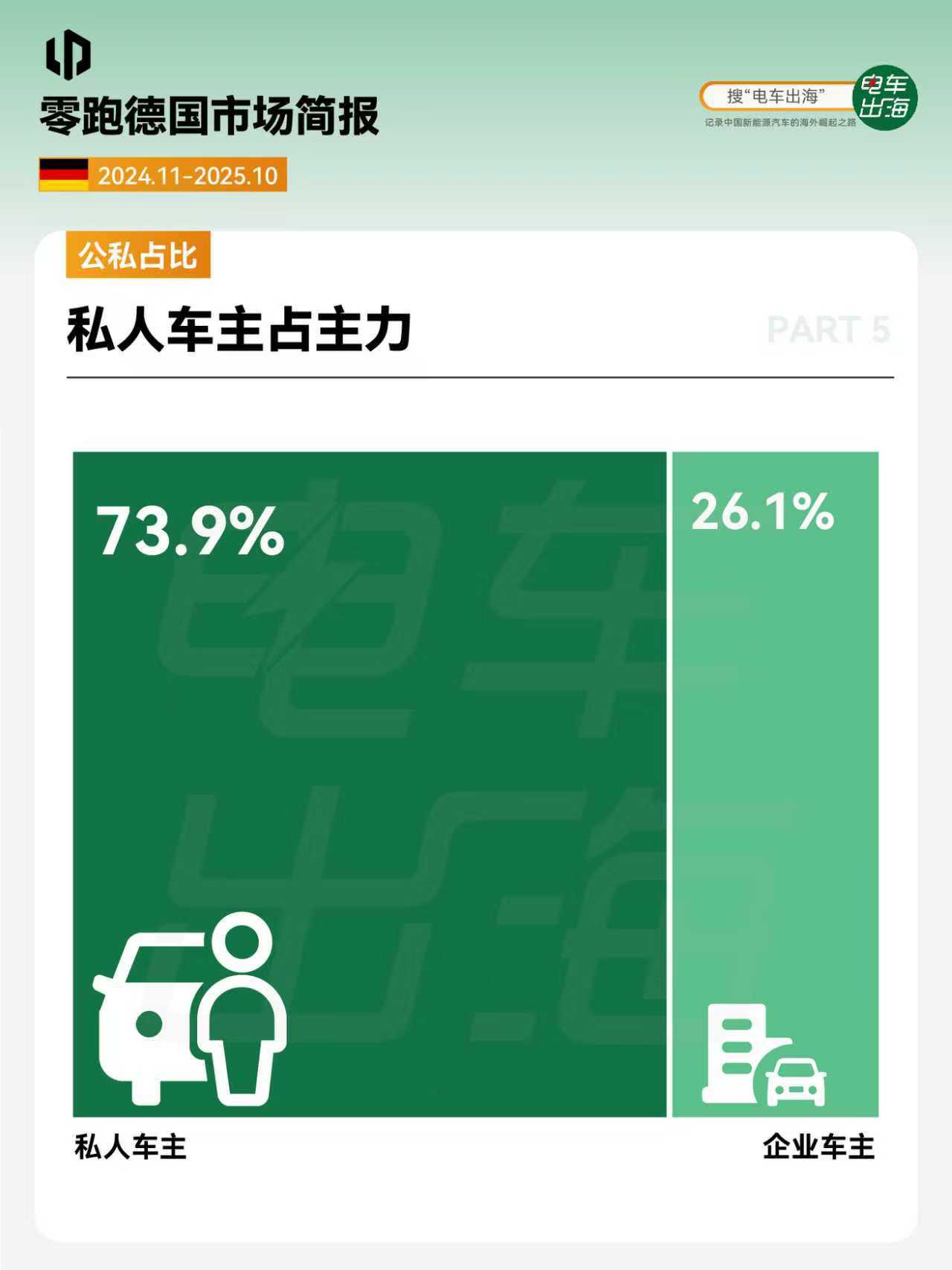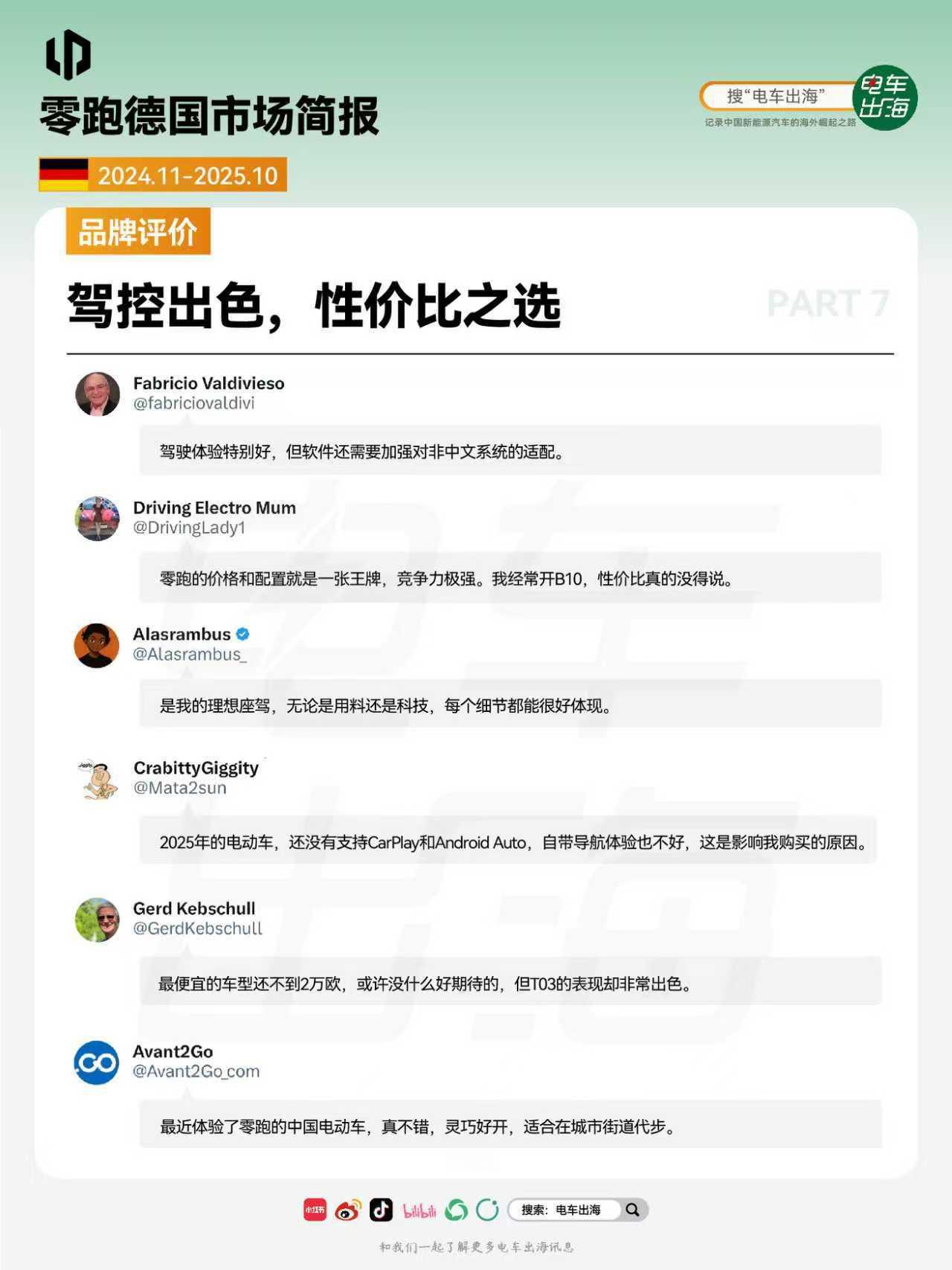 1. 市场表现 销量黑马式突破,上市一年,跻身中国新能源品牌第三,中国新势力品牌第一。 2. 车型销量和价格 德国在售车型平均起售价23万起,T03灵活试探,C10双线布局,B10冲击主流,产品三部棋,在欧洲走出一条漂亮上升曲线。 3. 燃料类型占比 纯电车型成为主力,占比超86%,增程补齐能源结构。 4. 公私占比 首次上牌私人车主占主力,占比超73%。 5. 颜色偏好 活力色系占比超三成。 6. 门店布局 背靠斯特兰蒂斯渠道,全德门店超过100家,16个联邦州均设有门店。 7. 品牌评价 驾控出色,性价比之选。 完整版简报,前往知识星球查看。