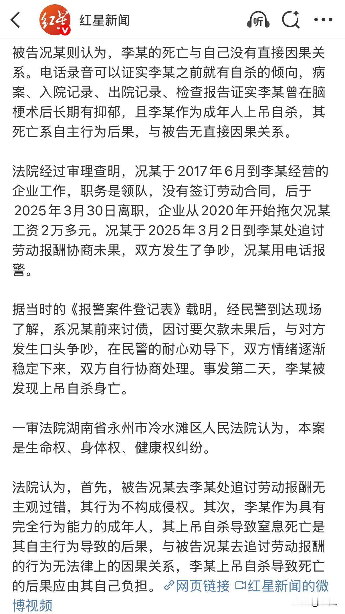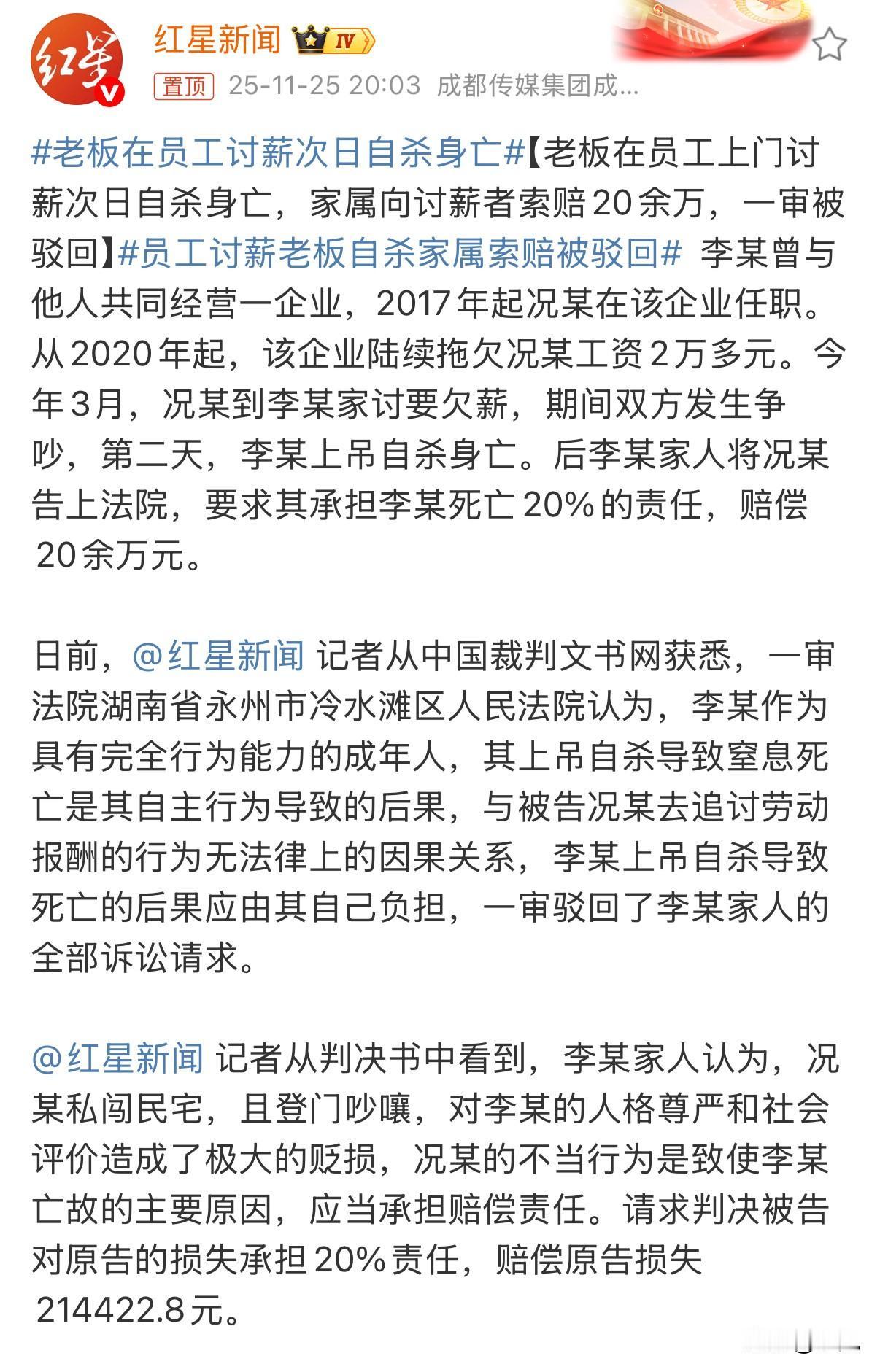 讨薪2万,老板次日自杀,家属反要员工赔21万!法院判决来了 湖南永州,员工上门要回自己的2万块工资,第二天,老板上吊身亡。随后,员工竟被老板家属告上法庭,索赔21万元。 最近,一审判决结果公布,法院驳回了家属的全部诉讼请求。 况某从2017年开始,在一家企业当领队,干了快八年。 从2020年起,公司就开始拖欠他的工资,累计有两万多元。 今年3月2日,况某来到了老板李某的家里,想要回这笔辛苦钱。 双方话不投机,发生了争吵。 况某当时还报了警。 民警到场了解后,登记的是“讨要欠款未果发生口头争吵”,经过劝导,双方情绪稳定下来,说好自行协商。 谁都没想到,第二天,李某被发现在家中上吊身亡。 悲剧发生后,李某的家人一纸诉状将况某告上法院。 家属认为,况某“私闯民宅”、“登门吵嚷”,贬损了李某的人格,是导致李某自杀的主要原因。 他们要求况某承担20%的赔偿责任,也就是21万多。 面对指控,况某感到既冤枉又无奈。 他辩解道,李某的死亡与自己没有直接因果关系。 他提到,有证据显示李某在脑梗手术后长期有抑郁倾向。 他认为,一个成年人的自杀是其自主行为。 法院经过审理,明确了两个关键点: 第一,况某上门讨薪,是行使自己的合法权利。他没有采取暴力或侮辱手段,事后还主动报警,行为没有过错,不构成侵权。 第二,李某是具备完全行为能力的成年人,其自杀身亡是自身选择的结果。法院认为,讨薪行为与死亡后果之间,不存在法律上的因果关系。 这个判决,守住了劳资纠纷中的一条基本底线。 如果因为债务人自杀,就让合法讨薪的员工承担责任,那以后谁还敢去要自己的血汗钱? 法律保护合法的债权,也不能因为发生了悲剧,就颠倒是非。 当然,这背后是两个家庭的悲剧。 老板李某经营不善,身缠疾病,最终选择轻生,令人叹息。 员工况某只想拿回自己被欠的工资,却卷入一场人命官司,也是身心俱疲。 好在,法律最终分清了对错。 您觉得法院这么判合理吗? (信息来源:红星新闻)