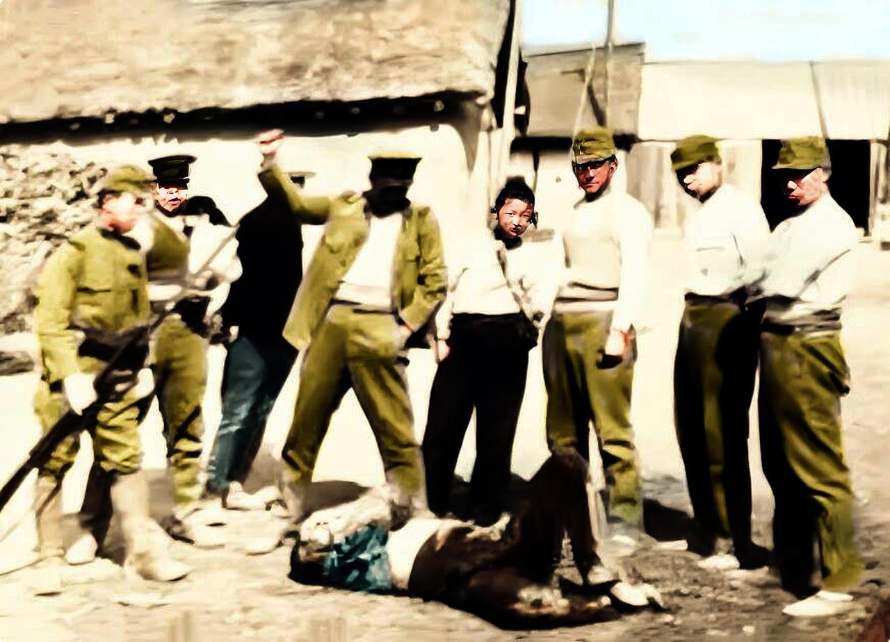 这不是电影场景,而是侵华日军残害中国平民的真实写照。 画面中,一个穿着昭五式军服的日本军官一手抄兜,一手举着鞭子正在抽打倒在地上的平民百姓,神态悠闲地仿佛在玩一种小游戏。 几名穿着九八式军服的日本士兵在旁边看着热闹。 躺在地上百姓的上衣在鞭子的抽打下变得支离破碎,他仰面躺在地上,不敢有丝毫的挣扎,只能用双手绝望地捂着脸。