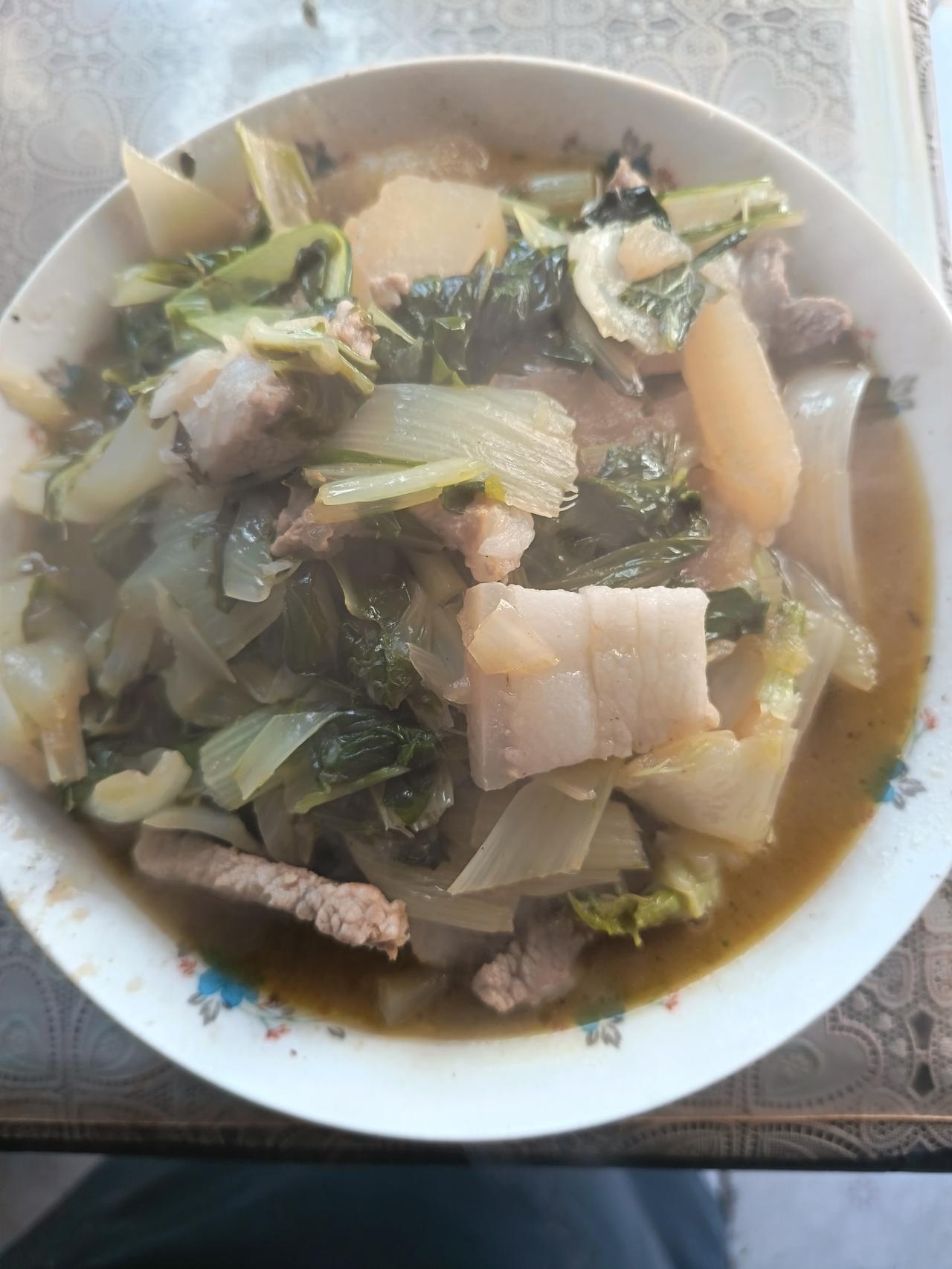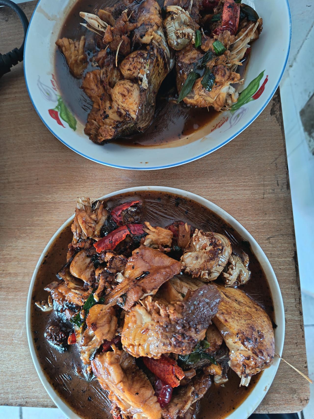 开饭了,两菜一汤! 本打算用鲢子烧酸菜鱼的,临时改了主意! 老伴早上收了下在河里的网,刚好网了海虾和小螃蟹。 野生海虾、螃蟹和家养鲢子一起煮,起鲜味道好。 今天中餐:红烧鱼、大白菜烧肉,外加青萝卜炖鱼头汤搞定!