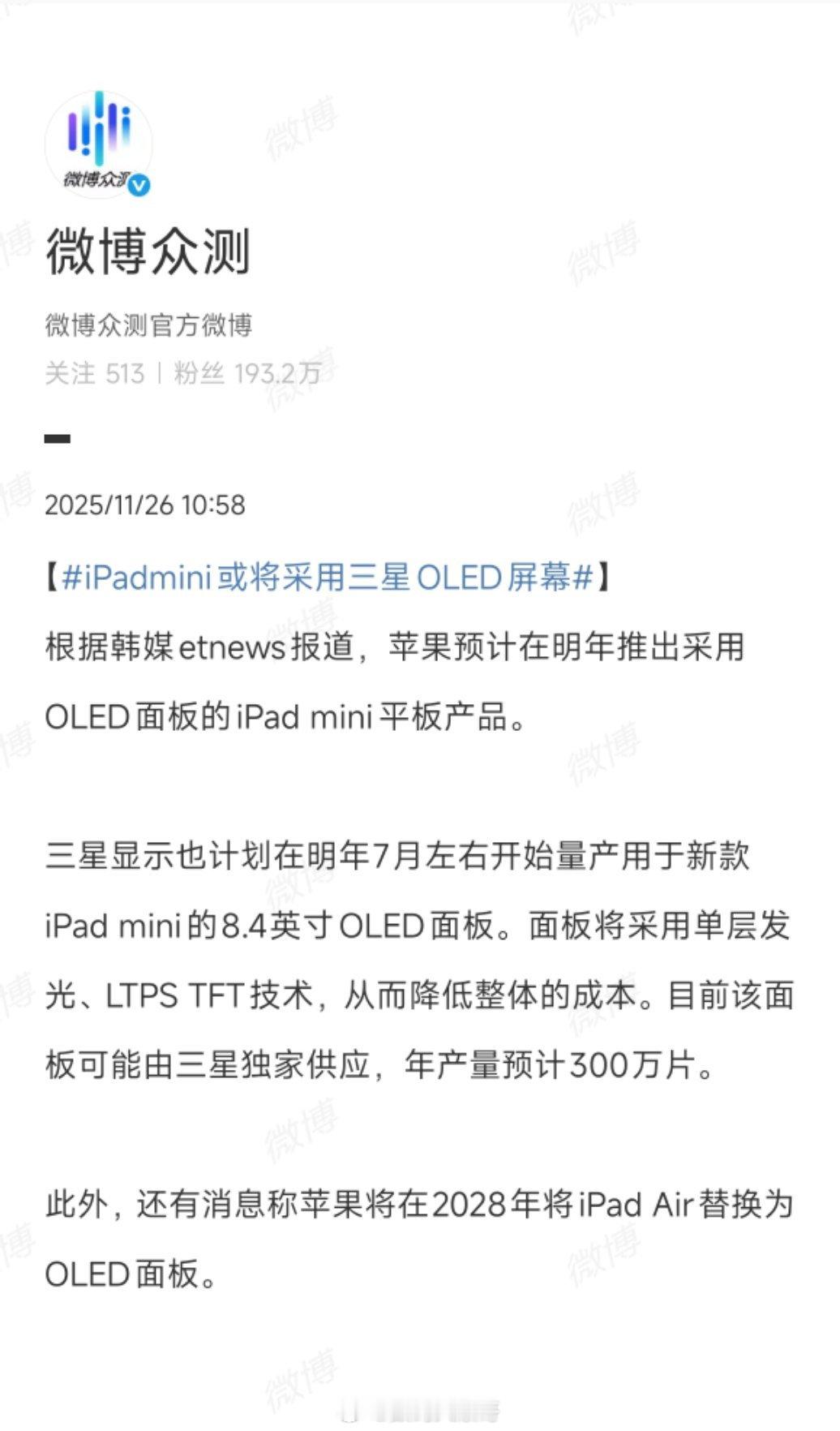 iPadmini或将采用三星OLED屏幕卧槽,iPad mini终于要上OLED屏了!明年就上?三星独家供应,但好像一年就300万台,估计得抢。不过搞笑的是,iPad Air居然要等到2028年?搞不懂,苹果这产品线更新着实有点那啥~