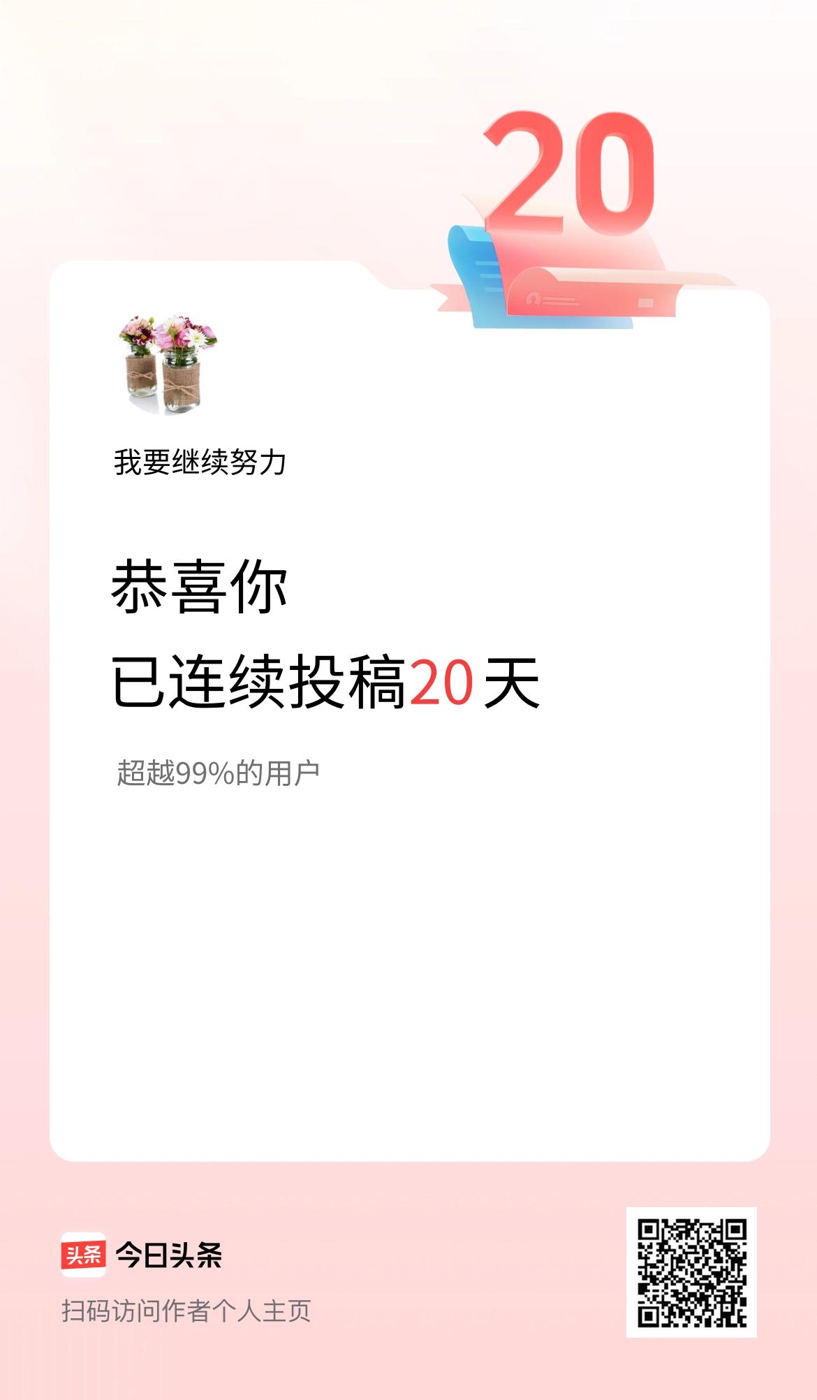 我在头条连续投稿20天 没想到我已经坚持了20天,继续,继续!