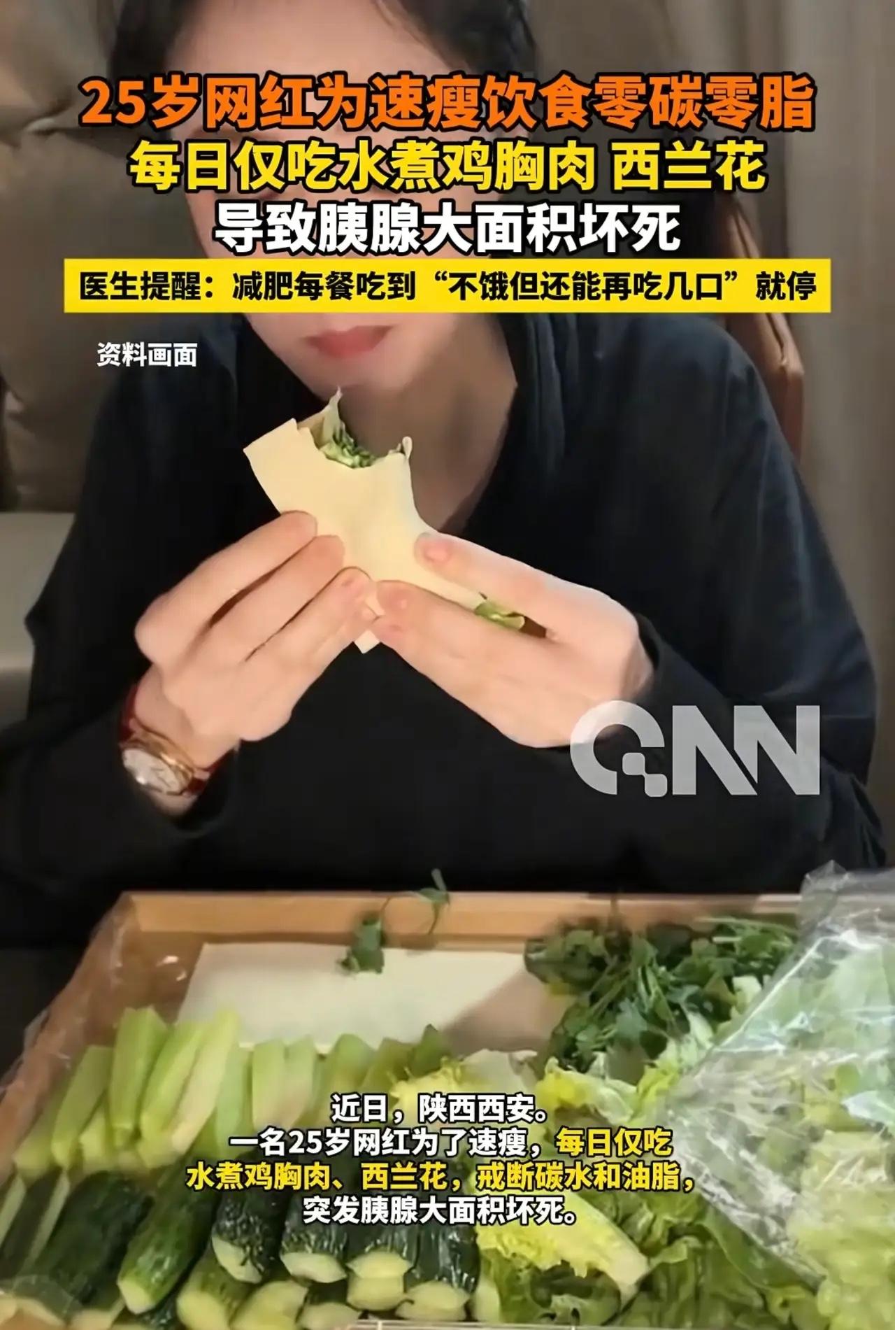 25岁女网红为瘦身丢了命! 连续6个月只吃鸡胸肉+西兰花,一口脂肪不碰,最终胰腺坏死离世,这哪是减肥,分明是在透支生命! 很多人以为“零脂肪”就是健康,却不知道身体缺了健康脂肪根本转不动。就像机器少了润滑油会报废,胰腺得靠脂肪刺激才会分泌胰液,长期断脂让胰液堆积,直接“消化”自己的器官,胆囊也会因缺乏收缩信号长结石。 所谓的快速瘦身,不过是用健康换短暂的纤瘦。医生早就说过,减肥不是极端节食,而是均衡三大营养素,热量缺口控制在300-500千卡就够了。 为了迎合畸形审美,把身体逼到绝境,真的太不值。
