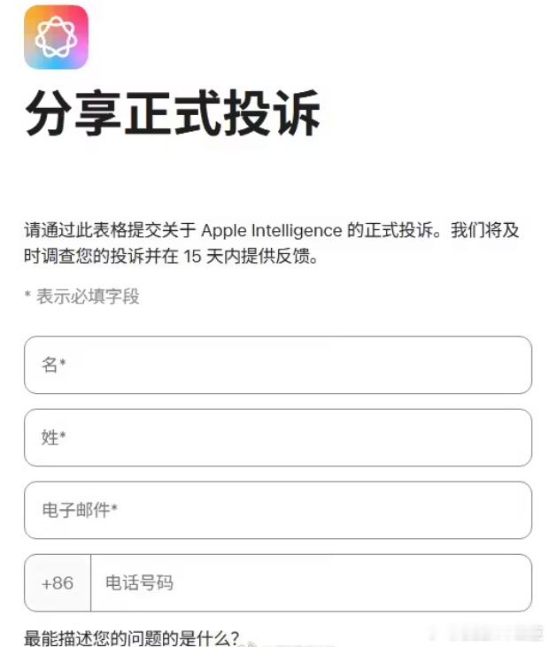 苹果AI中国大陆投诉页面上线苹果 Apple Intelligence 在中国迟迟未能落地,引起大量苹果用户不满。不过,苹果 Apple 智能入华进程最近出现了更多新动向,例如苹果官网新上线的一份 Apple Intelligence 反馈表单,手机号必须填写中国大陆的 +86 电话号码。这一要求表明,该表单主要面向位于中国大陆的苹果用户,而非新加坡等其他使用中文的地区。iOS 26.2 将是在今年结束前发布的最后一版系统更新,但目前还没有看到确切证据表明苹果 Apple Intelligence 会在该版本中加入对中国地区的支持。