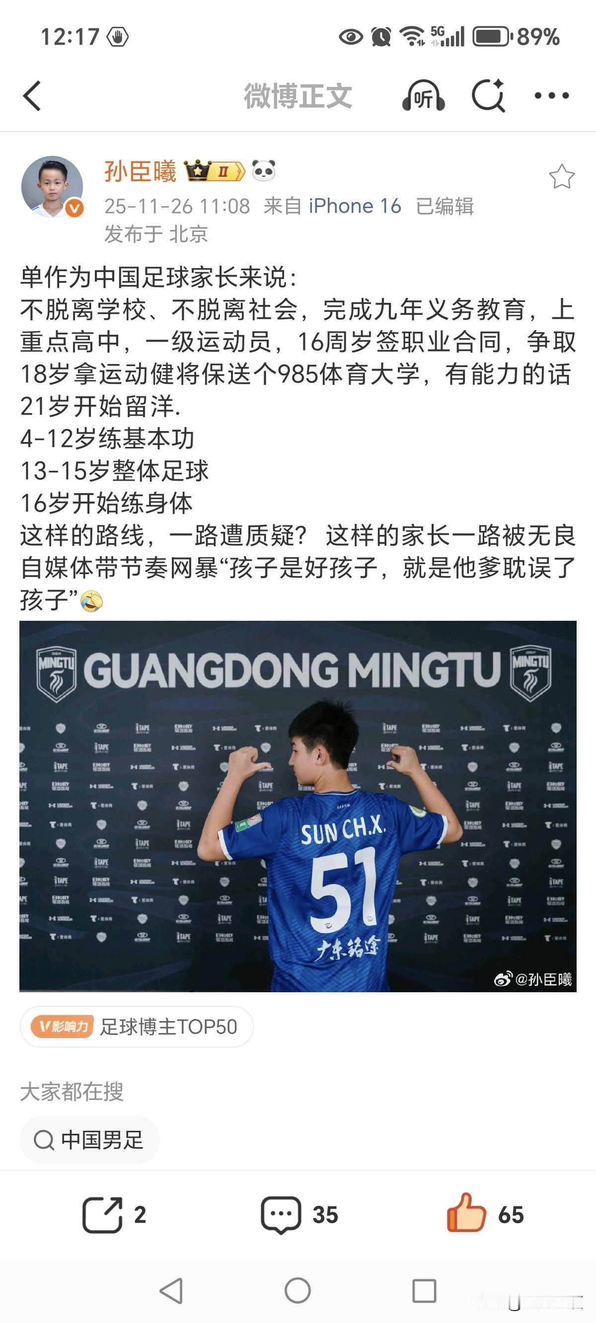 反击正式打响!CC孙臣曦之父孙守东,炮轰无良自媒体带节奏[打call] 北京时间11月26日,前09足球小将CC孙臣曦之父孙守东,在其个人社交媒体上炮轰无良自媒体,带节奏网暴“孩子是好孩子,就是他爹耽误了孩子”[流泪] 文中,孙守东详细列举了他给儿子孙臣曦做的规划: 一、4-12岁练基本功;13-15岁整体足球;16岁开始练身体[加油] 二、不脱离学校、不脱离社会,完成九年义务教育,上重点高中,拿到一级运动员证[得意] 三、16周岁签职业合同[加油] 四、争取18岁拿到运动健将证书,保送到985体育大学[点亮平安灯] 四、如果再有能力的话,21岁开启留洋之路[击掌] 孙守东表示,其实原本没有什么对错,每个人都有自己的路,而不是不去清华附中就废了,不留洋又废了,有个这样的爹又彻底废了,反正就是废..…过几天还会说踢个中乙也废的…… 客观而言,孙守东作为孙臣曦的亲爹,给儿子做了一个很负责任的规划,每一步都走的很踏实,给了孩子一个人生稳稳的兜底,起码不会让孩子一旦踢不出来,没有第二条路可选的窘境[赞] 不得不说,作为亲爹孙守东是合格的,给了孩子规划了一个稳妥的未来,毕竟谁也不能保证每一个有天赋的孩子,都能踢上职业足球,踢上职业的路上,不确定性因素太多了,本身足球这个项目成才率也是非常之低[泪奔] 时至今日,从家长的角度来看,可以很负责的说,孙臣曦是个好孩子,他亲爹也没有耽误孩子。反倒是那些听信了干爹忽悠,盲目选择去留洋的家长,可能真的把孩子给耽误了,连孩子本应该可以有的人生兜底给弄丢了[吃瓜群众]
