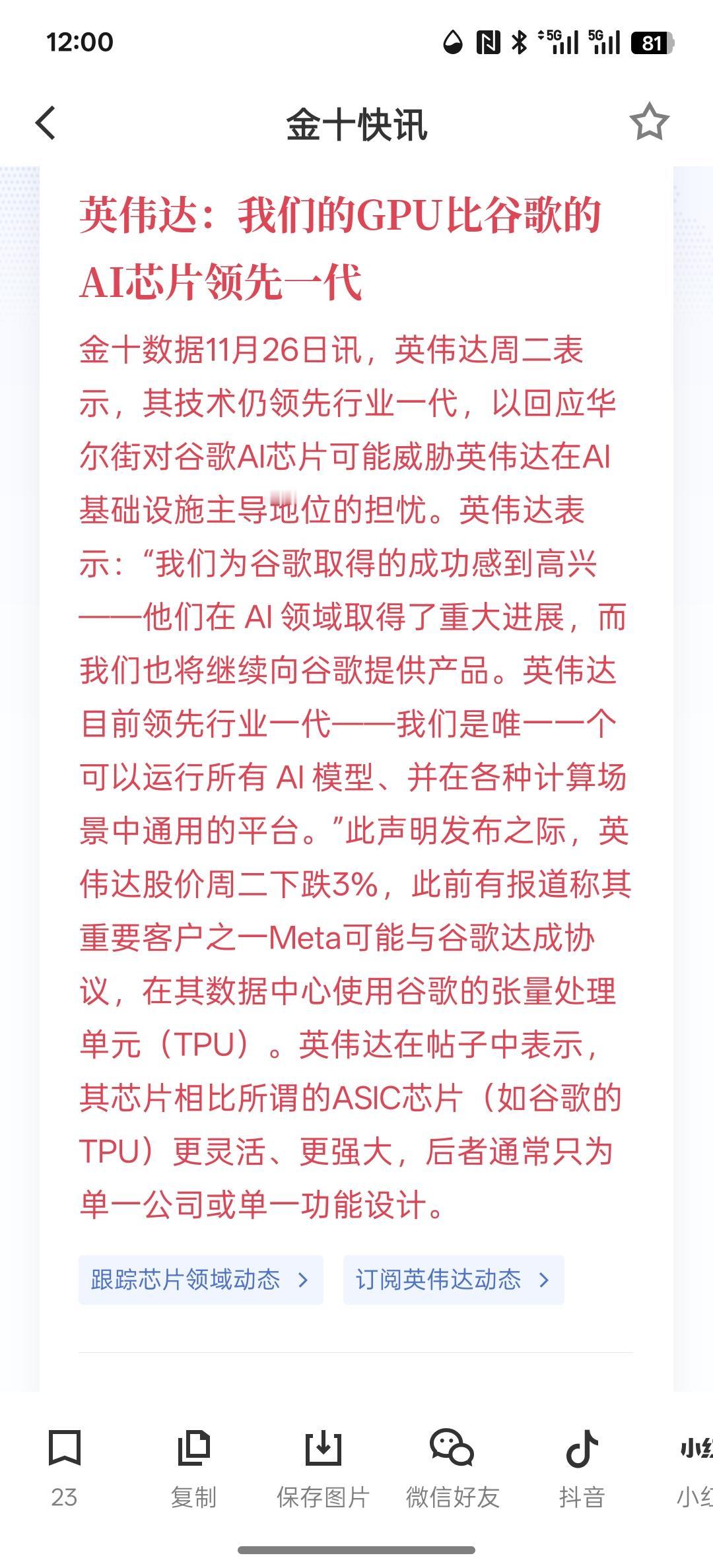 英伟达:我们的GPU比谷歌的AI芯片领先一代,看来英伟达着急了,最近因为谷歌的AI芯片直接爆出来过后,英伟达的市值开始下跌,而且市场对芯片的选择又有了新的方向,所以英伟达的AI人工智能芯片将不是唯一的选择,在我们国内的话,已经实现了自主研发的AI芯片。那英伟达在中国的AI芯片市场销售额度已经接近为零!所以英伟达他本以为在AI算力芯片拥有绝对领先的垄断地位,可是随着谷歌的技术不断的推进,它的市场份额将会被瓜分,巴菲特也在买入谷歌的资产,事实证明,发挥的确实有眼光,他也看好未来的AI人工智能发展,选择了投资谷歌!