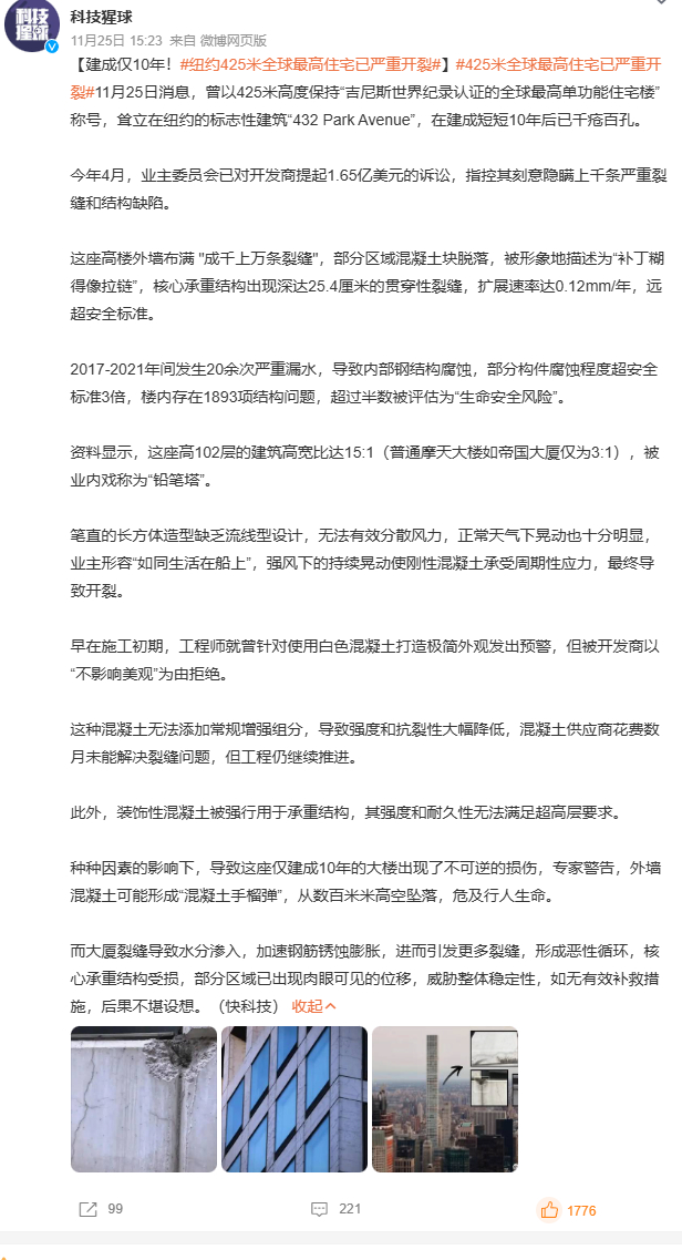 425米全球最高住宅已严重开裂当“全球最高”遇上“严重开裂”,这场闹剧让人痛心。从热门评论能感受到业主们的无奈与无助,他们花高价买下的不仅是房子,更是对美好生活的向往。如今,裂缝却成了他们心中的梦魇。开发商不能逃避责任,相关部门也不能坐视不管,必须尽快查明原因,修复隐患,让业主们能安心居住。