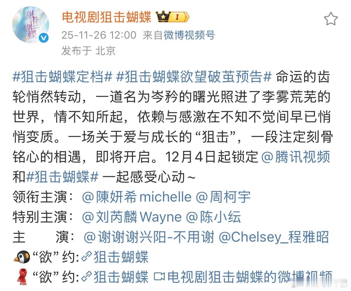 陈妍希、周柯宇《狙击蝴蝶》定档12.4日
