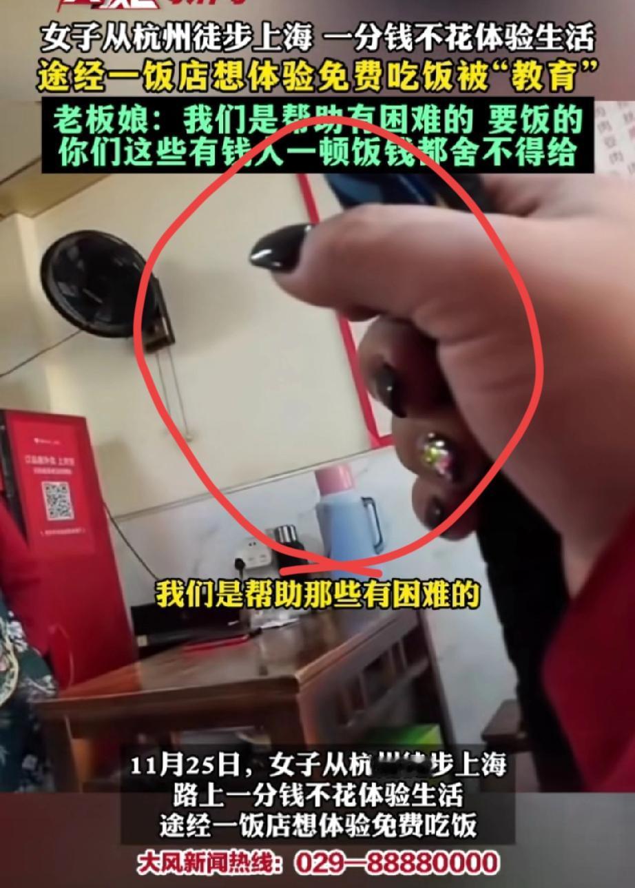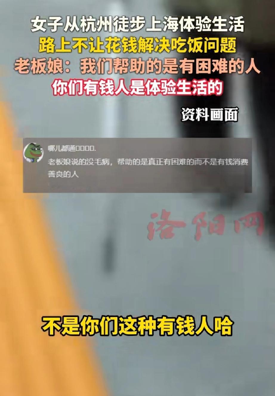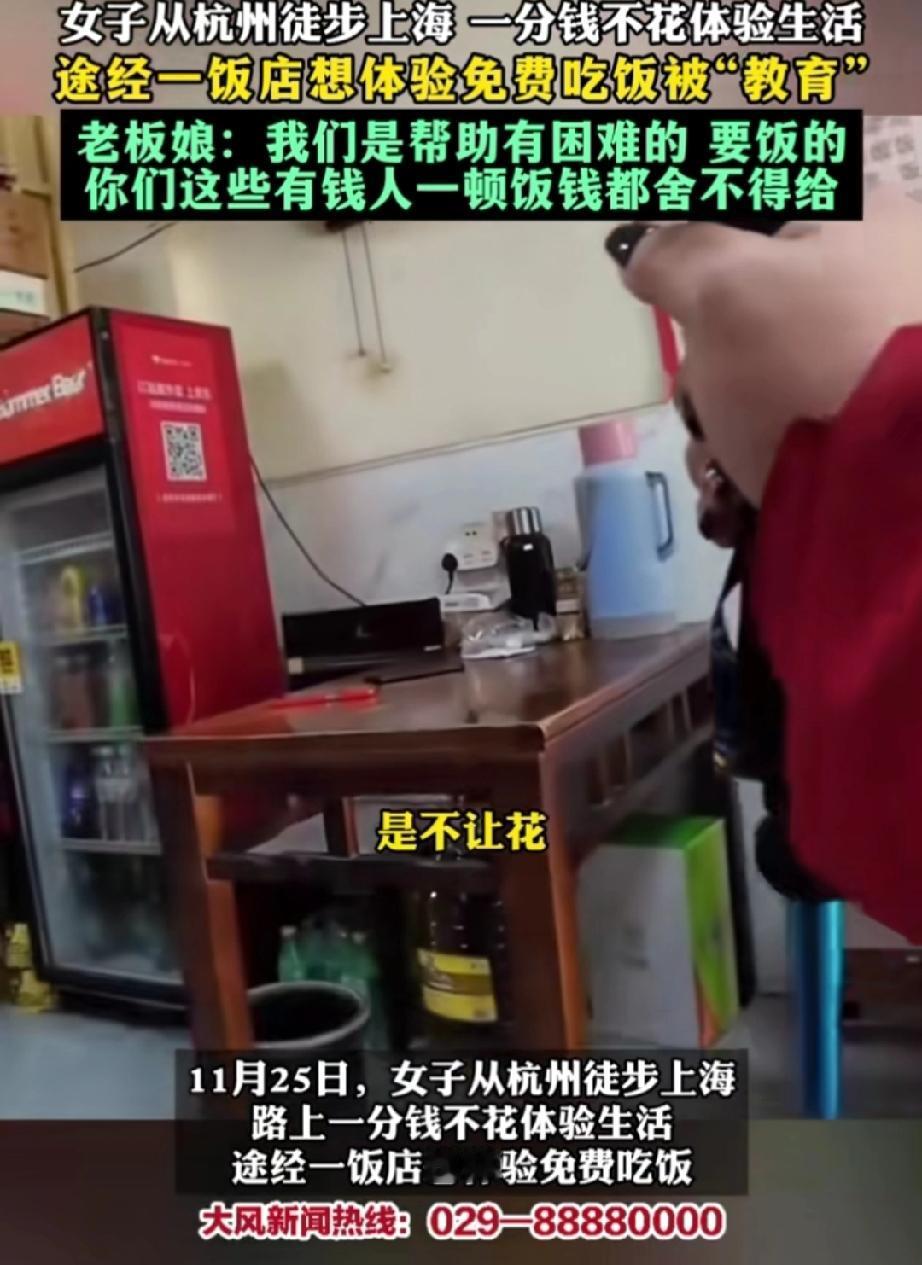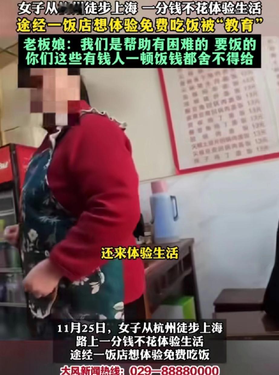 年轻女子手持登山杖,走进一家小餐馆,打算讨一顿饭吃。她对老板娘说道:“我们从杭州徒步到上海体验生活,规定食宿都不花钱,您能给我一顿饭吗?” 老板娘满脸嫌弃地看着女子,说道:“你们这些有钱人体验生活,连一顿饭钱都不想花?我们是帮助那些有困难、讨饭的人,不是帮你们这些有钱人。” 女子听后,既尴尬又气愤,转身便离开了饭店。 事后,女子把“讨饭”的过程发到网上,觉得这位老板娘有些“不善良”。 网友却回复女子:老板娘不给是对的,你这是自己网暴自己的。 瞧瞧这女子,身着名牌运动装,染着黑色的、尖尖的指甲,任谁看了都觉得膈应。 组织这种活动的人,或许是想锻炼参与者的体能,也可能想通过“讨饭”来训练他们的“厚脸皮”。 有时间参加这种活动的人,明明四肢健全、兜里有钱,还要向别人讨吃的,这怎么能行?这不是占人便宜吗? 完全认同饭店老板娘!善良从不是无底线的施舍,而是把暖意留给真正需要的人,不纵容闲人,才是对善意的尊重! 来源:中安在线