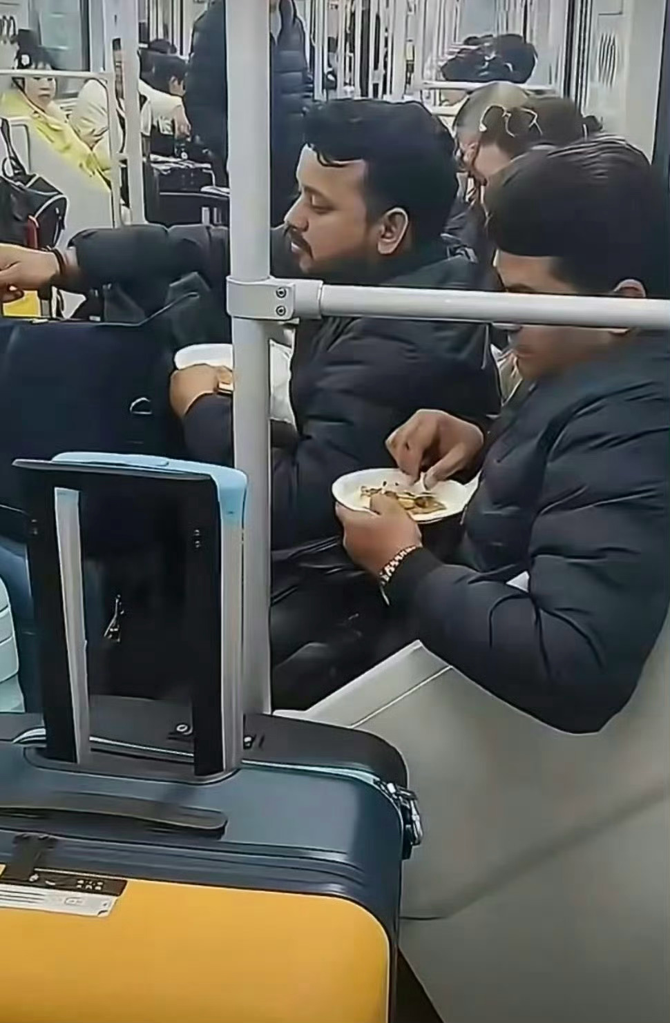 印度人疑似在上海地铁分享手抓饭这特么在地铁上吃上手抓饭了那么明显的食物标识这样还看不懂??