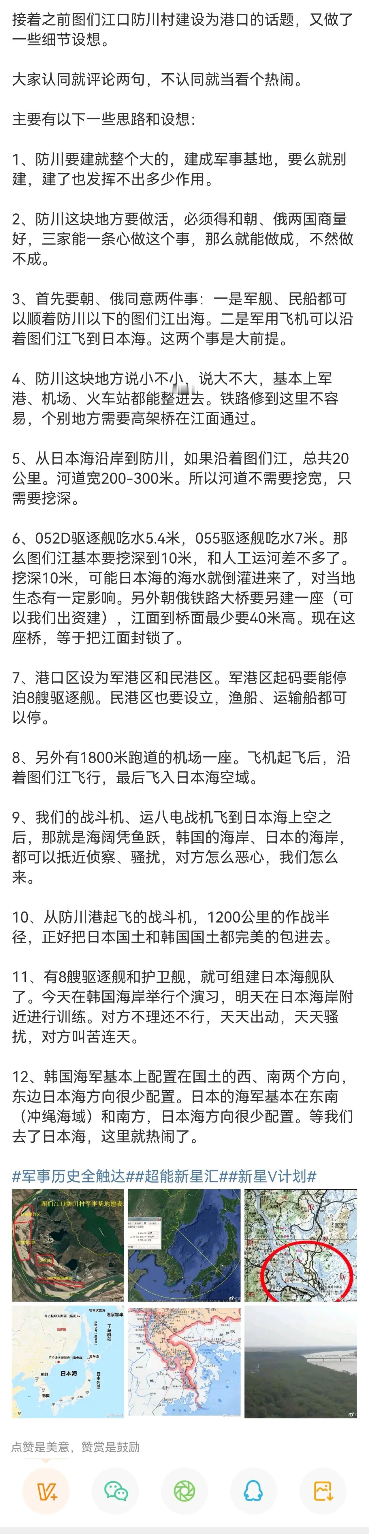 我两年前写了个帖子,建议大力建设吉林省延边州的防川村,中俄朝三国交界的地方,把这个地方发展成一个军港+空军基地。 日本整体国土防御是南重北轻,尤其是日本海方向,几乎没有放置海军和空军军力。(除了金泽) 所以我们在这里搞一支海空军力量,天天经日本海去日本海岸线骚扰,肯定会迫使日本调整防御布局,分散兵力。 当然,我这个想法不一定对,国家肯定有更高层面的考虑。 但是,世上很多事情就是这样,你不去主动骚扰他,他反倒来找你的麻烦。 对待这种小人国家,不能以常理去度量。 用大白话说就是:你不打野狗,野狗觉得你怕它,反倒扑上来咬你。