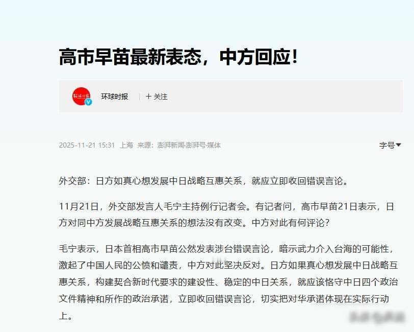 沉默11天后,高市早苗终于“低调”喊话中国,还提了个要求 11月21号那天,高市早苗突然改口了,她没有提到台湾,也没有道歉,更没有撤回那句“台湾有事就是日本有事”,但她说出一句新话,表示愿意发展中日战略互惠关系,这话听起来挺软,其实背后是因为她着急了,就在十一天前,她还在说强硬的话,现在转得这么快,不是因为她良心发现,而是真的扛不住了。 日本经济最近出现不少问题,日元对美元汇率升到1比156,快要接近央行设定的底线,股市持续下跌让人感到不安,国债收益率也在快速上涨,资金外流速度明显加快,中国方面尚未采取全面措施,只在稀土出口和旅游领域做出一些调整,日本市场自己就先出现波动,高市内阁推出的经济刺激方案显得缺乏条理,连日本媒体都提出批评,市场信心一旦下滑,后续措施就很难见效。 高市早苗的政治根基建立在右翼势力那边,她发表强硬言论后,支持率很快上升到百分之七十,这个数字虽然好看,却像把刀架在她自己脖子上,自民党依赖极右选民的支持,如果她收回那些话,就等于亲手切断自己的票仓来源,这几年新兴的参政党通过发表反华言论,获得了十三个参议员席位,整个政坛趋势在向右转,在野党也紧跟这股风气,网上批评中国的帖子成了选举时的有效工具,反华现在就是吸引关注的关键手段。 日本方面嘴上说要缓和关系,实际上却一点也没有认错的意思,官员去中国访问时,刻意避开台湾问题不谈,媒体倒是炒得沸沸扬扬,说“高市后悔了”,但官方那边一个字都没松口。 老百姓也忍不住开始行动,11月20号那天,几百人聚集在首相府门外表达不满,过了两天,人数增加到一千二百多,他们举着标语,喊着“收回错误言论”“别再搞砸中日关系”,没想到民众这么快就清醒过来,理性的声音渐渐响起,虽然还不太响亮,但势头已经起来了。 中国方面的态度很清楚,外交部在21号直接表示,想要讨论互惠的事情,就得先把错误言论收回去,用具体行动来证明,商务部早就指出过,不能一边伤害双方感情,一边还想从中得到好处,中方不接受这种用经济换政治的老套路,对方需要先摆正自己的位置。 日本现在的问题不是想不想改变,而是实在没有办法改变,高市早苗从当议员开始一直到成为首相,每次都会去参拜靖国神社,她的立场从来没有软化过,媒体早就提醒她说话要注意一点,可是选举带来的压力压倒了一切,经济状况越不好,民粹风气就越厉害,反对中国反而变成用来稳定政治局面的一种手段,这不是什么明智的策略,而是一种病态的表现。 高市早苗这次转变态度,其实并不是真心想和中国搞好关系,她是被经济问题拖着走,被右翼势力绑着走,也被民意推着走,谁都不想输,但现实逼着她只能低头,日本现在的政治环境已经没法让人冷静思考,经济崩了,政治僵住了,社会也裂开了,剩下的就只有表演和拖延。 她嘴上说着战略互惠的话,心里却一直想着怎么保住自己的位置,这样的外交方式,注定是个空壳子,市场不会等着看她演戏,资本也不会陪着她演戏,老百姓更不会一直忍耐下去,她今天能够退让一步,明天是不是还会继续退让,没有人能说得准,反正现在她已经没有别的路可以走了。