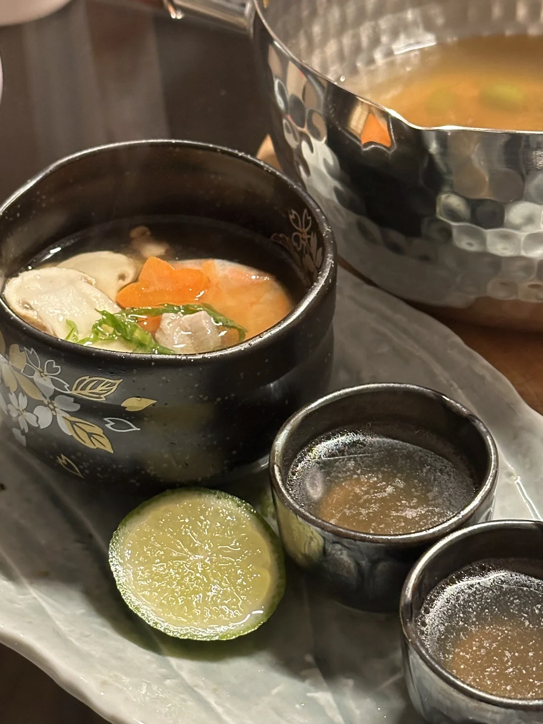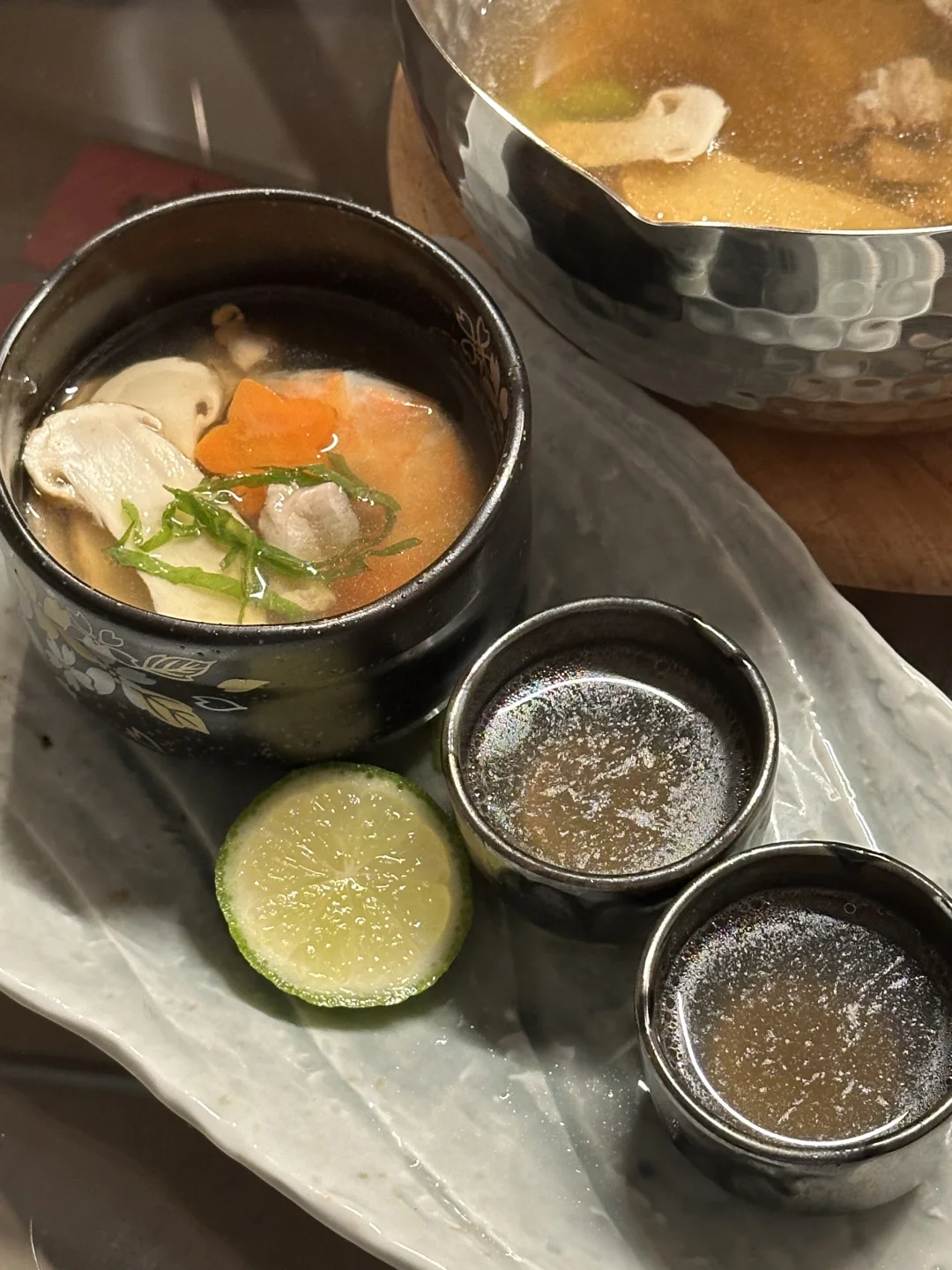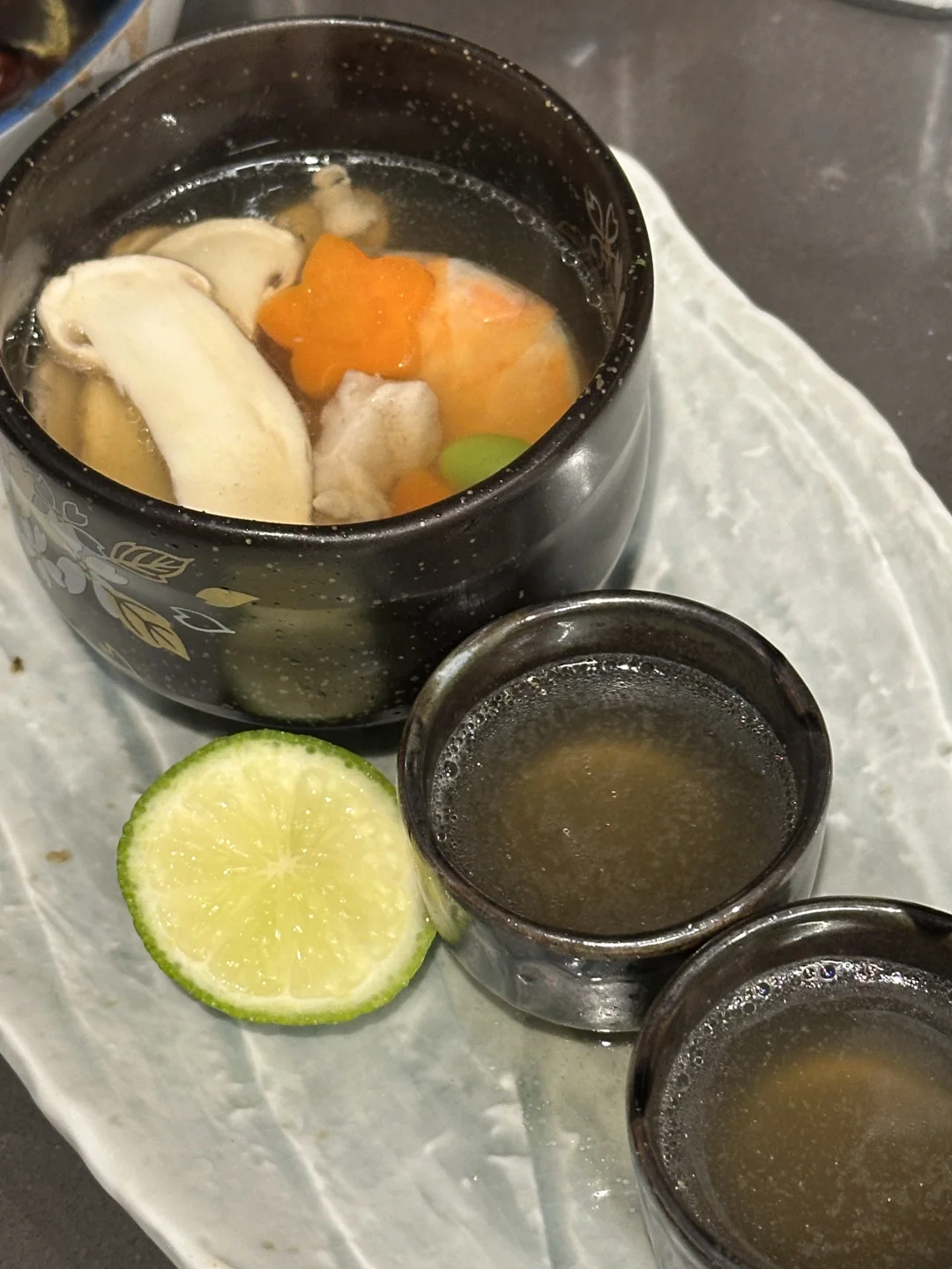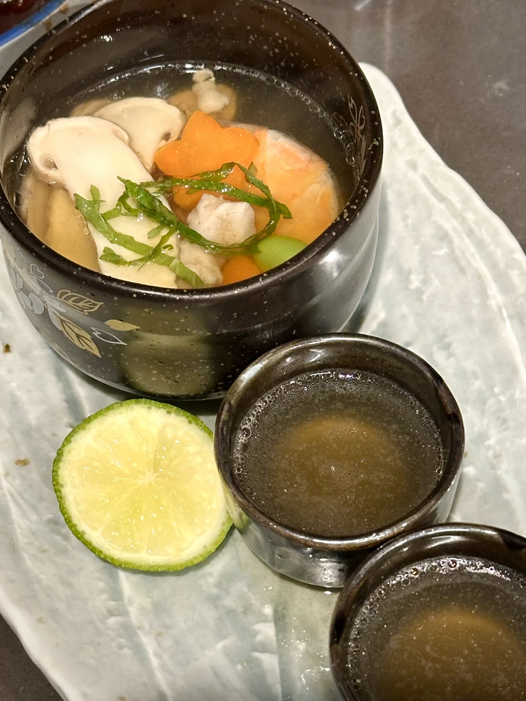 就是日料店里那个味儿!温润鲜醇的高汤底,融合了大虾和鸡肉的鲜美,当季的松茸带来独特的清香。别忘了再来挤一点点青柠汁,柑橘香会让风味再上一个层次。