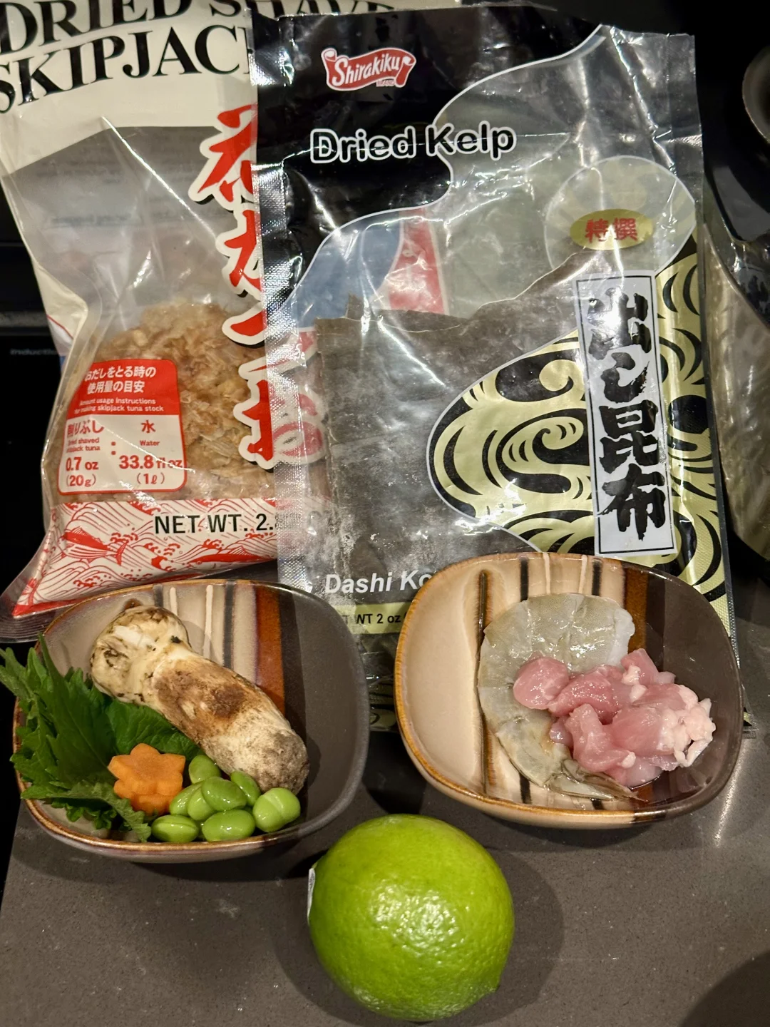 日式高汤:昆布一张,柴鱼片一把,干贝(可选),生抽少量,盐少许