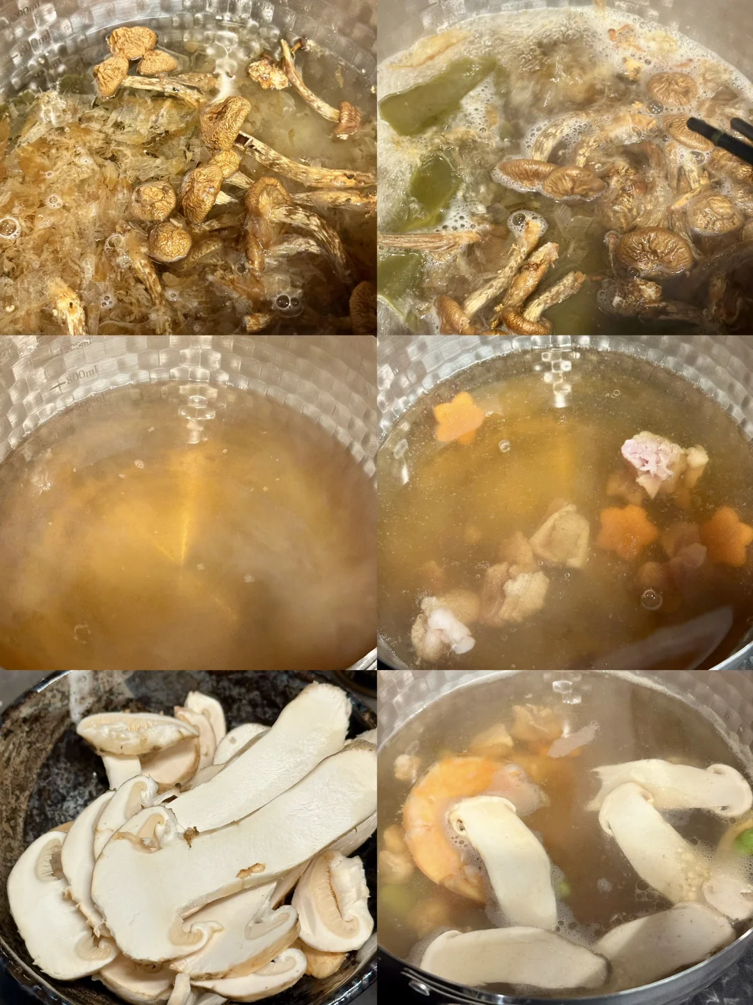 日式高汤先下鸡腿肉,胡萝卜和毛豆煮五分钟,再加入虾仁煮两分钟,最后加松茸煮一分钟,就完成了;