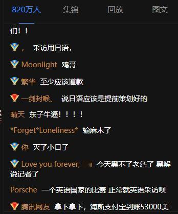 周玲安采访八村垒用日语引热议! 人八村垒是不会英语吗?在这么敏感的时候,主动用日语去采访他? 弹幕上一片骂声,全是严查!!! 企鹅是真不长记性啊,前不久的王者比赛后湾湾冠军的发言就惹了众怒了......