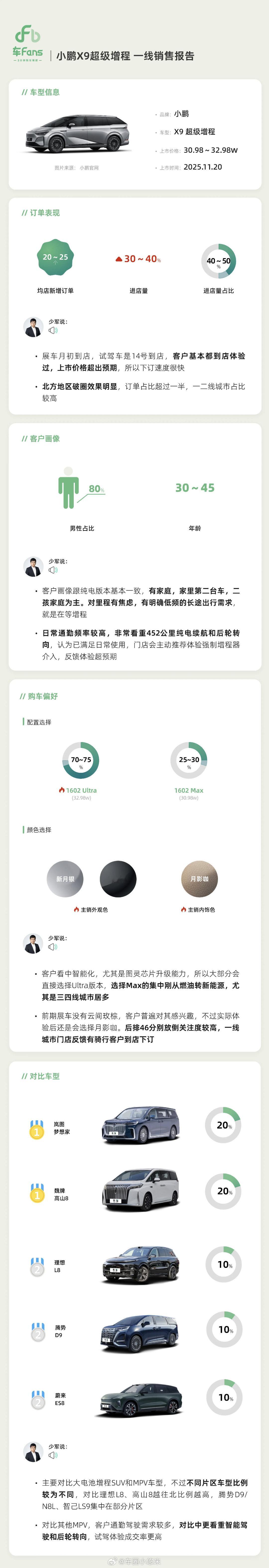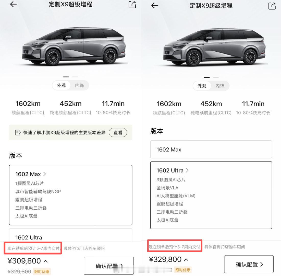 小鹏高管曝X9超级增程北方多地订单翻倍 小鹏X9超级增程真的卖爆了!11月20日上市后,1小时即打破X9历史全天大定纪录。72小时内全国均店新增订单20-25台,进店量占比达40-50%,较此前大涨30-40%。北方市场表现尤为抢眼,全国订单占比首次突破50%。在北方重点地区,哈尔滨、石家庄、长春等城市订单分别暴涨363%、643%、200%,1602km超长续航、冰雪稳行系统、后轮转向精准解决北方用户的冬季出行痛点。值得关注的是,79%用户选择了32.98万元的1602 Ultra版。小鹏汽车APP显示,Max、Ultra版交付周期均已延至5-7周,小鹏汽车已推出“跨年购置税补贴”专项方案:12月31日前锁单用户,可享至高1.5万元购置税退坡补贴,订单有望进一步增长。